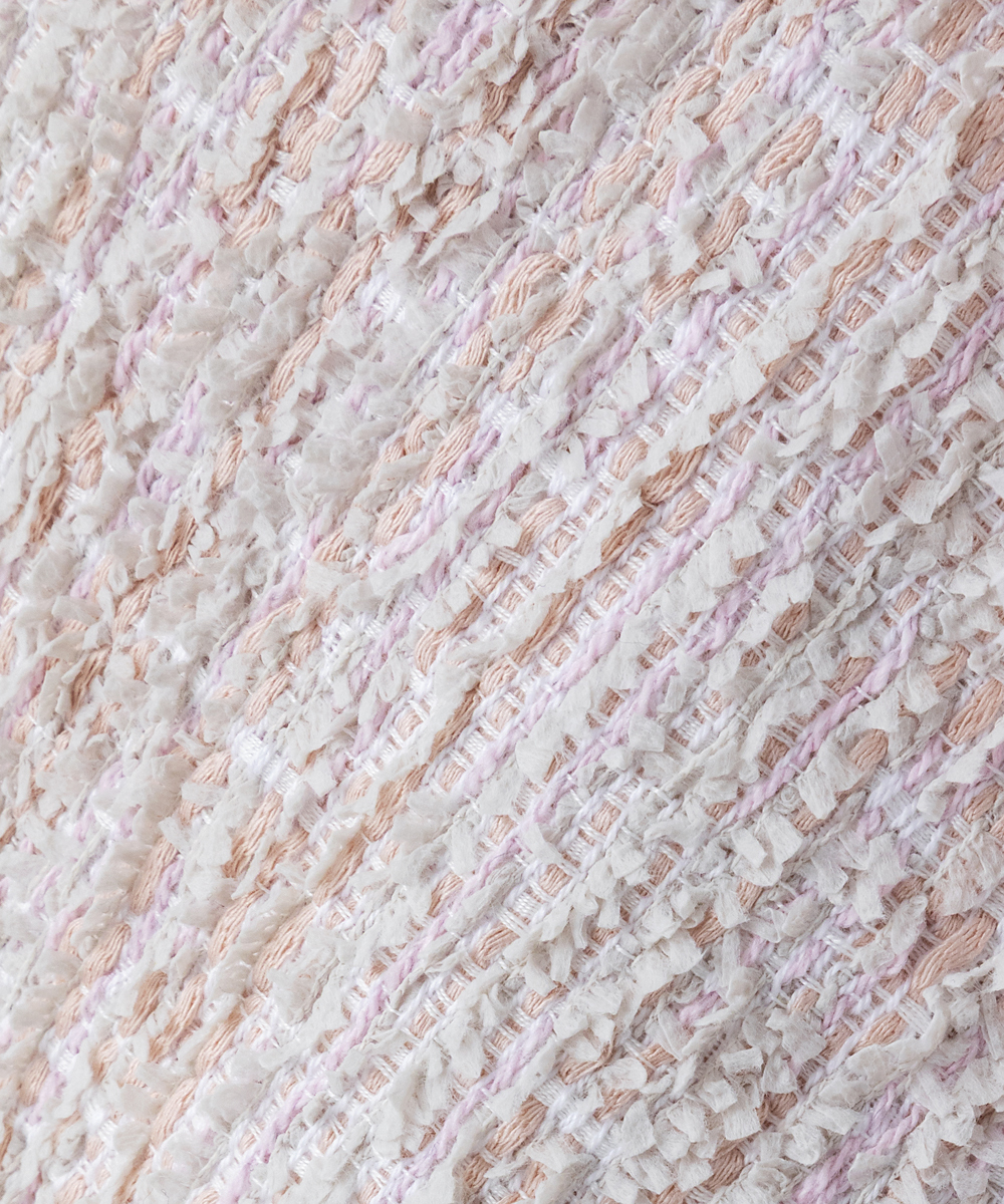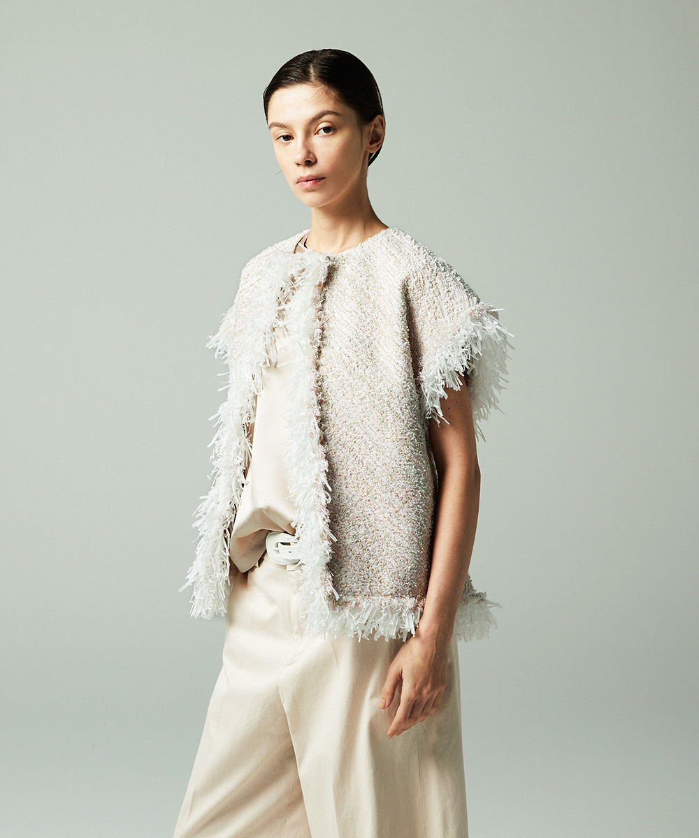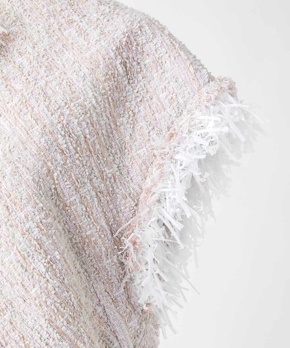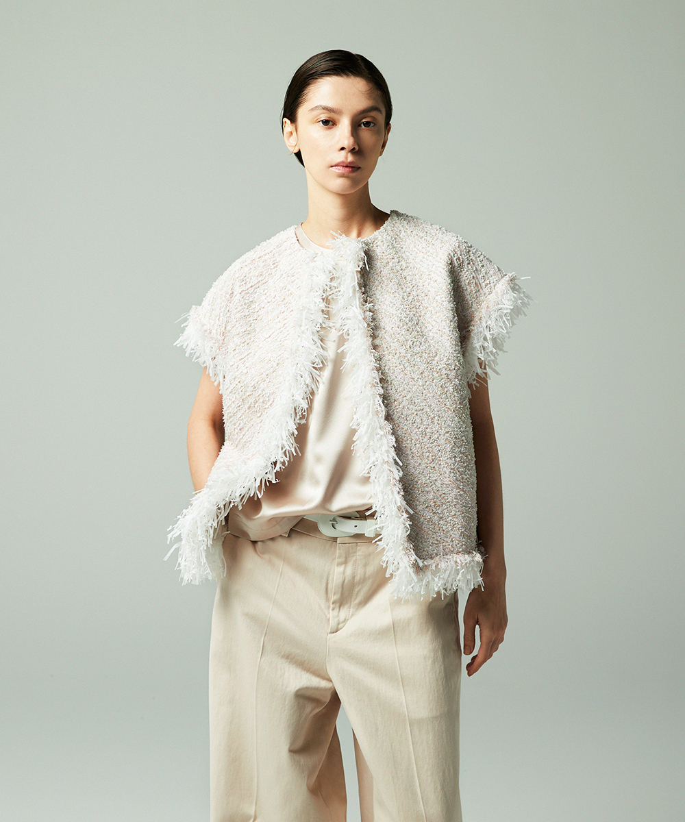 < EAUVIRE EXCLUSIVE >ペーパータッチの糸を使用したボリュームのあるフリンジを、アームホールやフロントから裾にあしらったジレ。生地をバイアスカットで仕立てることで柔らかいシルエットを生み出しています。1858年フランス・パリで創業。ツイード素材においての世界が認めるリーダー的役割を今も継続してるテキスタイルメーカーの素材です。短いリボン状の糸による凸凹感が軽く柔らかで優しい風合いを作り出し、ピンクとグレーの複雑なMIXカラーが甘さを抑えた肌なじみの良い仕上がりが特徴です。同素材のシリーズで、ツイードフリンジジャケット[FGDYD01260]もご用意いたしております。※こちらの商品はラッピング不可アイテムです