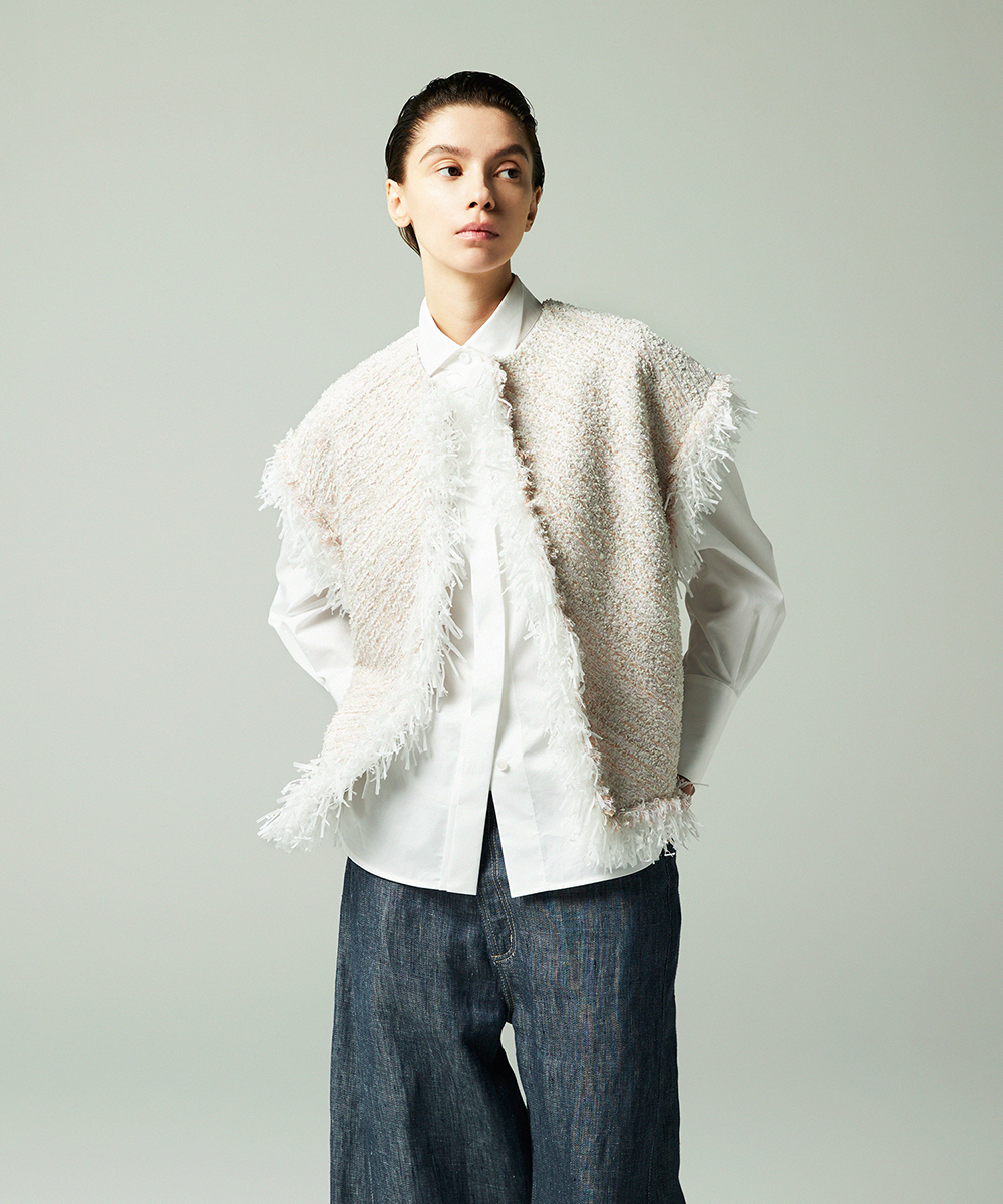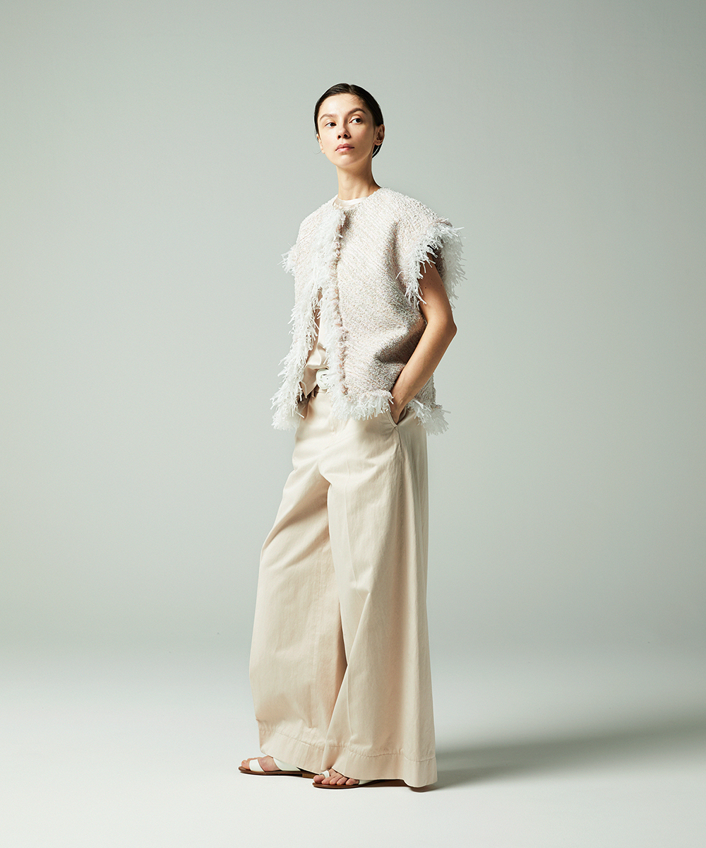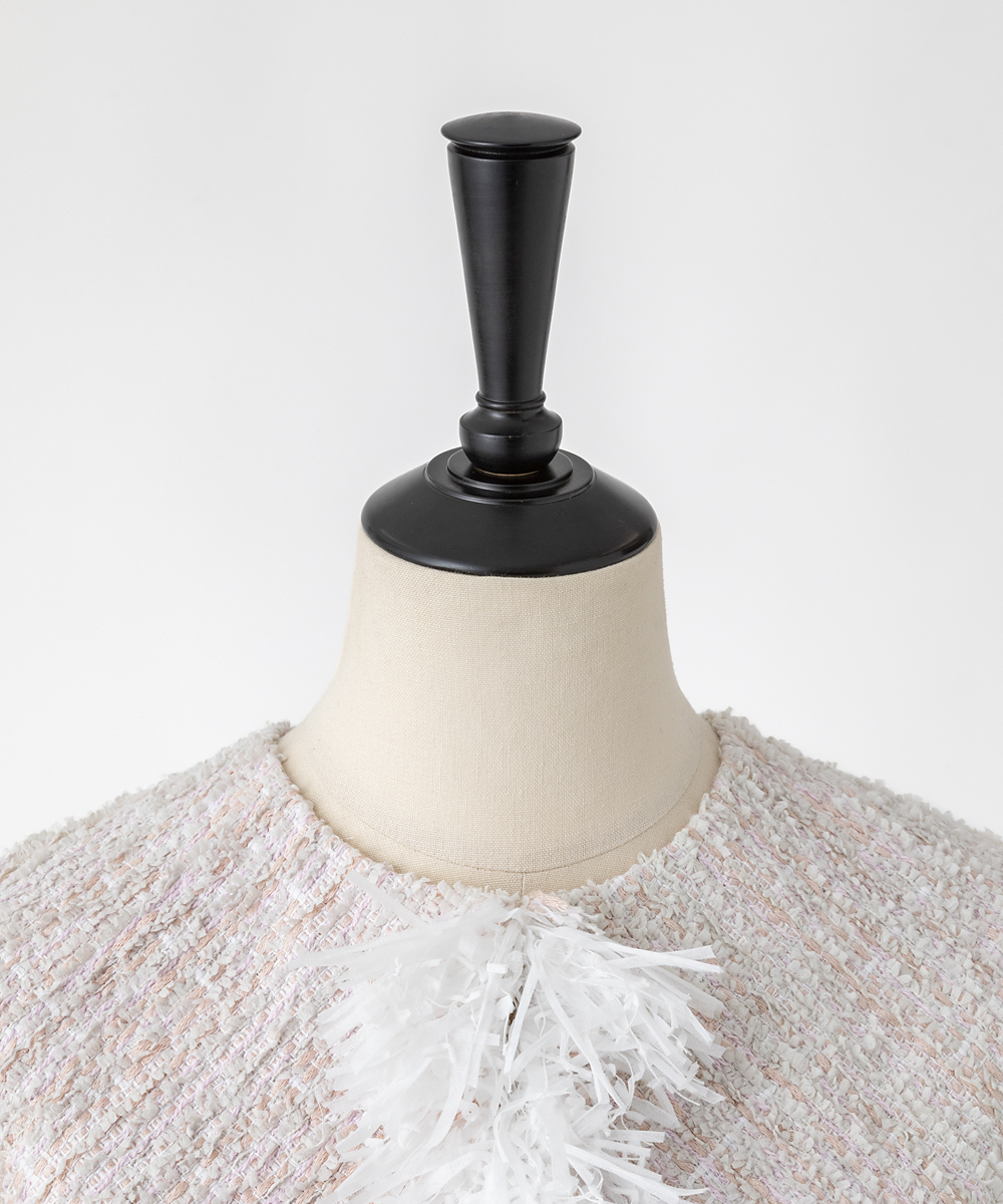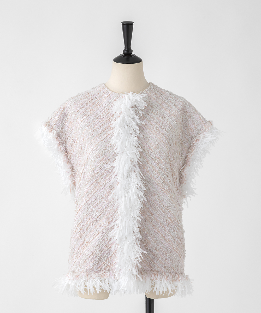 < EAUVIRE EXCLUSIVE >ペーパータッチの糸を使用したボリュームのあるフリンジを、アームホールやフロントから裾にあしらったジレ。生地をバイアスカットで仕立てることで柔らかいシルエットを生み出しています。1858年フランス・パリで創業。ツイード素材においての世界が認めるリーダー的役割を今も継続してるテキスタイルメーカーの素材です。短いリボン状の糸による凸凹感が軽く柔らかで優しい風合いを作り出し、ピンクとグレーの複雑なMIXカラーが甘さを抑えた肌なじみの良い仕上がりが特徴です。同素材のシリーズで、ツイードフリンジジャケット[FGDYD01260]もご用意いたしております。※こちらの商品はラッピング不可アイテムです