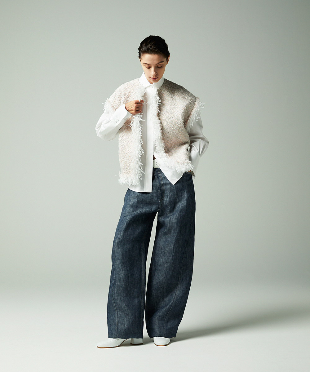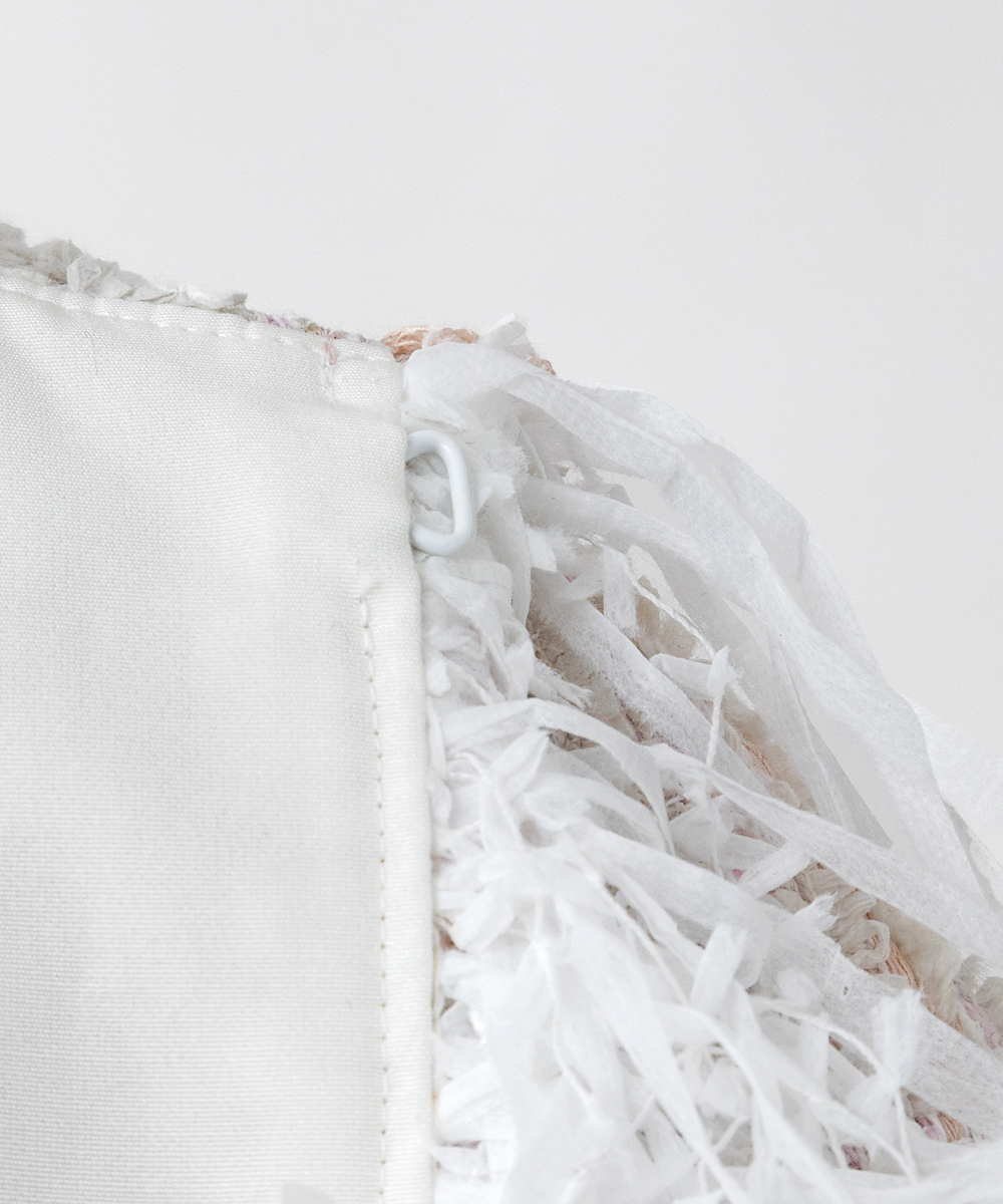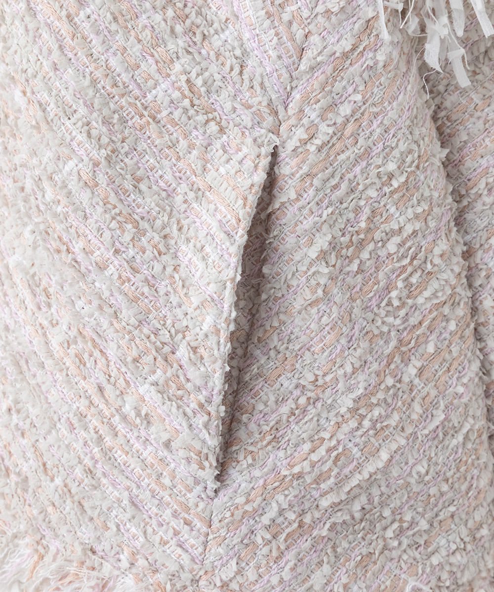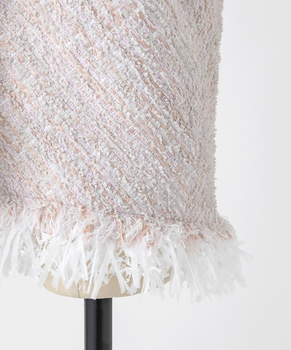 < EAUVIRE EXCLUSIVE >ペーパータッチの糸を使用したボリュームのあるフリンジを、アームホールやフロントから裾にあしらったジレ。生地をバイアスカットで仕立てることで柔らかいシルエットを生み出しています。1858年フランス・パリで創業。ツイード素材においての世界が認めるリーダー的役割を今も継続してるテキスタイルメーカーの素材です。短いリボン状の糸による凸凹感が軽く柔らかで優しい風合いを作り出し、ピンクとグレーの複雑なMIXカラーが甘さを抑えた肌なじみの良い仕上がりが特徴です。同素材のシリーズで、ツイードフリンジジャケット[FGDYD01260]もご用意いたしております。※こちらの商品はラッピング不可アイテムです