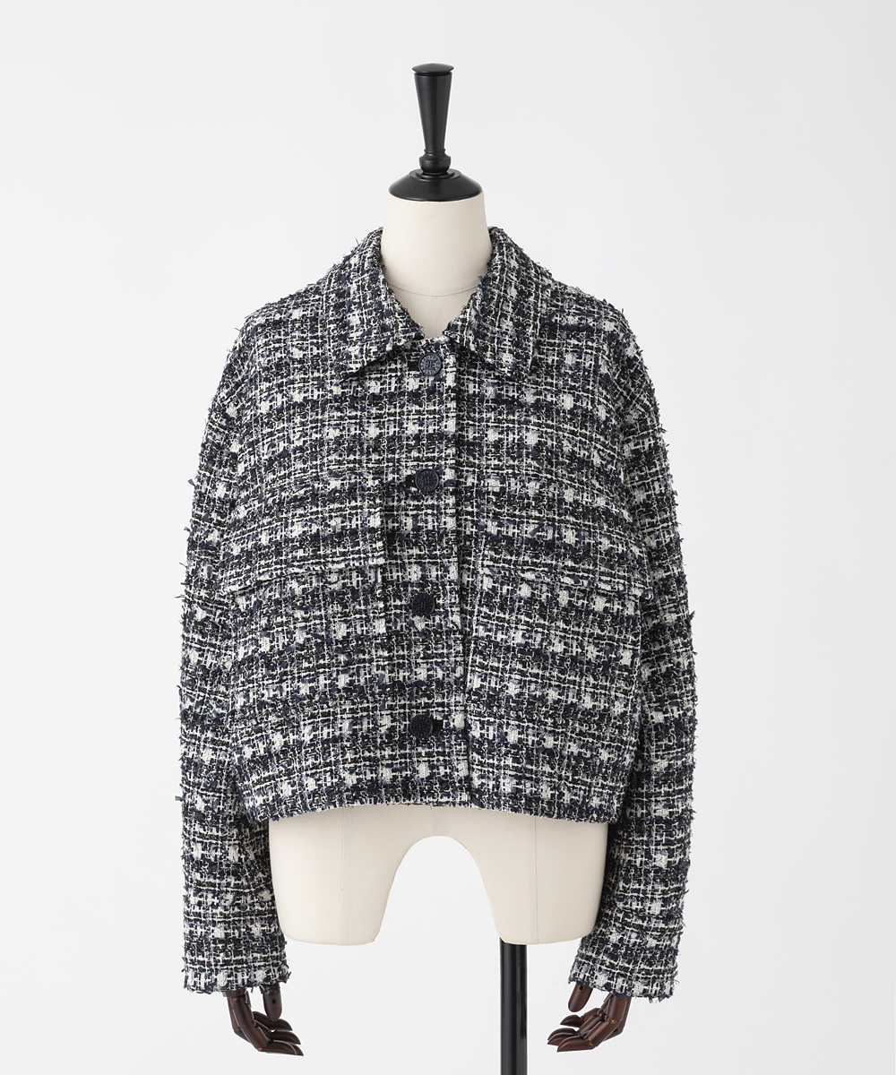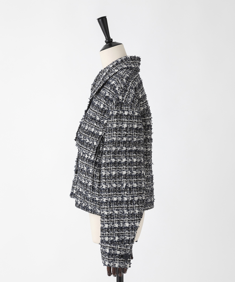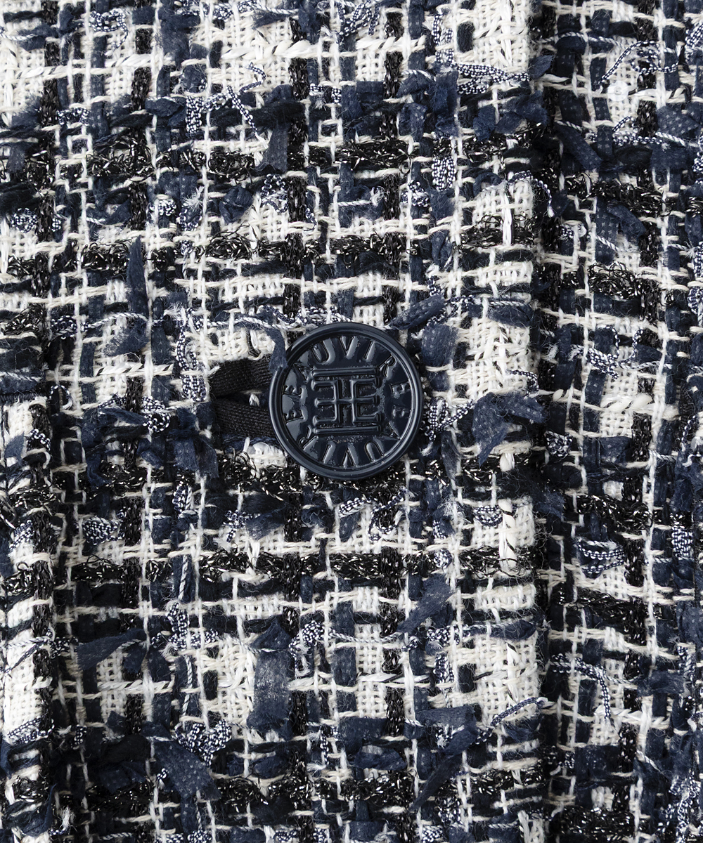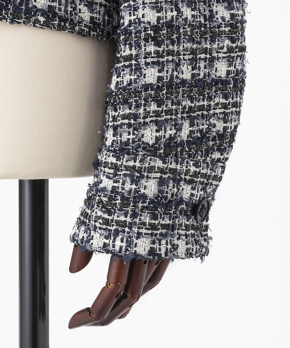 < EAUVIRE EXCLUSIVE >フラップ付きのポケットが特徴的なクロップトジャケット。ネイビー塗装したオリジナルデザインのコインボタンが特徴です。短めの丈感は同素材のパンツの他、ボリュームスカートにも合わせやすいバランスに仕上げています。13種類の意匠糸を組み合わせて作り上げたEAUVIREオリジナルの日本製ミックスツイード。それぞれ特徴のある糸をデニムを意識したネイビーカラーで染め上げて組み合わせ、昔ながらの手織りに近い織機を用いて表情を生み出したツイードは軽やかでソフトな素材感です。同素材ミックスツイードパンツ[FGLYD06120]とセットアップで着用いただけます。<br><br>---------------------<br><a href="https://www.eauvire.com/guide/delivery"><u><b>送料について >></b></u></a><br>1回のご注文合計金額が11,000円(税込)以上の場合、全国一律無料となります。<br><br><a href="https://www.eauvire.com/guide/return"><u><b>返品・交換について >></b></u></a><br>会員様に限りご購入いただいた商品は、一部を除き返品を承ります。交換をご希望の際は、お届けした商品をご返品後、再度ご注文ください。不良品の場合は、会員様に限らず返品・交換を承ります。<br><a href="https://www.eauvire.com/login">会員登録はこちら>></a><br><br><a href="https://www.eauvire.com/guide/request"><u><b>再入荷リクエストについて >></b></u></a><br>ご希望の商品の在庫がない場合に「再入荷リクエスト」をお申し込みいただくと、商品が再入荷した際にメールお知らせいたします。ご登録いただいた「再入荷リクエスト一覧」は<a href="https://www.eauvire.com/mypage"><u>マイページ</u></a>からご確認いただけます。<br><br><a href="https://www.eauvire.com/guide/wrapping"><u><b>ラッピングについて >></b></u></a><br>ギフト資材でラッピングした状態でご配送させていただく有料のラッピング 4,400円(税込)をご用意いたしております<br><br>※こちらの商品はラッピング不可アイテムです