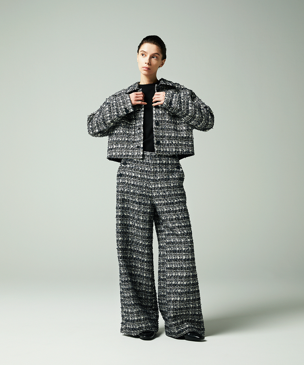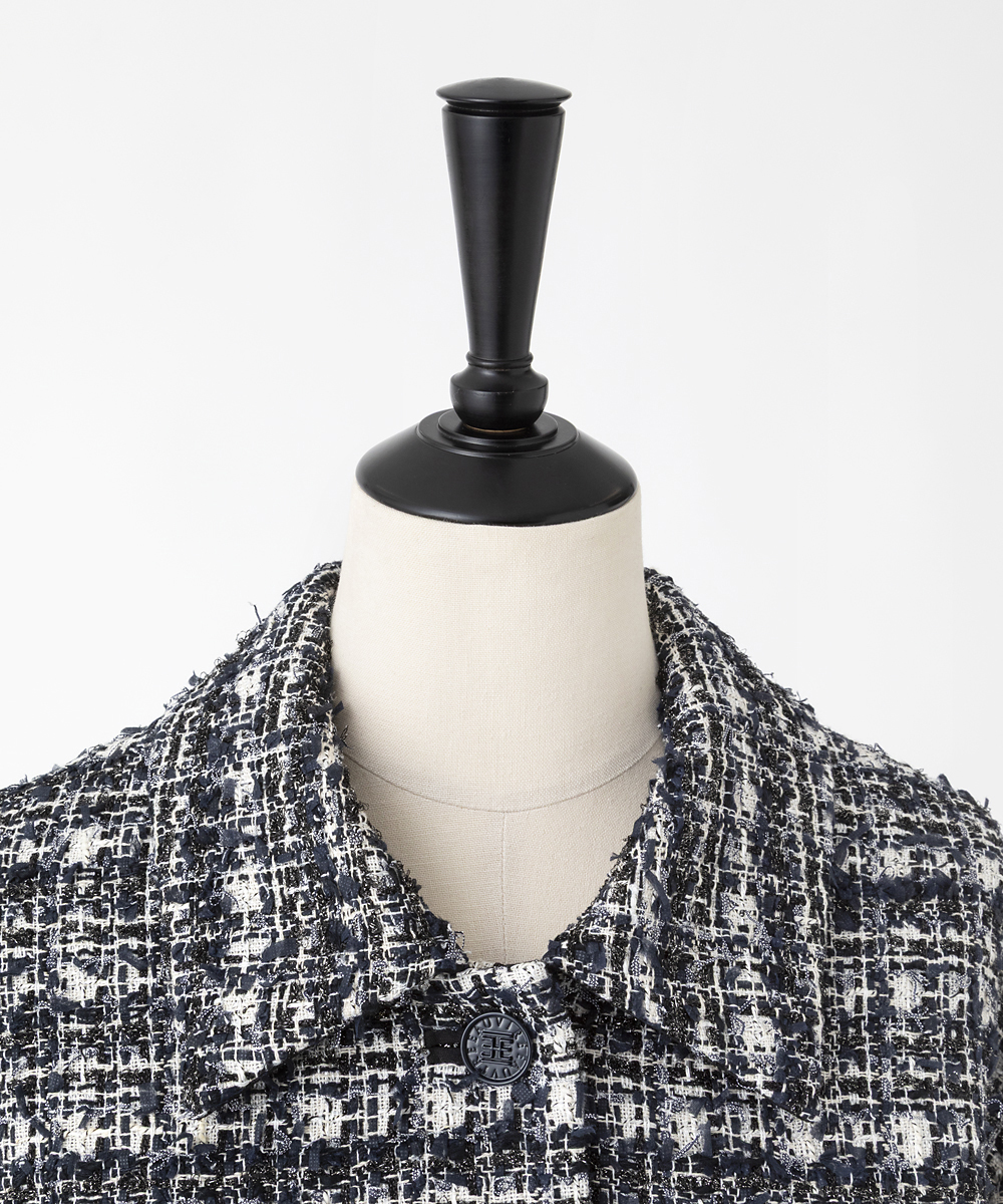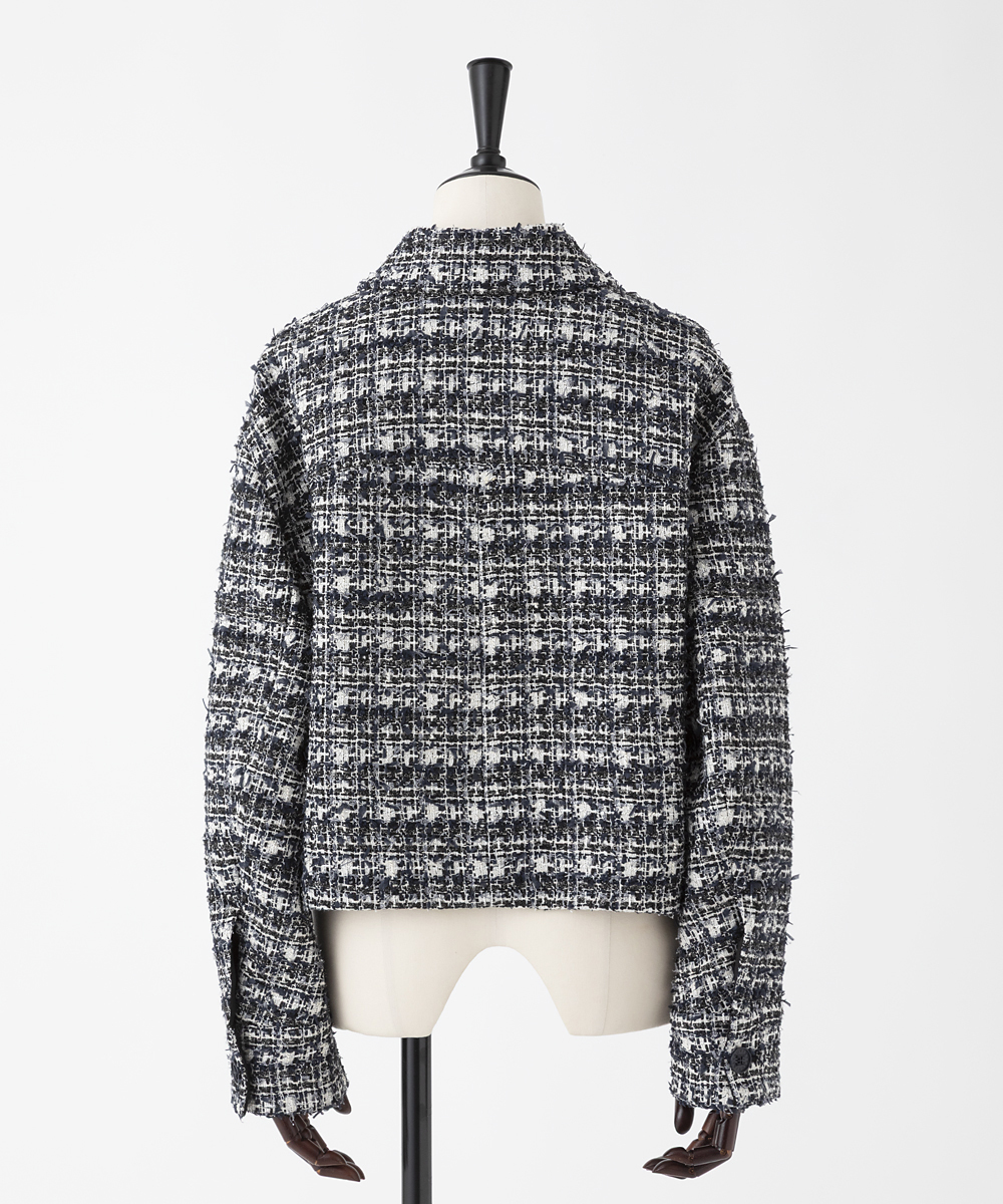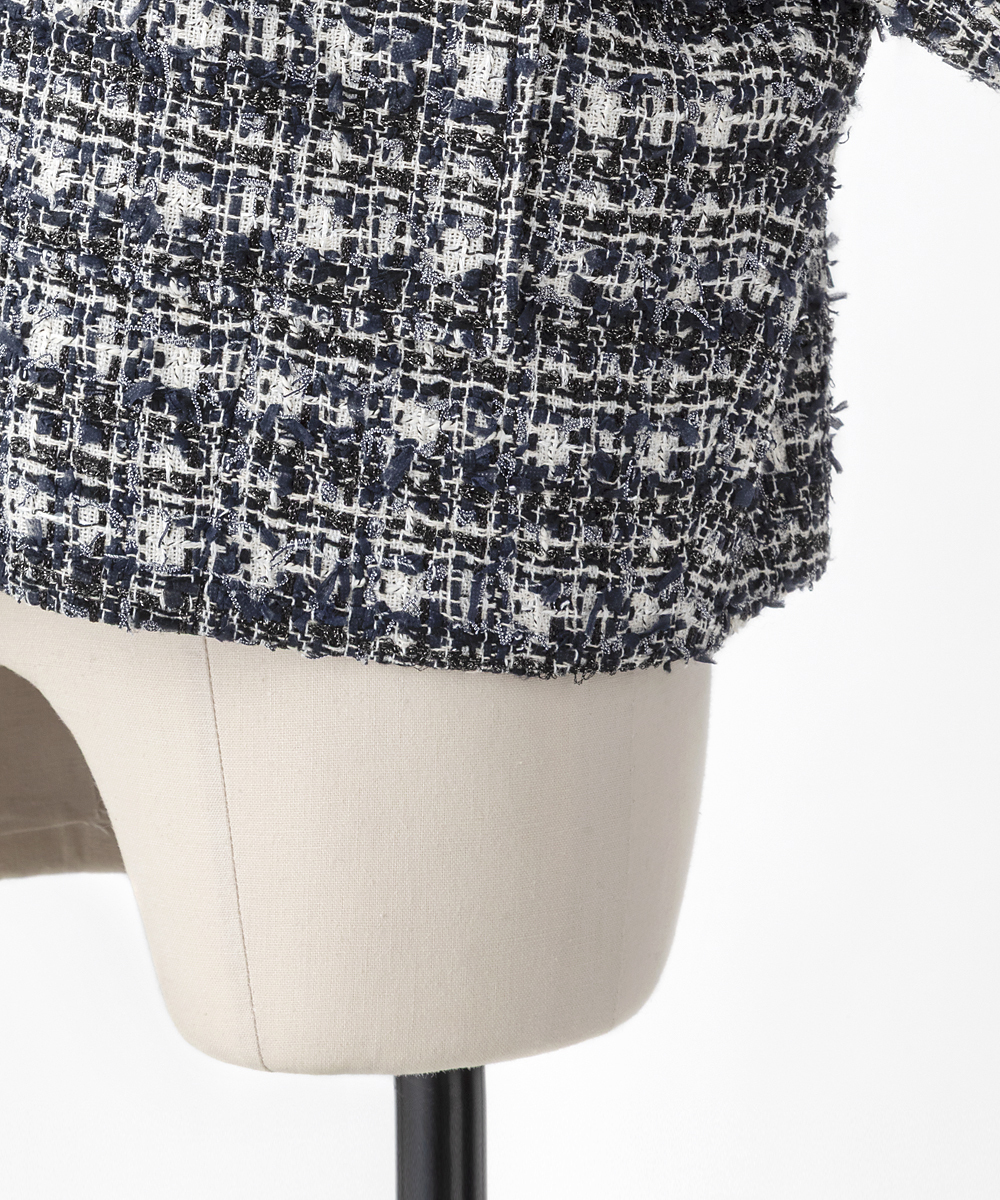 < EAUVIRE EXCLUSIVE >フラップ付きのポケットが特徴的なクロップトジャケット。ネイビー塗装したオリジナルデザインのコインボタンが特徴です。短めの丈感は同素材のパンツの他、ボリュームスカートにも合わせやすいバランスに仕上げています。13種類の意匠糸を組み合わせて作り上げたEAUVIREオリジナルの日本製ミックスツイード。それぞれ特徴のある糸をデニムを意識したネイビーカラーで染め上げて組み合わせ、昔ながらの手織りに近い織機を用いて表情を生み出したツイードは軽やかでソフトな素材感です。同素材ミックスツイードパンツ[FGLYD06120]とセットアップで着用いただけます。<br><br>---------------------<br><a href="https://www.eauvire.com/guide/delivery"><u><b>送料について >></b></u></a><br>1回のご注文合計金額が11,000円(税込)以上の場合、全国一律無料となります。<br><br><a href="https://www.eauvire.com/guide/return"><u><b>返品・交換について >></b></u></a><br>会員様に限りご購入いただいた商品は、一部を除き返品を承ります。交換をご希望の際は、お届けした商品をご返品後、再度ご注文ください。不良品の場合は、会員様に限らず返品・交換を承ります。<br><a href="https://www.eauvire.com/login">会員登録はこちら>></a><br><br><a href="https://www.eauvire.com/guide/request"><u><b>再入荷リクエストについて >></b></u></a><br>ご希望の商品の在庫がない場合に「再入荷リクエスト」をお申し込みいただくと、商品が再入荷した際にメールお知らせいたします。ご登録いただいた「再入荷リクエスト一覧」は<a href="https://www.eauvire.com/mypage"><u>マイページ</u></a>からご確認いただけます。<br><br><a href="https://www.eauvire.com/guide/wrapping"><u><b>ラッピングについて >></b></u></a><br>ギフト資材でラッピングした状態でご配送させていただく有料のラッピング 4,400円(税込)をご用意いたしております<br><br>※こちらの商品はラッピング不可アイテムです