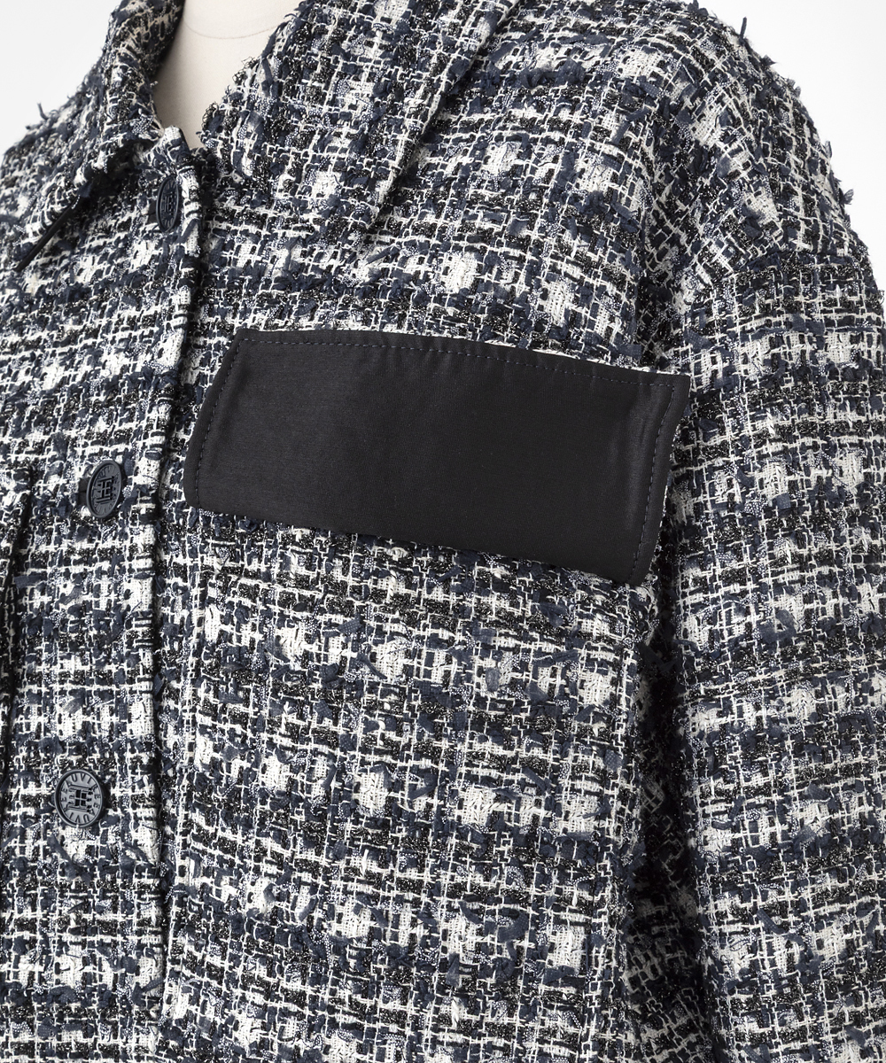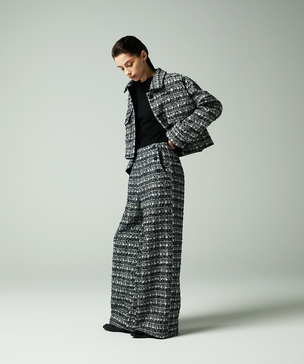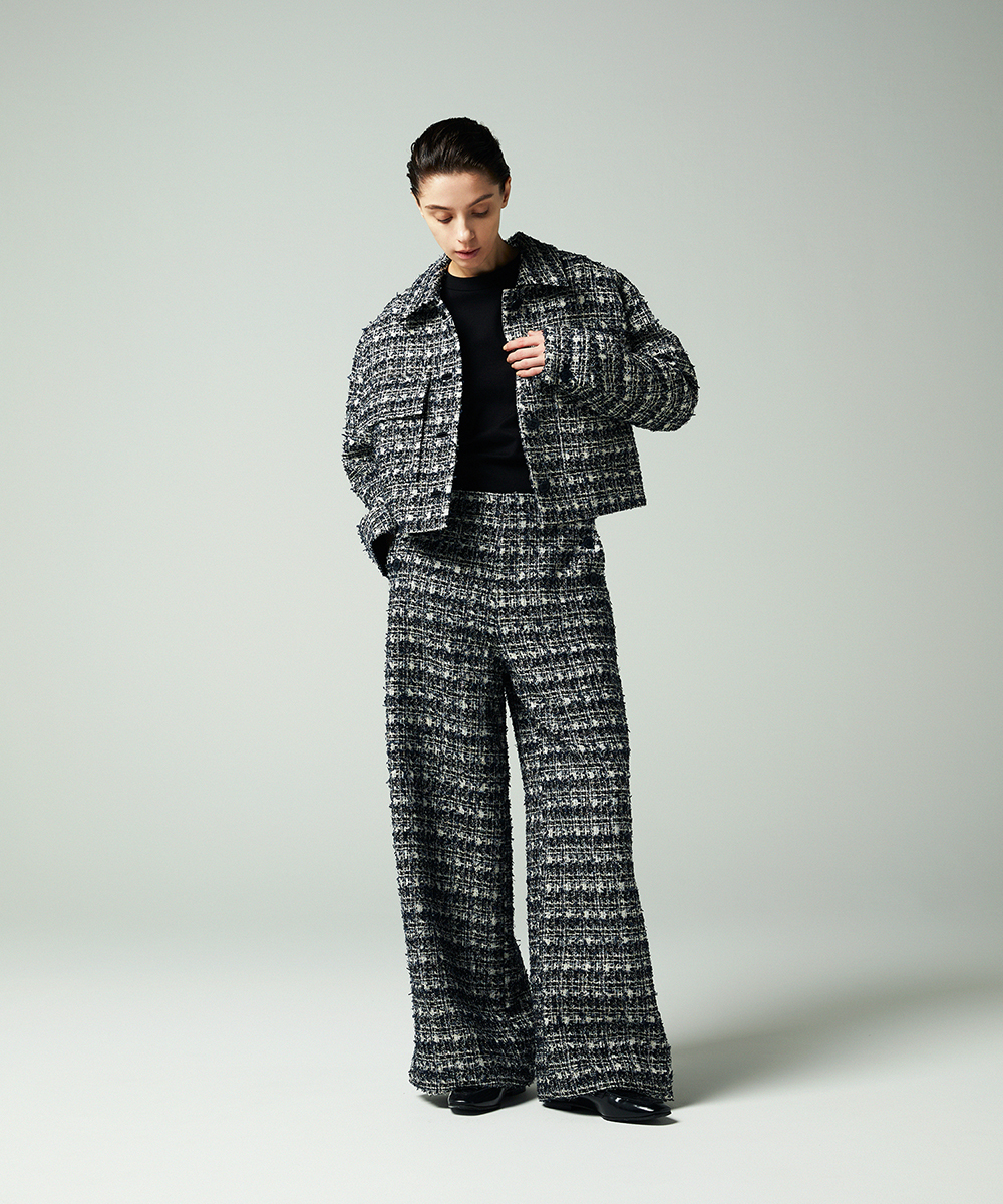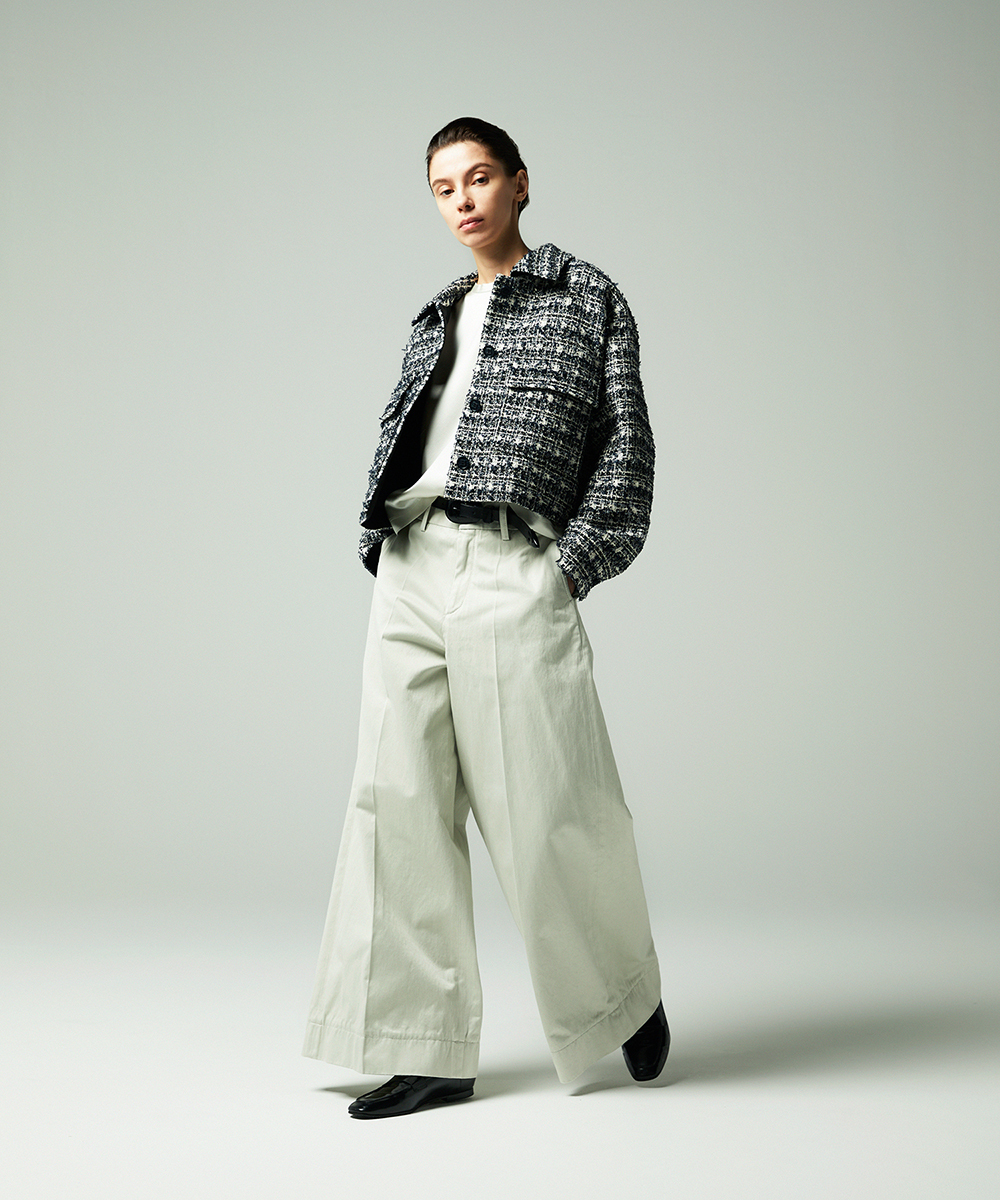 < EAUVIRE EXCLUSIVE >フラップ付きのポケットが特徴的なクロップトジャケット。ネイビー塗装したオリジナルデザインのコインボタンが特徴です。短めの丈感は同素材のパンツの他、ボリュームスカートにも合わせやすいバランスに仕上げています。13種類の意匠糸を組み合わせて作り上げたEAUVIREオリジナルの日本製ミックスツイード。それぞれ特徴のある糸をデニムを意識したネイビーカラーで染め上げて組み合わせ、昔ながらの手織りに近い織機を用いて表情を生み出したツイードは軽やかでソフトな素材感です。同素材ミックスツイードパンツ[FGLYD06120]とセットアップで着用いただけます。<br><br>---------------------<br><a href="https://www.eauvire.com/guide/delivery"><u><b>送料について >></b></u></a><br>1回のご注文合計金額が11,000円(税込)以上の場合、全国一律無料となります。<br><br><a href="https://www.eauvire.com/guide/return"><u><b>返品・交換について >></b></u></a><br>会員様に限りご購入いただいた商品は、一部を除き返品を承ります。交換をご希望の際は、お届けした商品をご返品後、再度ご注文ください。不良品の場合は、会員様に限らず返品・交換を承ります。<br><a href="https://www.eauvire.com/login">会員登録はこちら>></a><br><br><a href="https://www.eauvire.com/guide/request"><u><b>再入荷リクエストについて >></b></u></a><br>ご希望の商品の在庫がない場合に「再入荷リクエスト」をお申し込みいただくと、商品が再入荷した際にメールお知らせいたします。ご登録いただいた「再入荷リクエスト一覧」は<a href="https://www.eauvire.com/mypage"><u>マイページ</u></a>からご確認いただけます。<br><br><a href="https://www.eauvire.com/guide/wrapping"><u><b>ラッピングについて >></b></u></a><br>ギフト資材でラッピングした状態でご配送させていただく有料のラッピング 4,400円(税込)をご用意いたしております<br><br>※こちらの商品はラッピング不可アイテムです