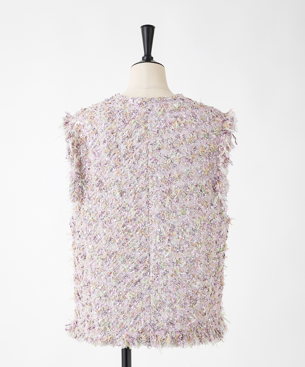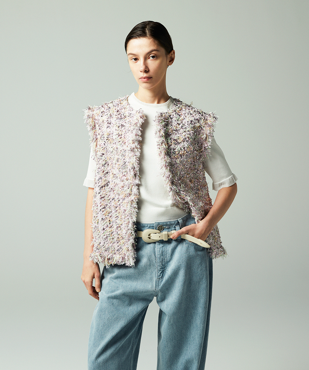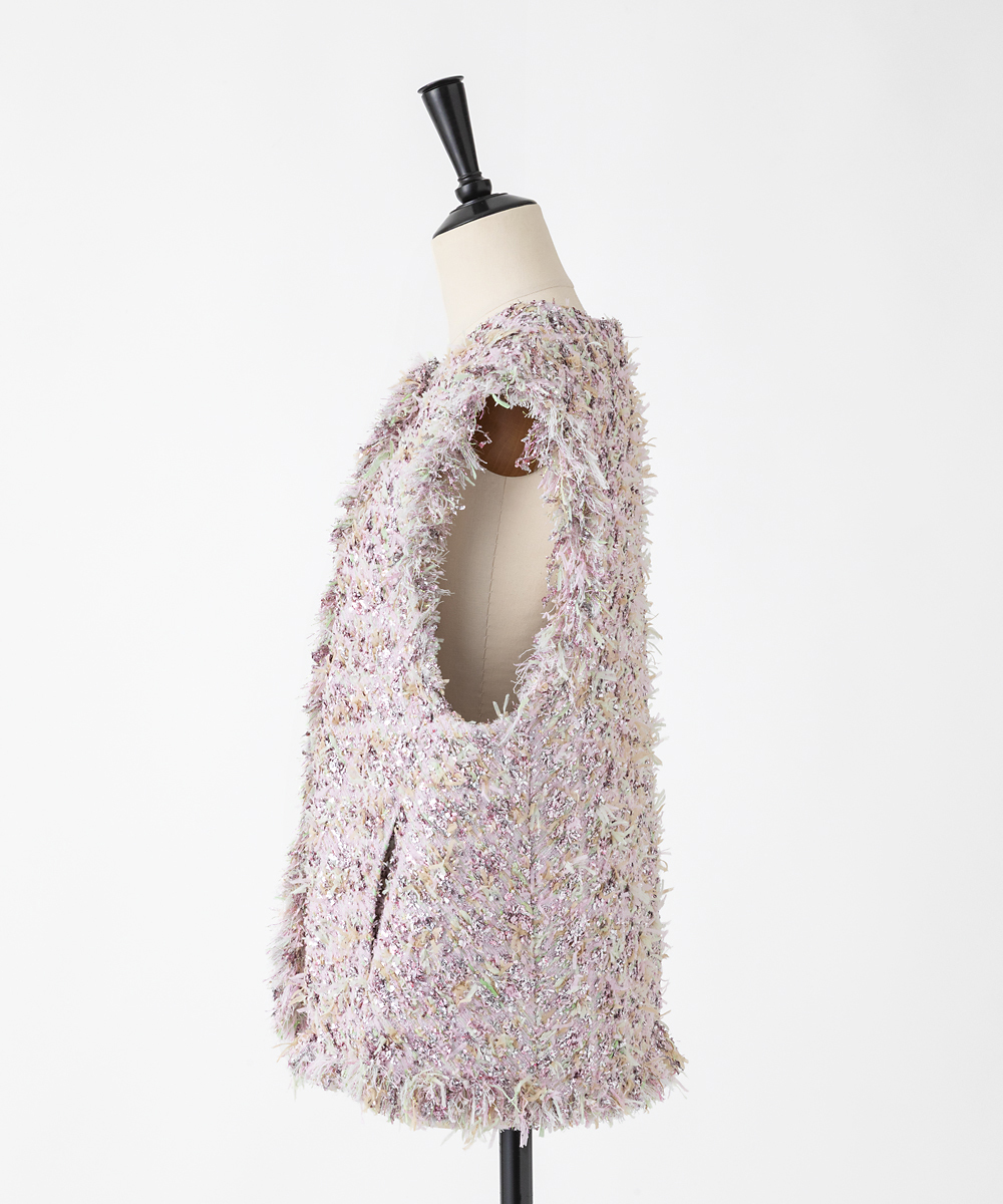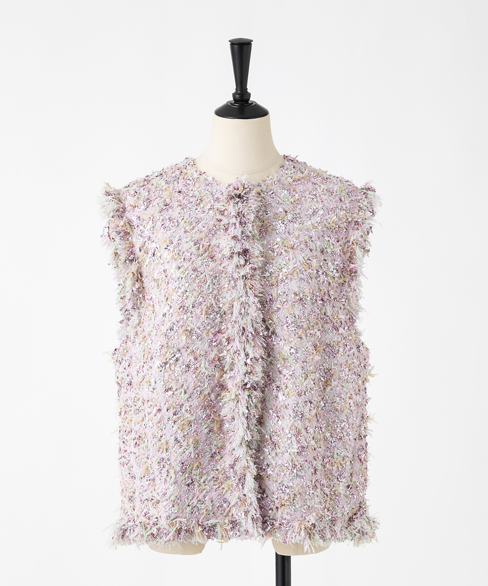 < EAUVIRE EXCLUSIVE >フロントから裾、アームホールを身生地をほぐし、ボリュームを持たせたフリンジ状に仕上げたツイードジレ。パリで創業したツイード素材においての世界が認めるリーダー的役割を今も継続してるテキスタイルメーカーの素材を使用。リボン調の柔らかな糸や華やかな輝きを作る糸など、様々な糸でジャカードに織り上げたスペシャルなサマーツイード。他にはない高級感とインパクトを持つ華やかな素材です。同素材のシリーズで、リボンツイードジレ[FGJYD12230]、リボンツイードスカート[FGHYD12130]、ショルダーストラップバッグ[FG5GD02500]、ミニトートバッグ[FG5GD01480]をご用意いたしております。<br><br>---------------------<br><a href="https://www.eauvire.com/guide/delivery"><u><b>送料について >></b></u></a><br>1回のご注文合計金額が11,000円(税込)以上の場合、全国一律無料となります。<br><br><a href="https://www.eauvire.com/guide/return"><u><b>返品・交換について >></b></u></a><br>会員様に限りご購入いただいた商品は、一部を除き返品を承ります。交換をご希望の際は、お届けした商品をご返品後、再度ご注文ください。不良品の場合は、会員様に限らず返品・交換を承ります。<br><a href="https://www.eauvire.com/login">会員登録はこちら>></a><br><br><a href="https://www.eauvire.com/guide/request"><u><b>再入荷リクエストについて >></b></u></a><br>ご希望の商品の在庫がない場合に「再入荷リクエスト」をお申し込みいただくと、商品が再入荷した際にメールお知らせいたします。ご登録いただいた「再入荷リクエスト一覧」は<a href="https://www.eauvire.com/mypage"><u>マイページ</u></a>からご確認いただけます。<br><br><a href="https://www.eauvire.com/guide/wrapping"><u><b>ラッピングについて >></b></u></a><br>ギフト資材でラッピングした状態でご配送させていただく有料のラッピング 4,400円(税込)をご用意いたしております<br><br>※こちらの商品はラッピング不可アイテムです
