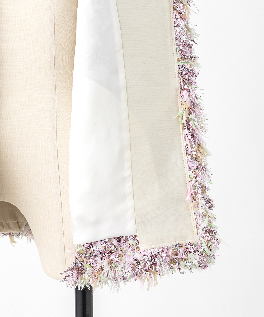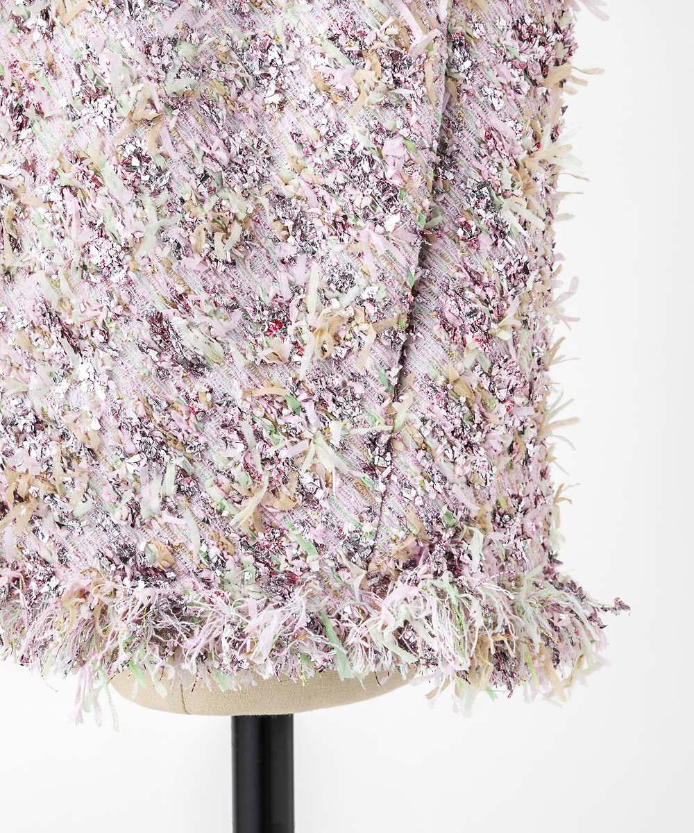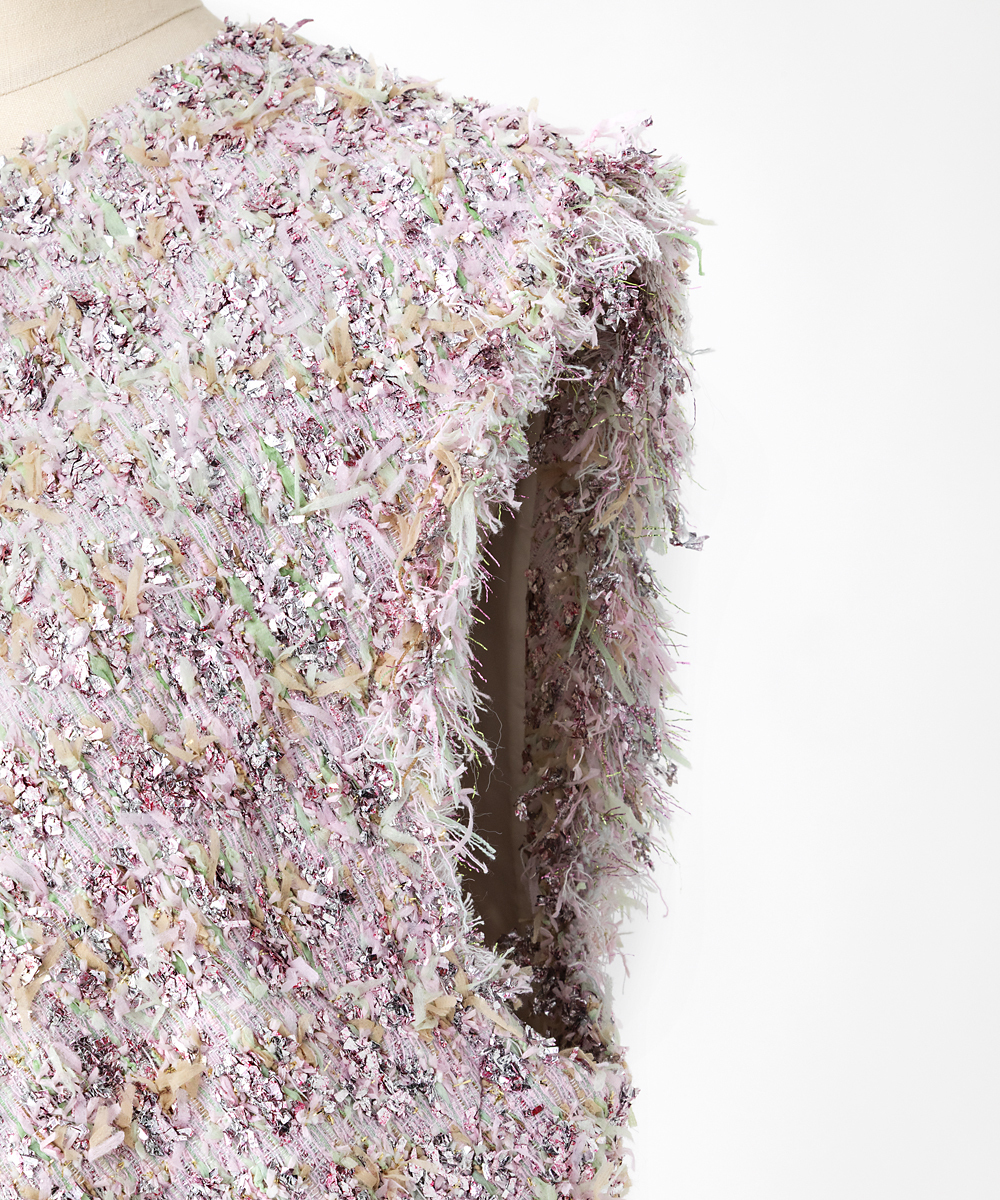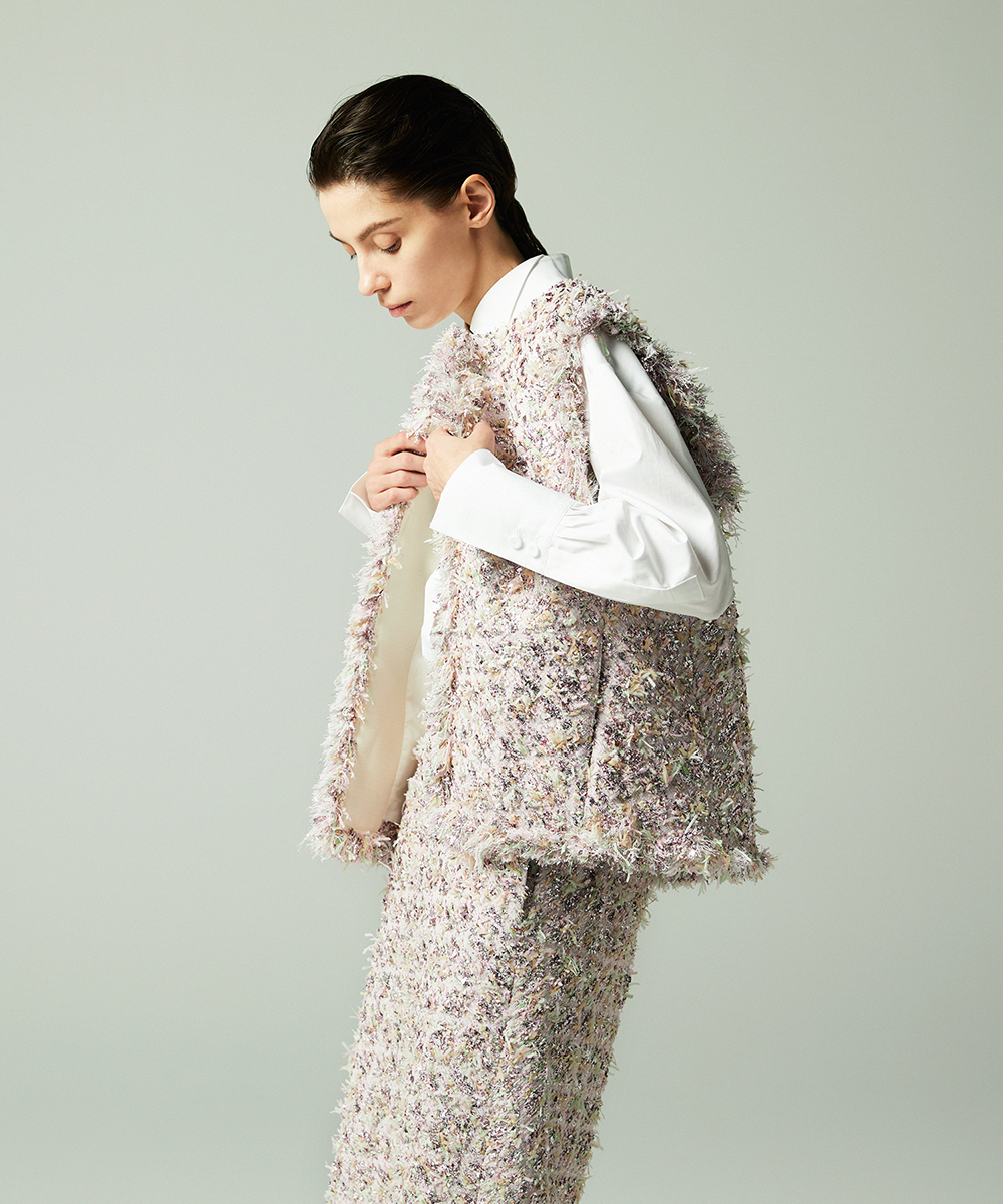 < EAUVIRE EXCLUSIVE >フロントから裾、アームホールを身生地をほぐし、ボリュームを持たせたフリンジ状に仕上げたツイードジレ。パリで創業したツイード素材においての世界が認めるリーダー的役割を今も継続してるテキスタイルメーカーの素材を使用。リボン調の柔らかな糸や華やかな輝きを作る糸など、様々な糸でジャカードに織り上げたスペシャルなサマーツイード。他にはない高級感とインパクトを持つ華やかな素材です。同素材のシリーズで、リボンツイードジレ[FGJYD12230]、リボンツイードスカート[FGHYD12130]、ショルダーストラップバッグ[FG5GD02500]、ミニトートバッグ[FG5GD01480]をご用意いたしております。<br><br>---------------------<br><a href="https://www.eauvire.com/guide/delivery"><u><b>送料について >></b></u></a><br>1回のご注文合計金額が11,000円(税込)以上の場合、全国一律無料となります。<br><br><a href="https://www.eauvire.com/guide/return"><u><b>返品・交換について >></b></u></a><br>会員様に限りご購入いただいた商品は、一部を除き返品を承ります。交換をご希望の際は、お届けした商品をご返品後、再度ご注文ください。不良品の場合は、会員様に限らず返品・交換を承ります。<br><a href="https://www.eauvire.com/login">会員登録はこちら>></a><br><br><a href="https://www.eauvire.com/guide/request"><u><b>再入荷リクエストについて >></b></u></a><br>ご希望の商品の在庫がない場合に「再入荷リクエスト」をお申し込みいただくと、商品が再入荷した際にメールお知らせいたします。ご登録いただいた「再入荷リクエスト一覧」は<a href="https://www.eauvire.com/mypage"><u>マイページ</u></a>からご確認いただけます。<br><br><a href="https://www.eauvire.com/guide/wrapping"><u><b>ラッピングについて >></b></u></a><br>ギフト資材でラッピングした状態でご配送させていただく有料のラッピング 4,400円(税込)をご用意いたしております<br><br>※こちらの商品はラッピング不可アイテムです