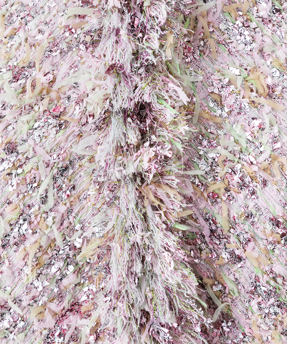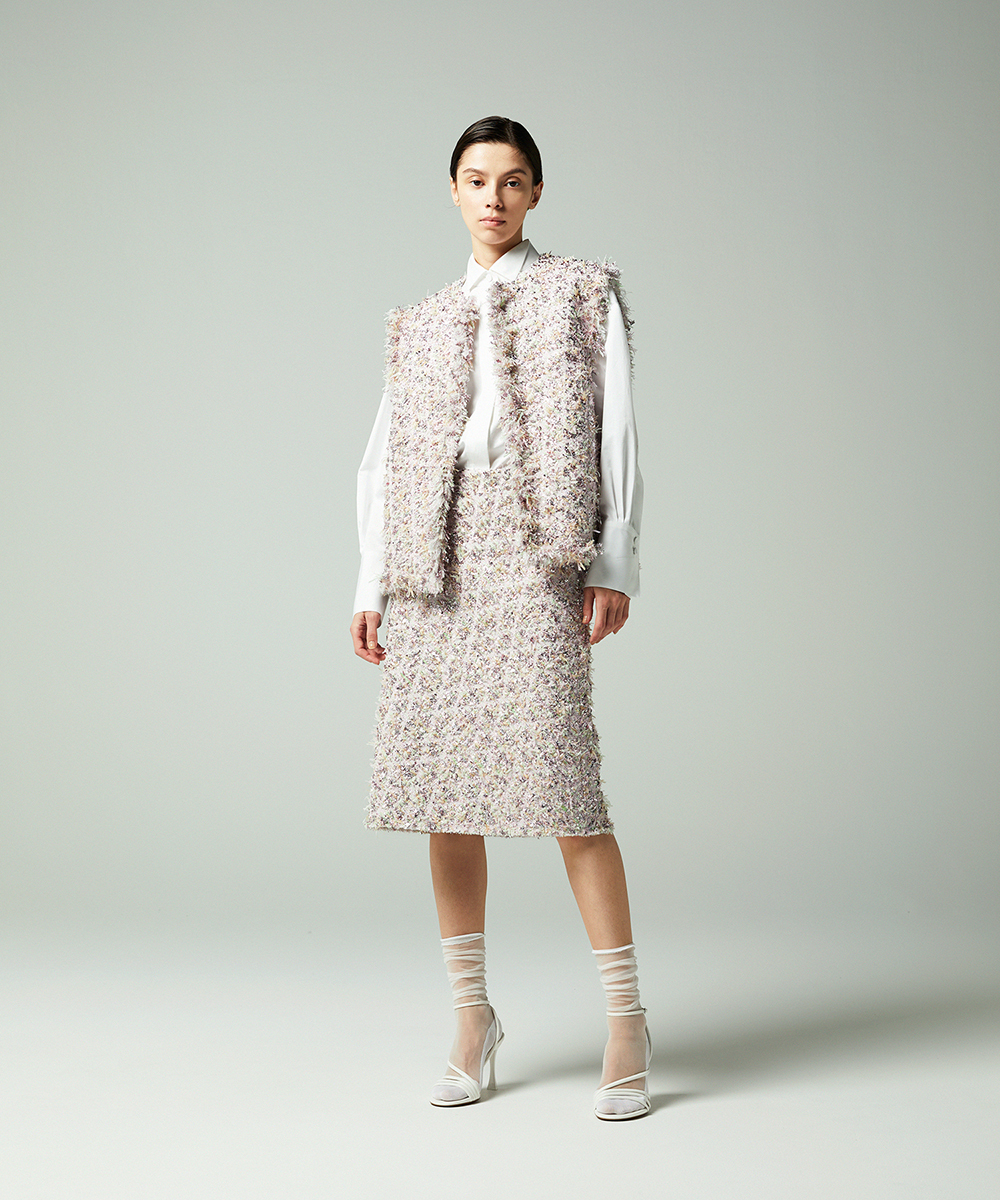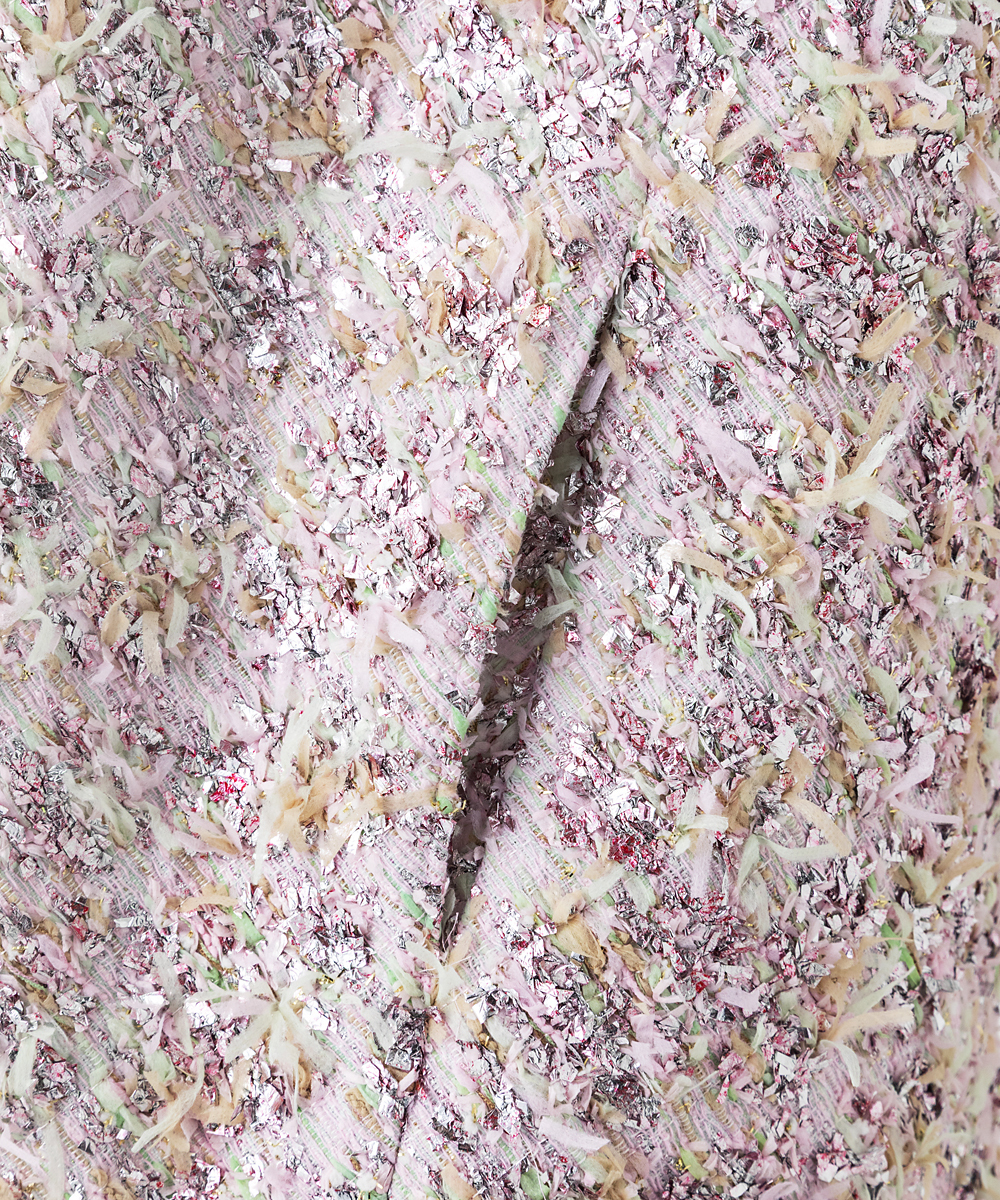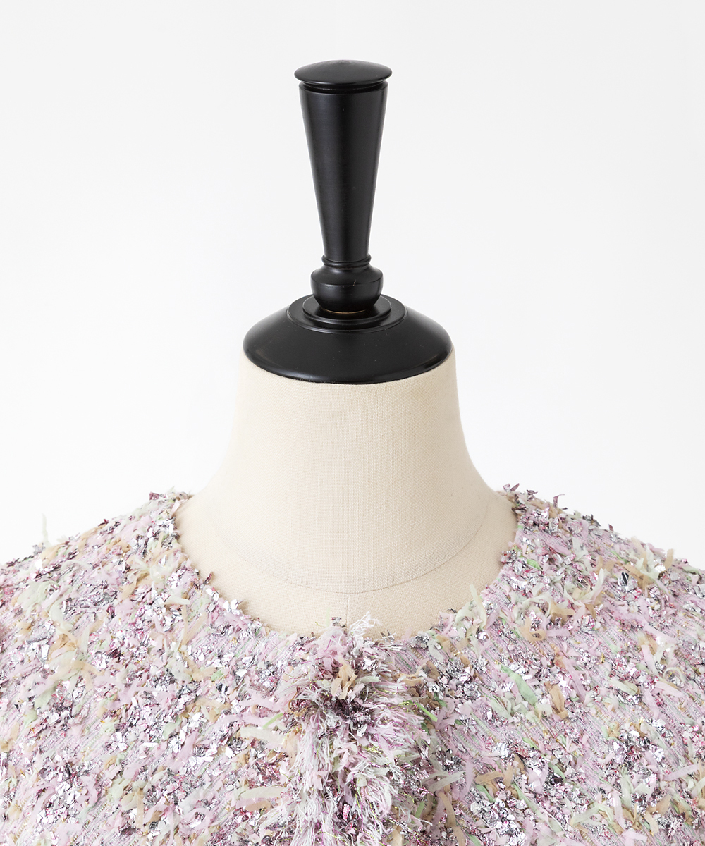< EAUVIRE EXCLUSIVE >フロントから裾、アームホールを身生地をほぐし、ボリュームを持たせたフリンジ状に仕上げたツイードジレ。パリで創業したツイード素材においての世界が認めるリーダー的役割を今も継続してるテキスタイルメーカーの素材を使用。リボン調の柔らかな糸や華やかな輝きを作る糸など、様々な糸でジャカードに織り上げたスペシャルなサマーツイード。他にはない高級感とインパクトを持つ華やかな素材です。同素材のシリーズで、リボンツイードジレ[FGJYD12230]、リボンツイードスカート[FGHYD12130]、ショルダーストラップバッグ[FG5GD02500]、ミニトートバッグ[FG5GD01480]をご用意いたしております。<br><br>---------------------<br><a href="https://www.eauvire.com/guide/delivery"><u><b>送料について >></b></u></a><br>1回のご注文合計金額が11,000円(税込)以上の場合、全国一律無料となります。<br><br><a href="https://www.eauvire.com/guide/return"><u><b>返品・交換について >></b></u></a><br>会員様に限りご購入いただいた商品は、一部を除き返品を承ります。交換をご希望の際は、お届けした商品をご返品後、再度ご注文ください。不良品の場合は、会員様に限らず返品・交換を承ります。<br><a href="https://www.eauvire.com/login">会員登録はこちら>></a><br><br><a href="https://www.eauvire.com/guide/request"><u><b>再入荷リクエストについて >></b></u></a><br>ご希望の商品の在庫がない場合に「再入荷リクエスト」をお申し込みいただくと、商品が再入荷した際にメールお知らせいたします。ご登録いただいた「再入荷リクエスト一覧」は<a href="https://www.eauvire.com/mypage"><u>マイページ</u></a>からご確認いただけます。<br><br><a href="https://www.eauvire.com/guide/wrapping"><u><b>ラッピングについて >></b></u></a><br>ギフト資材でラッピングした状態でご配送させていただく有料のラッピング 4,400円(税込)をご用意いたしております<br><br>※こちらの商品はラッピング不可アイテムです