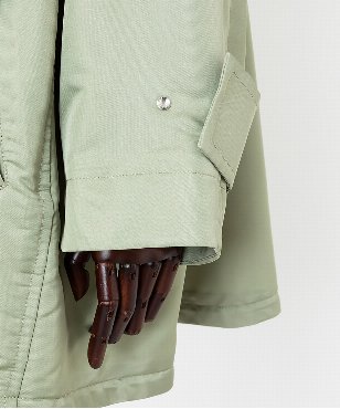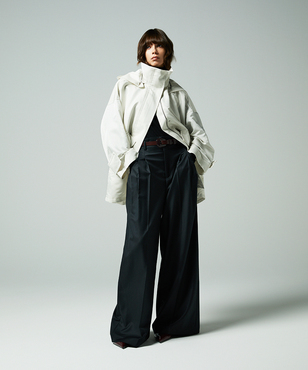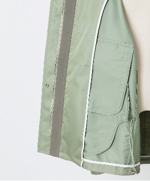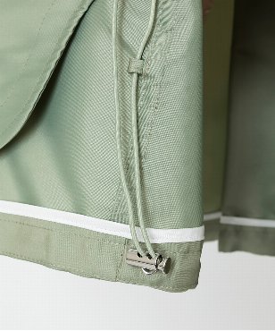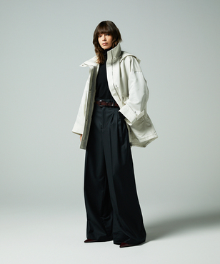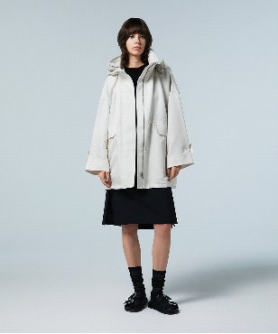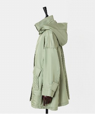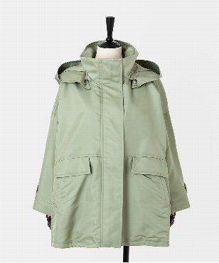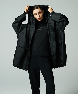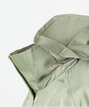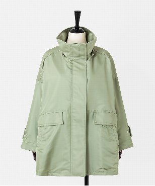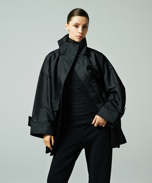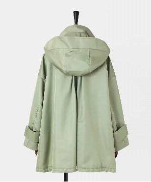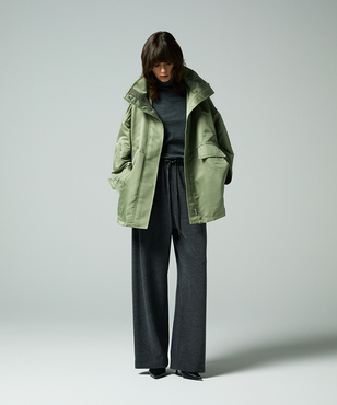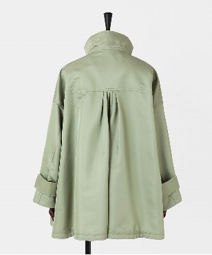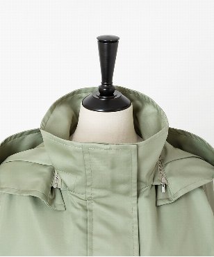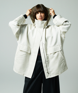スカートにもパンツにも合わせやすいシルエットのミドル丈のジップアップブルゾンは、高めの衿とボリュームのあるフードがアクセント。バックスタイルにはギャザーを寄せて丸みを帯びた立体的なラインに。裾のコードを絞ってシルエットの変化も楽しめます。取り外し可能なフードでシーンにあわせた着こなしが可能です。シルク/ポリエステルを使用した高密度サテン生地は、シルクならではの上品な光沢としわになりにくい機能性を両立させた素材です。さらに撥水加工を施し、軽い雨なら防げる機能も持っています。同素材ノーカラーショートブルゾンFGJGV19830もご用意いたしております。
