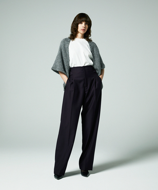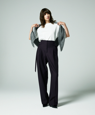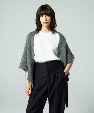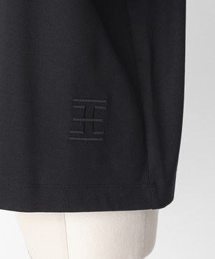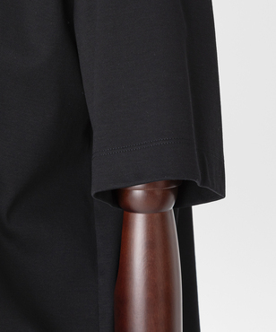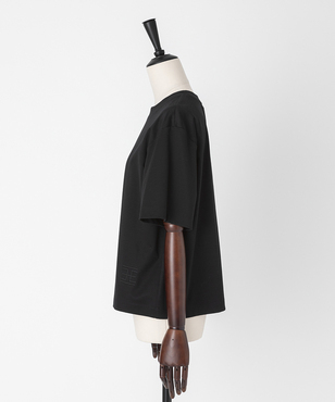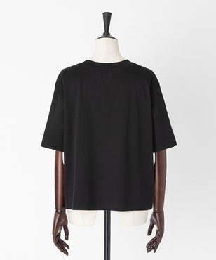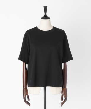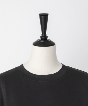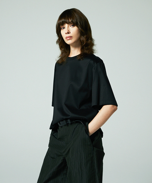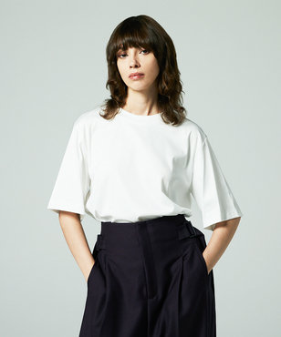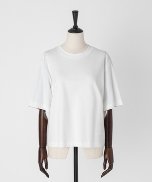 オフボディシルエットのTシャツ。若干ショートレングスにしてボトムとのバランスをとりやすくデザインしています。身頃裾には同色のロゴマーク刺繍入り。上質な100%スーピマコットンのスムース組織のカットソー。その糸を丁寧に編み上げた後、バイオ加工と強シルケット加工、ナチュラルストレッチを与える特殊柔軟加工により、シルキーな光沢感と上品なハリのあるジャージー素材に仕上げています。
