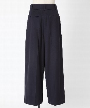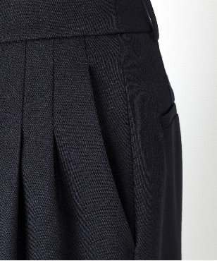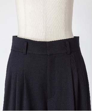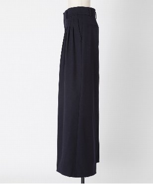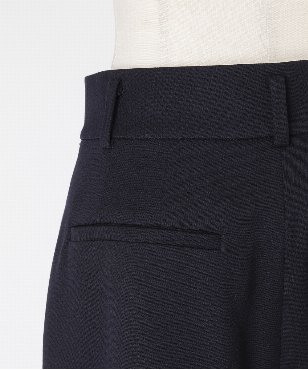 フロントに入れたタックが特徴のワイドパンツ。しなやかな生地から生まれる裾のフレア感はエレガントな印象を持っています。細番手ウールを使用した程よいウエイトのキャバリーツイル。光沢感と柔らかな風合い、ストレッチ性もあり着心地の良い素材感です。日本製生地。