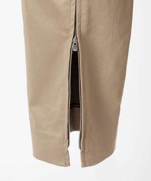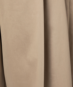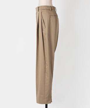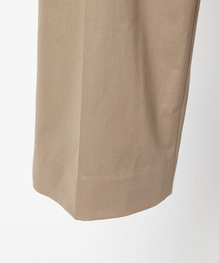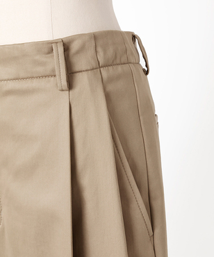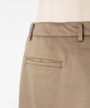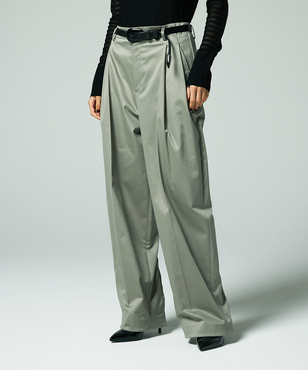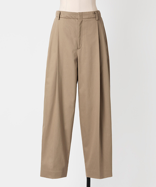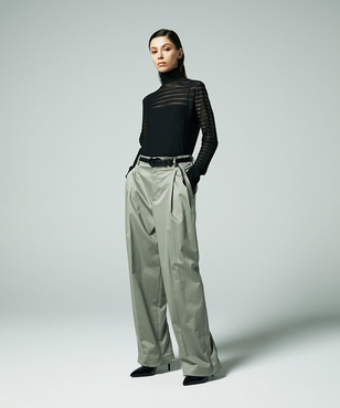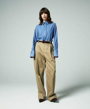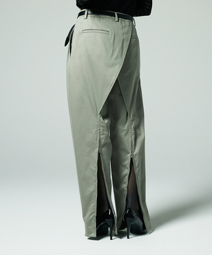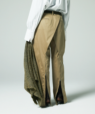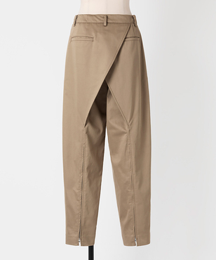 クロスさせたバックデザインと裾に入れた深いファスナースリットが特徴的なバレルシルエットのパンツ。ファスナーを開くとストレートのようなシルエットに変化し、足元に抜け感が加わります。60年代から70年代のトレンチコートを現代に復刻させた素材で、細番手の糸を高密度に織り上げたヴィンテージ感のあるコットンサテン。ストレッチ性がありながらも滑らかで艶があります。撥水機能あり。イタリア製素材。
