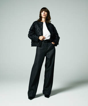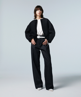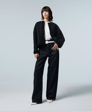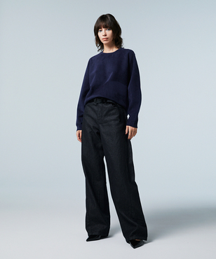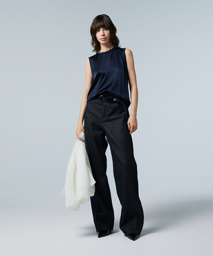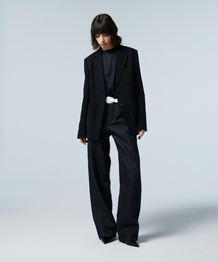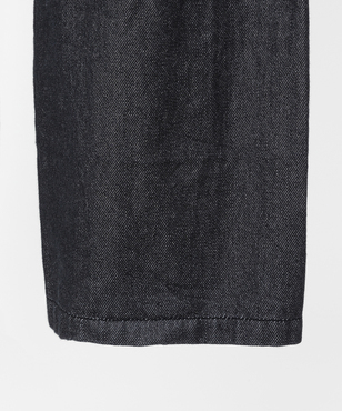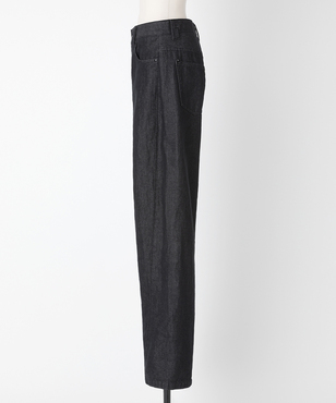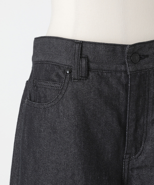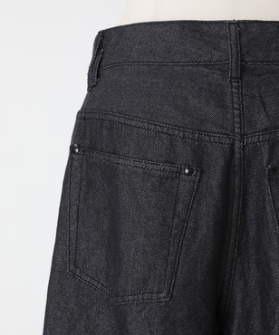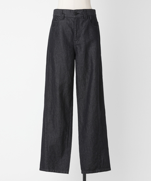 脇線をフロント側に振ったワイドストレートシルエットのデニムパンツ。ウエスト位置を若干落として着用することでスタイリッシュなバランスになるようデザインしています。塗装した艶のあるリベットがアクセント。製品ボールバイオ加工。ささ和紙(※)の糸と綿のコーマ糸をデニム調に交織し、柔軟タンブラー加工で仕上げた綾織り素材です。日本製生地。※和紙の原料と一緒にくま笹の繊維を漉き込み、シート状にした和紙を細長くカットして撚りをかけて糸にしたもの。くま笹は薬剤を使用することなく、1年で大きく成長するので環境破壊を起こしにくい植物。そのくま笹を漉き込むことで、天然由来の抗菌力、防臭力という機能性が加わり、和紙としての軽さ・吸水性・UVカット・断熱性も合わせて、夏には涼しく、冬には暖かい、人にも環境にも優しい素材となっています。同型シルクサテン素材FGLGA09760もご用意いたしております。