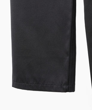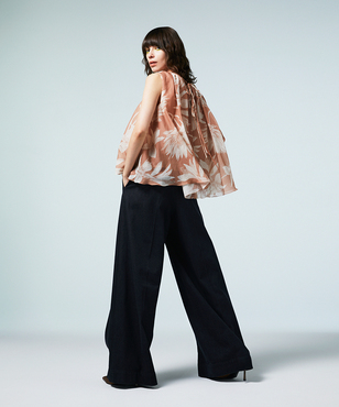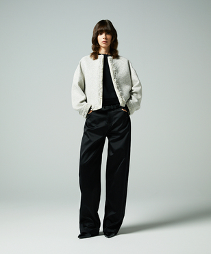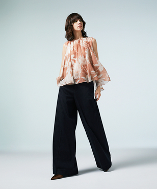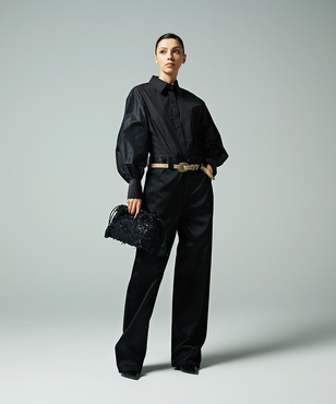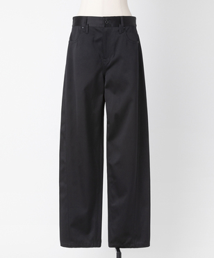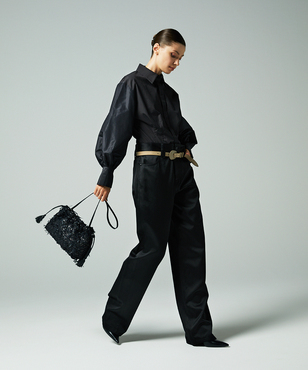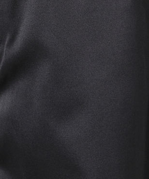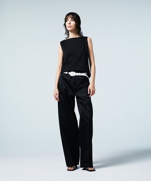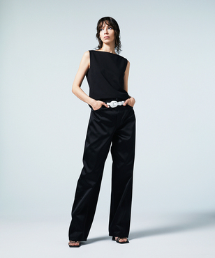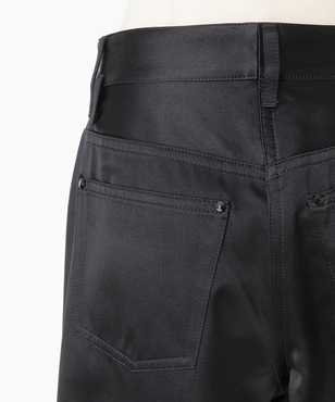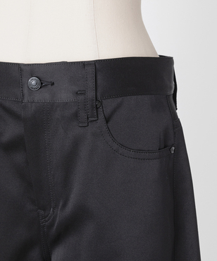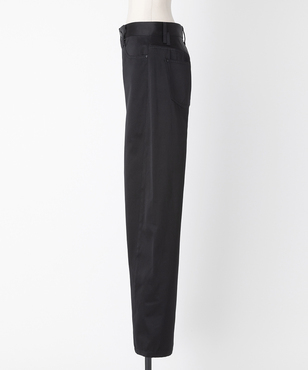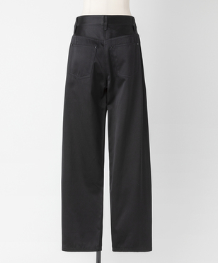 脇線をフロント側に振ったワイドストレートシルエットのシルクサテンパンツ。ウエスト位置を若干落として着用することでスタイリッシュなバランスになるようデザインしています。塗装した艶のあるリベットがアクセント。たて糸に高品質の証であるブラタク社のシルク、よこ糸にコットンを使用した超高密度のダブルサテンです。たて糸が超高密度の為、難易度の高い織物となっています。シルクのしなやかでエレガントな光沢を残しつつ、コットンブレンドによる程よくカジュアルな雰囲気も持ち合わせた素材です。日本製生地。同型デニム素材FGLGA08590もご用意いたしております。