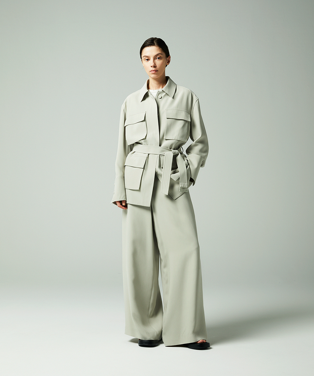 裾に向かって緩やかにフレアが広がる柔らかなシルエットが特徴のパンツ。腰回りを程よく体に沿わせることでワイドシルエットでもすっきりとしたバランスで着用できます。最高ランクのシルク糸を使用した33匁の特殊ジョーゼット素材。タテ・ヨコ糸ともに独特の撚りをかけたシルク糸を使用し、特殊織機にてリバーシブル風の変化組織に作り上げることで上質なふくらみ感を生み出しています。同素材シルクジョーゼットサファリジャケット[FGDYD11140]もご用意いたしております。