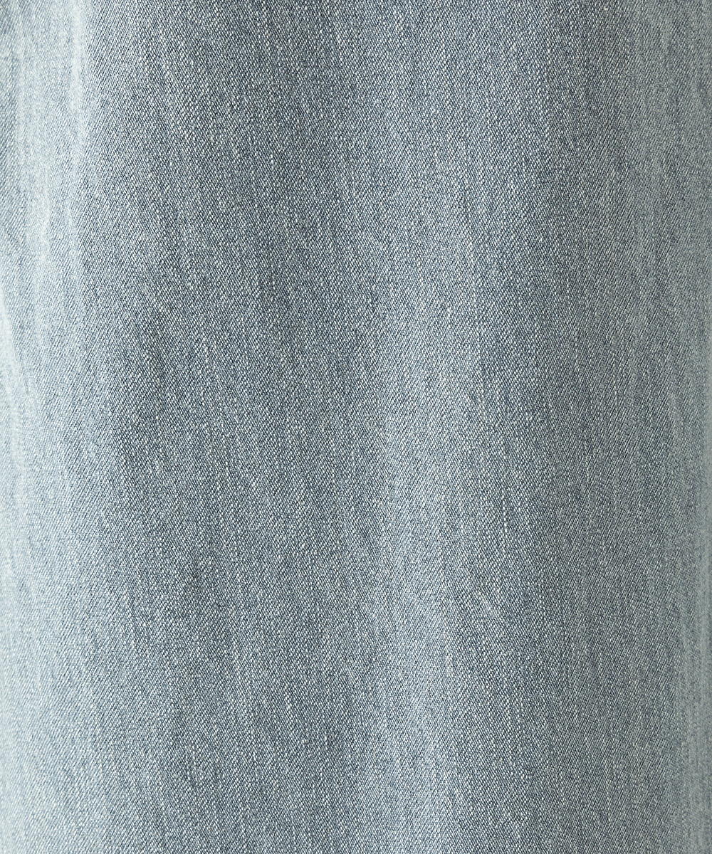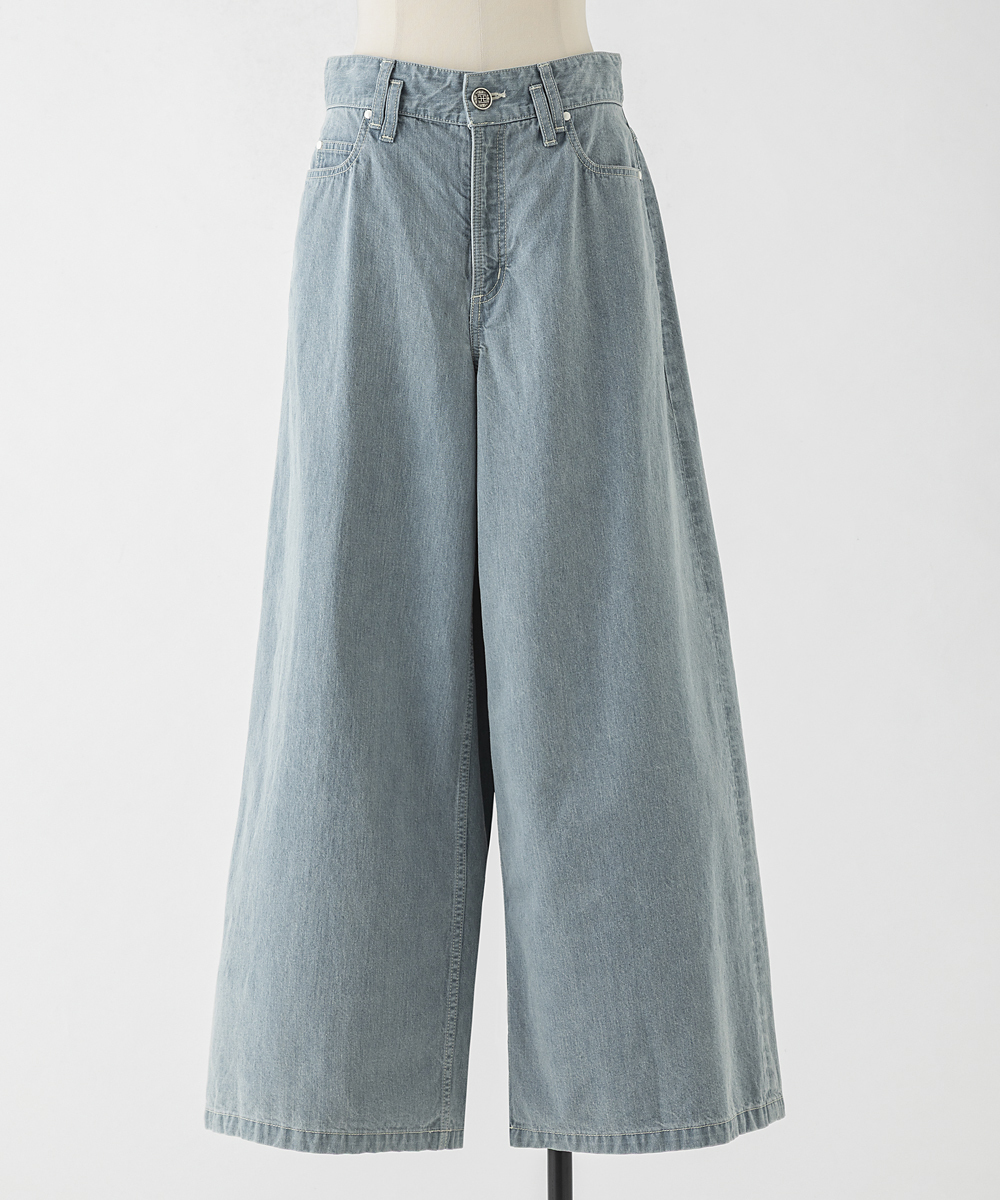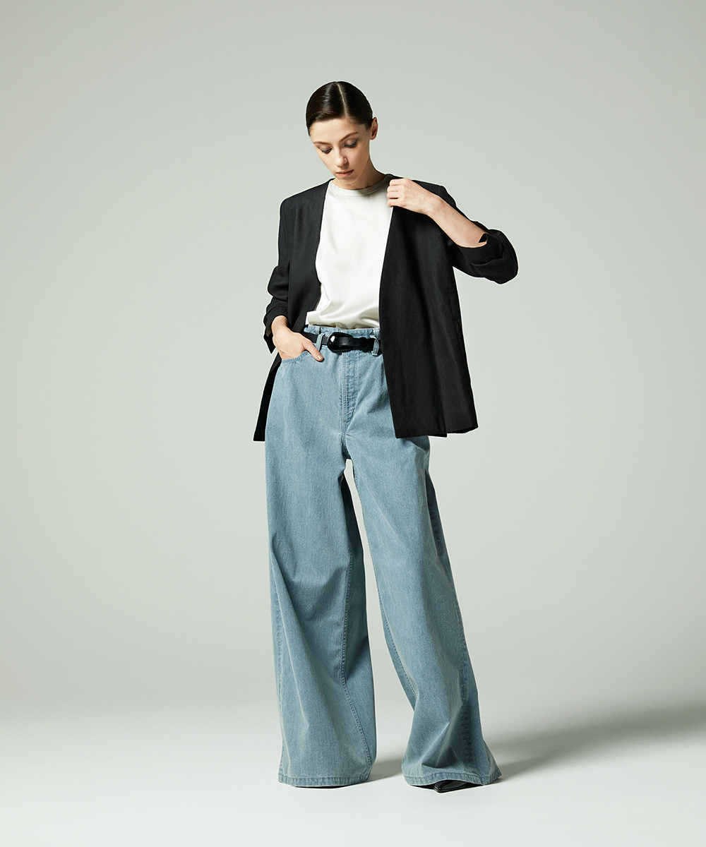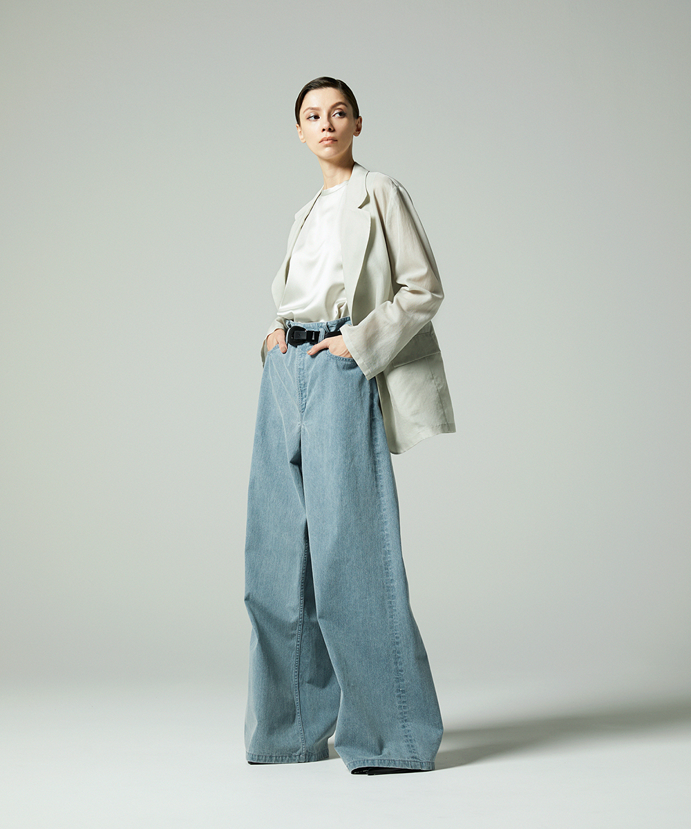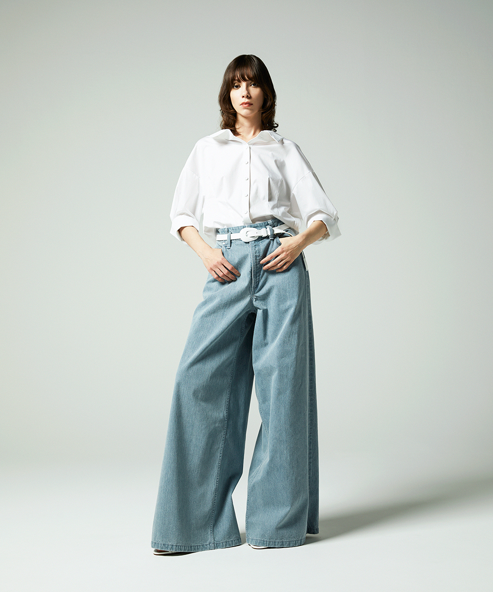ワイドな裾幅を持つデニム。ボリューム感はありながらも腰まわりはすっきりとしたシルエットに仕立て、コーディネートしやすいバランスにしています。オフホワイトに塗装したオリジナルコインボタンやリベット、ホワイトのレザーパッチがアクセント。横糸にグレーの杢糸を打ち込んだムラ感のある軽めの9.5オンスデニムを、特許技術である海洋深層水でブリーチ&洗い加工した日本製素材。高知県室戸岬のミネラル豊富な海洋深層水でブリーチすることで、独特な深みのあるグレイッシュなカラーに。科学薬品ではなく天然水を使用することで生地を痛めることなく、環境にも優しい加工となっています。※画像はサンプルです。※実際の商品とはレザーパッチのステッチの入り方、位置が異なります。※こちらの商品はラッピング不可アイテムです。