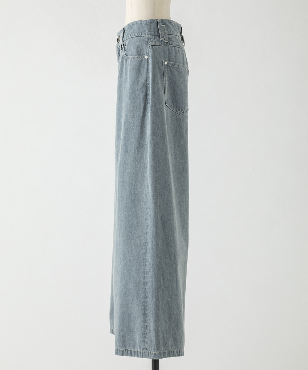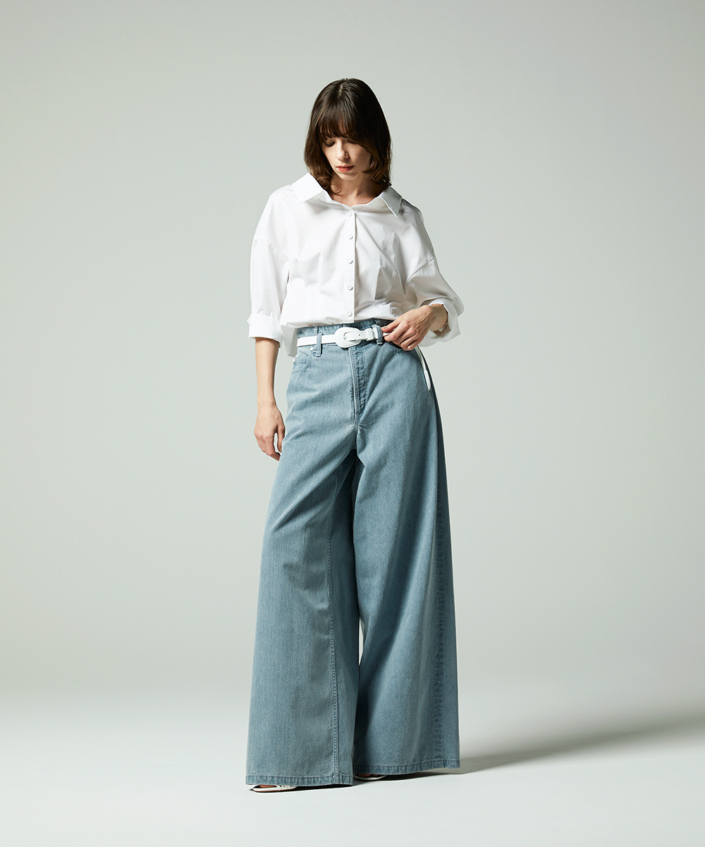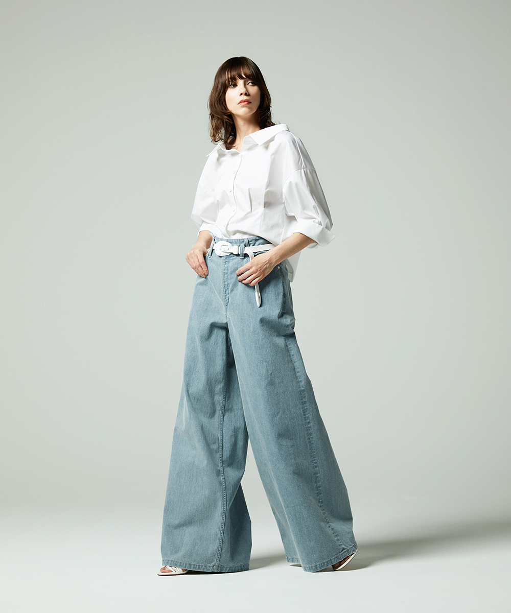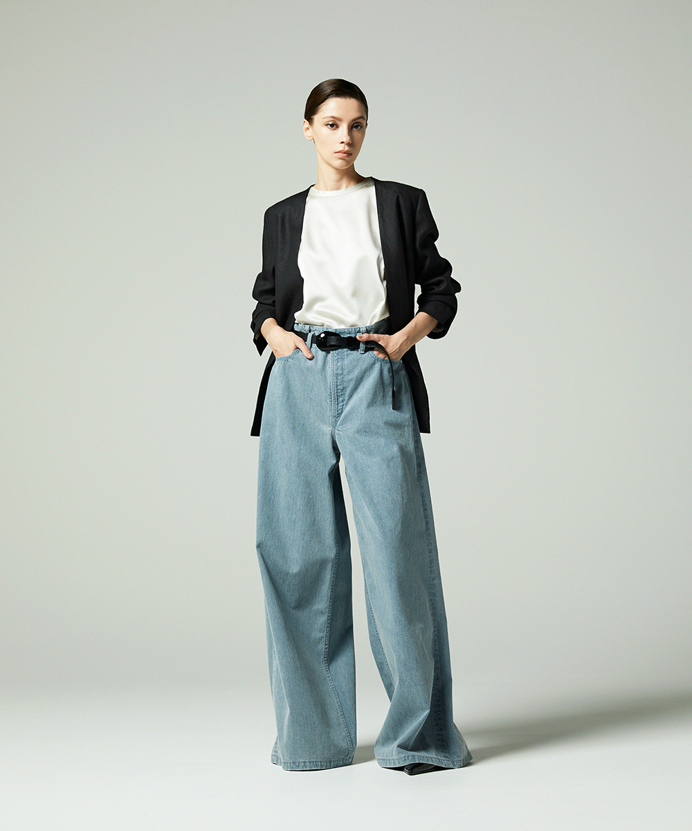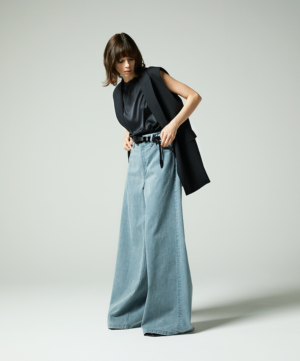 ワイドな裾幅を持つデニム。ボリューム感はありながらも腰まわりはすっきりとしたシルエットに仕立て、コーディネートしやすいバランスにしています。オフホワイトに塗装したオリジナルコインボタンやリベット、ホワイトのレザーパッチがアクセント。横糸にグレーの杢糸を打ち込んだムラ感のある軽めの9.5オンスデニムを、特許技術である海洋深層水でブリーチ&洗い加工した日本製素材。高知県室戸岬のミネラル豊富な海洋深層水でブリーチすることで、独特な深みのあるグレイッシュなカラーに。科学薬品ではなく天然水を使用することで生地を痛めることなく、環境にも優しい加工となっています。※画像はサンプルです。※実際の商品とはレザーパッチのステッチの入り方、位置が異なります。※こちらの商品はラッピング不可アイテムです。