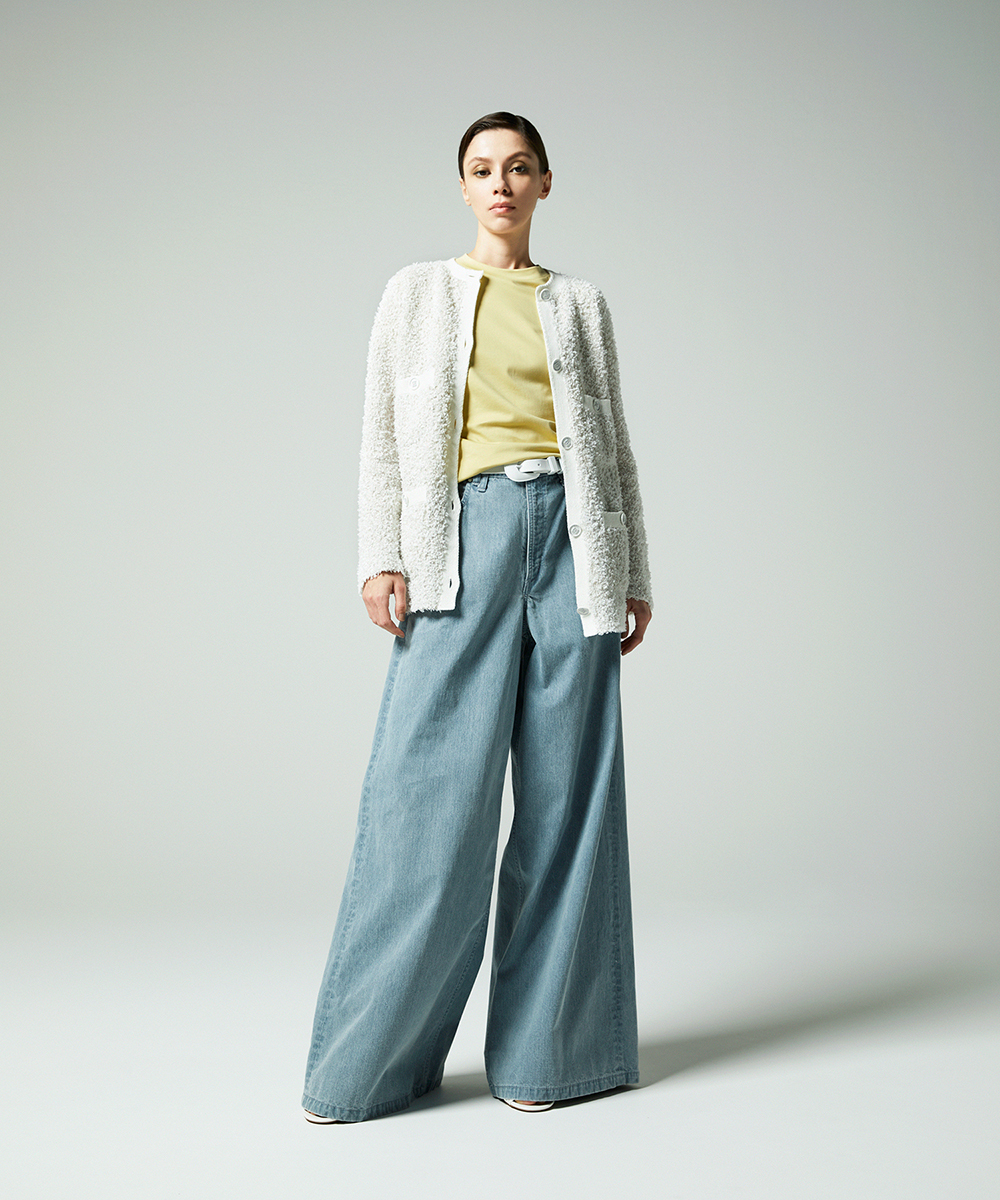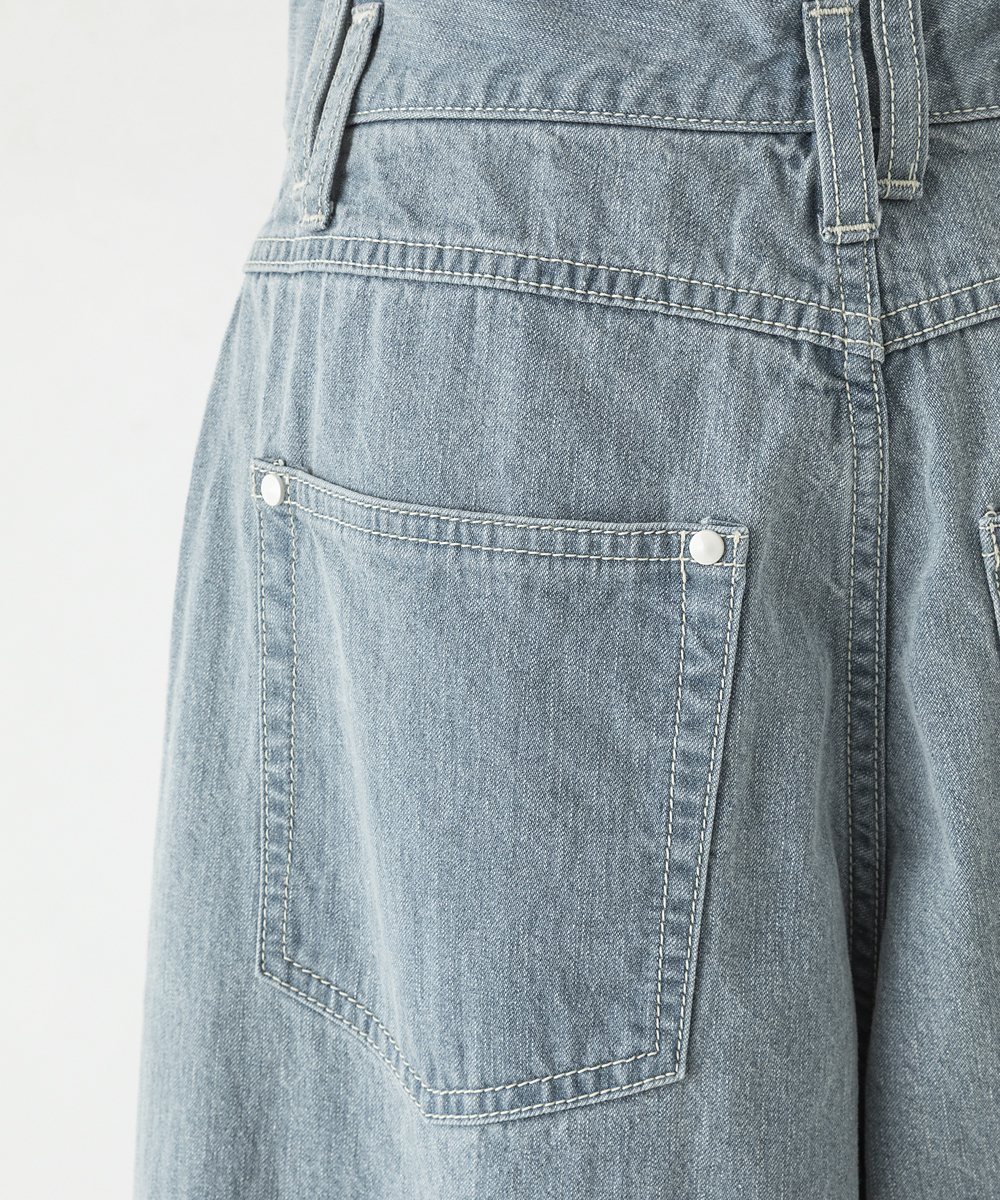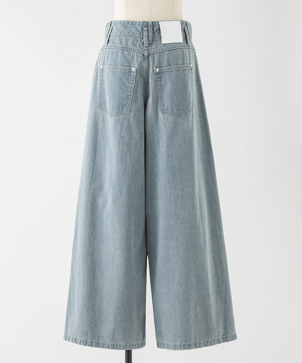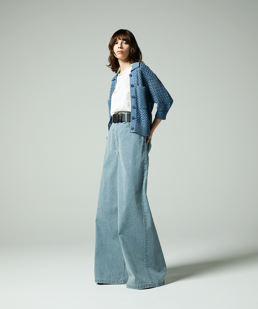 ワイドな裾幅を持つデニム。ボリューム感はありながらも腰まわりはすっきりとしたシルエットに仕立て、コーディネートしやすいバランスにしています。オフホワイトに塗装したオリジナルコインボタンやリベット、ホワイトのレザーパッチがアクセント。横糸にグレーの杢糸を打ち込んだムラ感のある軽めの9.5オンスデニムを、特許技術である海洋深層水でブリーチ&洗い加工した日本製素材。高知県室戸岬のミネラル豊富な海洋深層水でブリーチすることで、独特な深みのあるグレイッシュなカラーに。科学薬品ではなく天然水を使用することで生地を痛めることなく、環境にも優しい加工となっています。※画像はサンプルです。※実際の商品とはレザーパッチのステッチの入り方、位置が異なります。※こちらの商品はラッピング不可アイテムです。