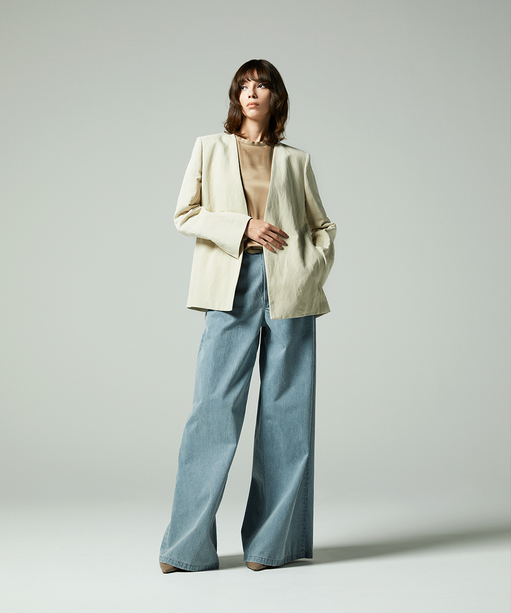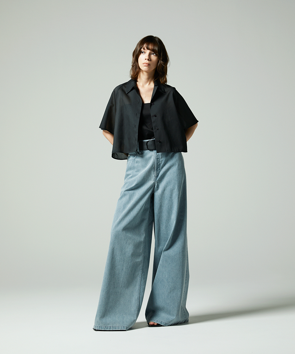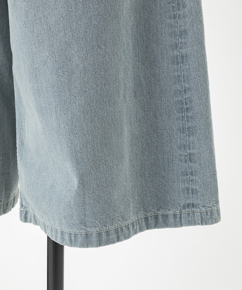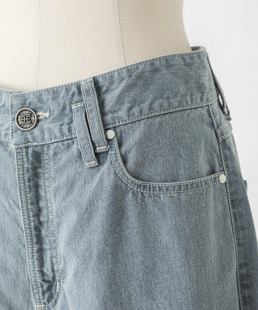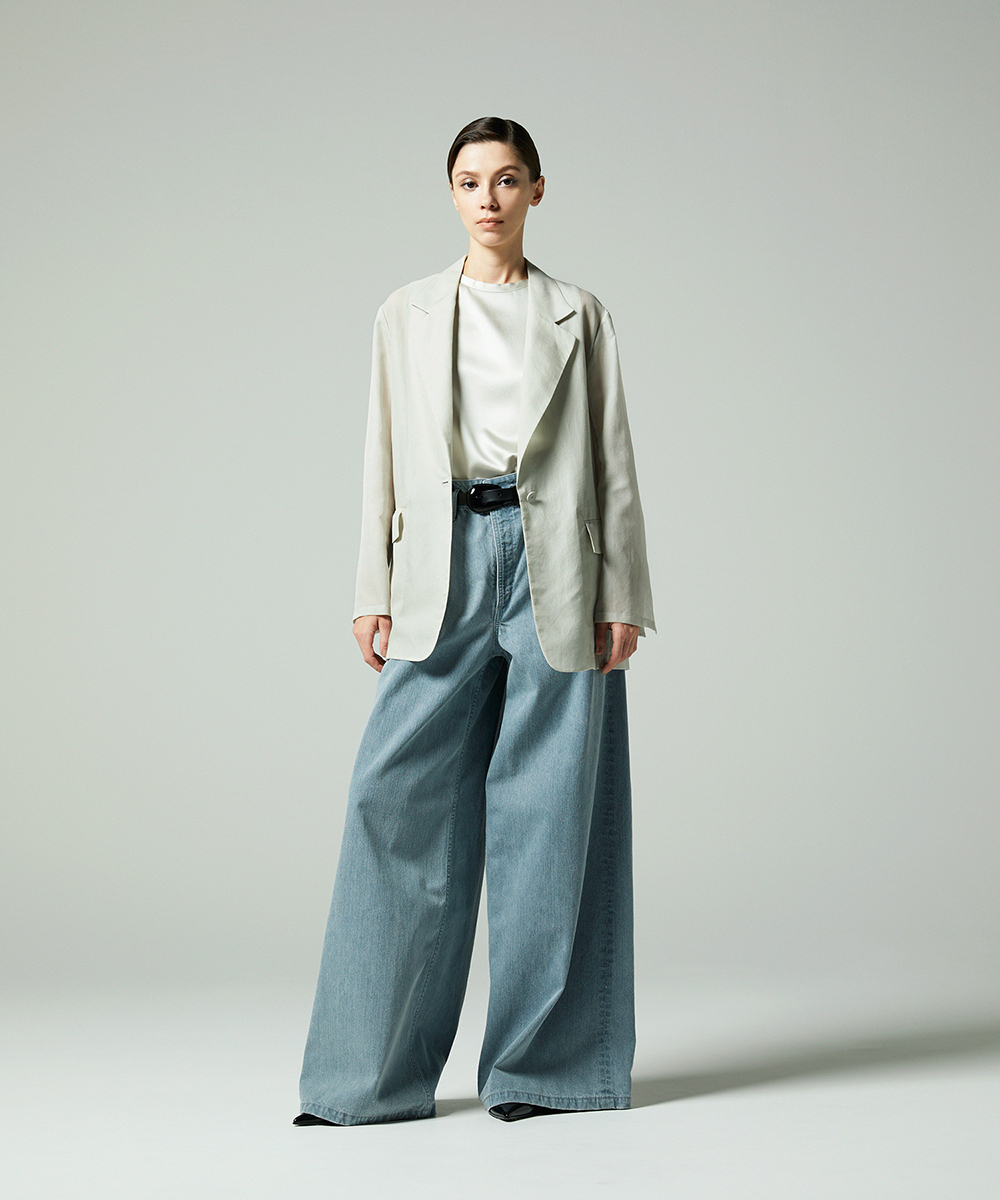 ワイドな裾幅を持つデニム。ボリューム感はありながらも腰まわりはすっきりとしたシルエットに仕立て、コーディネートしやすいバランスにしています。オフホワイトに塗装したオリジナルコインボタンやリベット、ホワイトのレザーパッチがアクセント。横糸にグレーの杢糸を打ち込んだムラ感のある軽めの9.5オンスデニムを、特許技術である海洋深層水でブリーチ&洗い加工した日本製素材。高知県室戸岬のミネラル豊富な海洋深層水でブリーチすることで、独特な深みのあるグレイッシュなカラーに。科学薬品ではなく天然水を使用することで生地を痛めることなく、環境にも優しい加工となっています。※画像はサンプルです。※実際の商品とはレザーパッチのステッチの入り方、位置が異なります。※こちらの商品はラッピング不可アイテムです。
