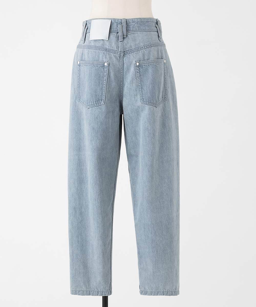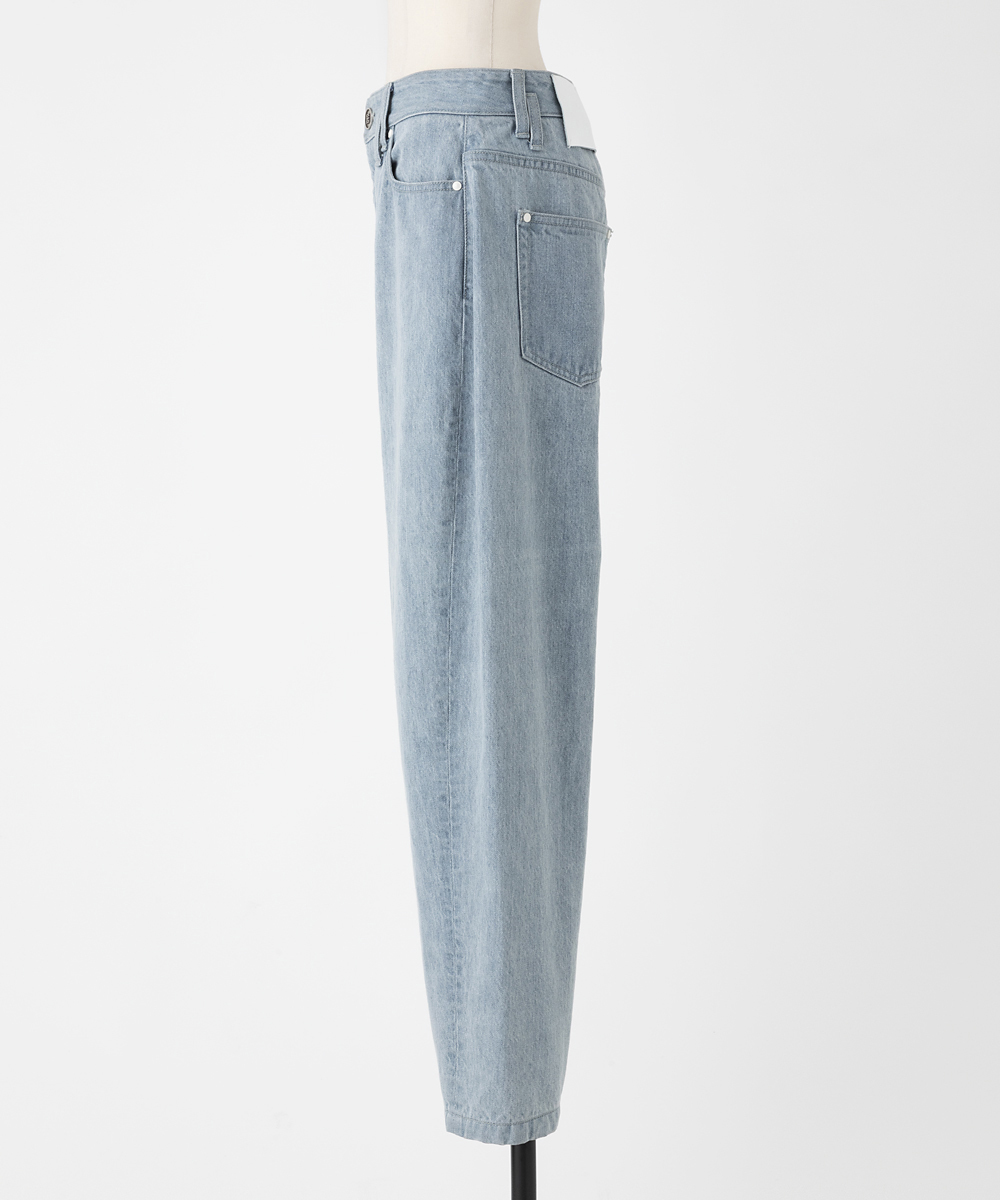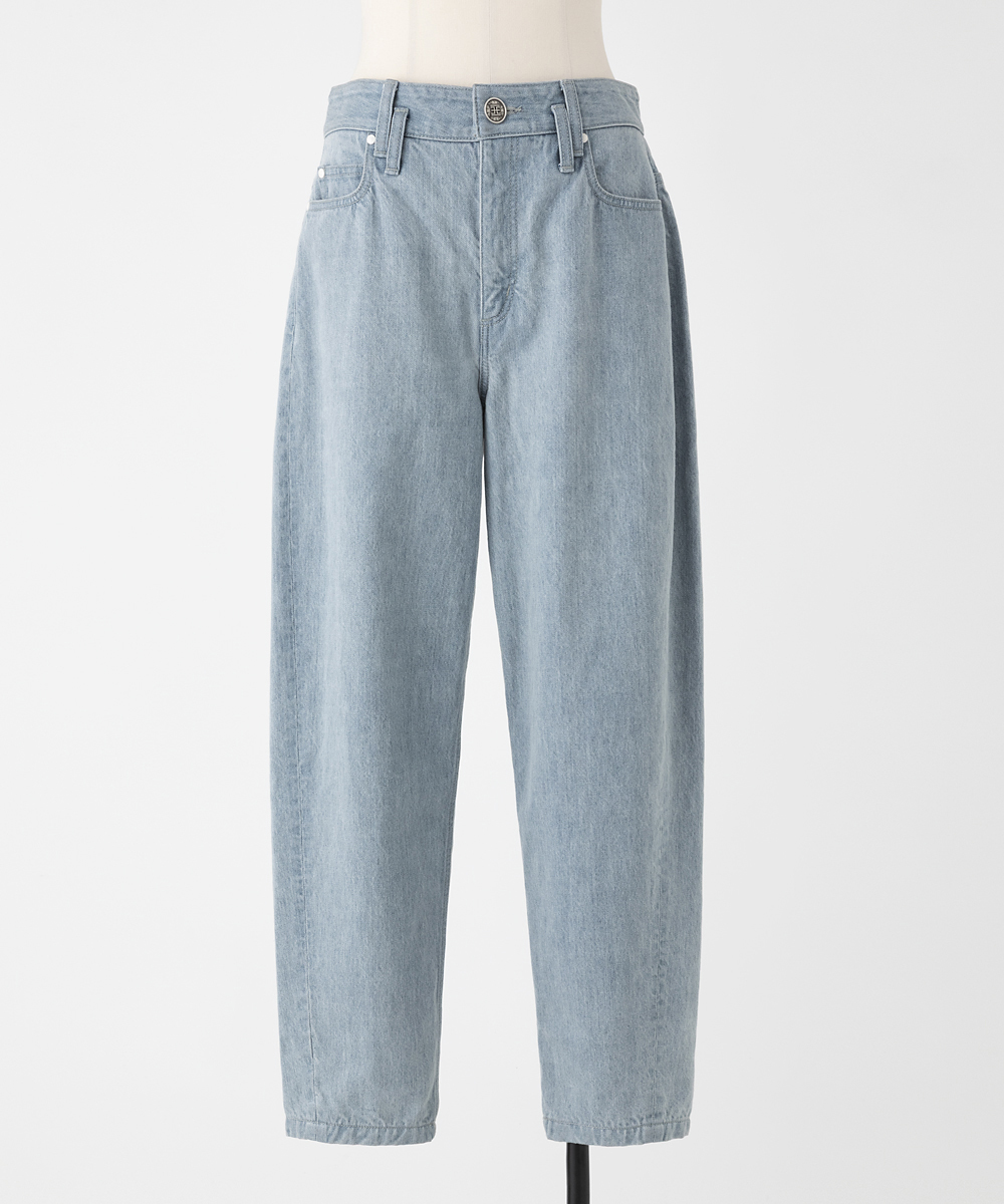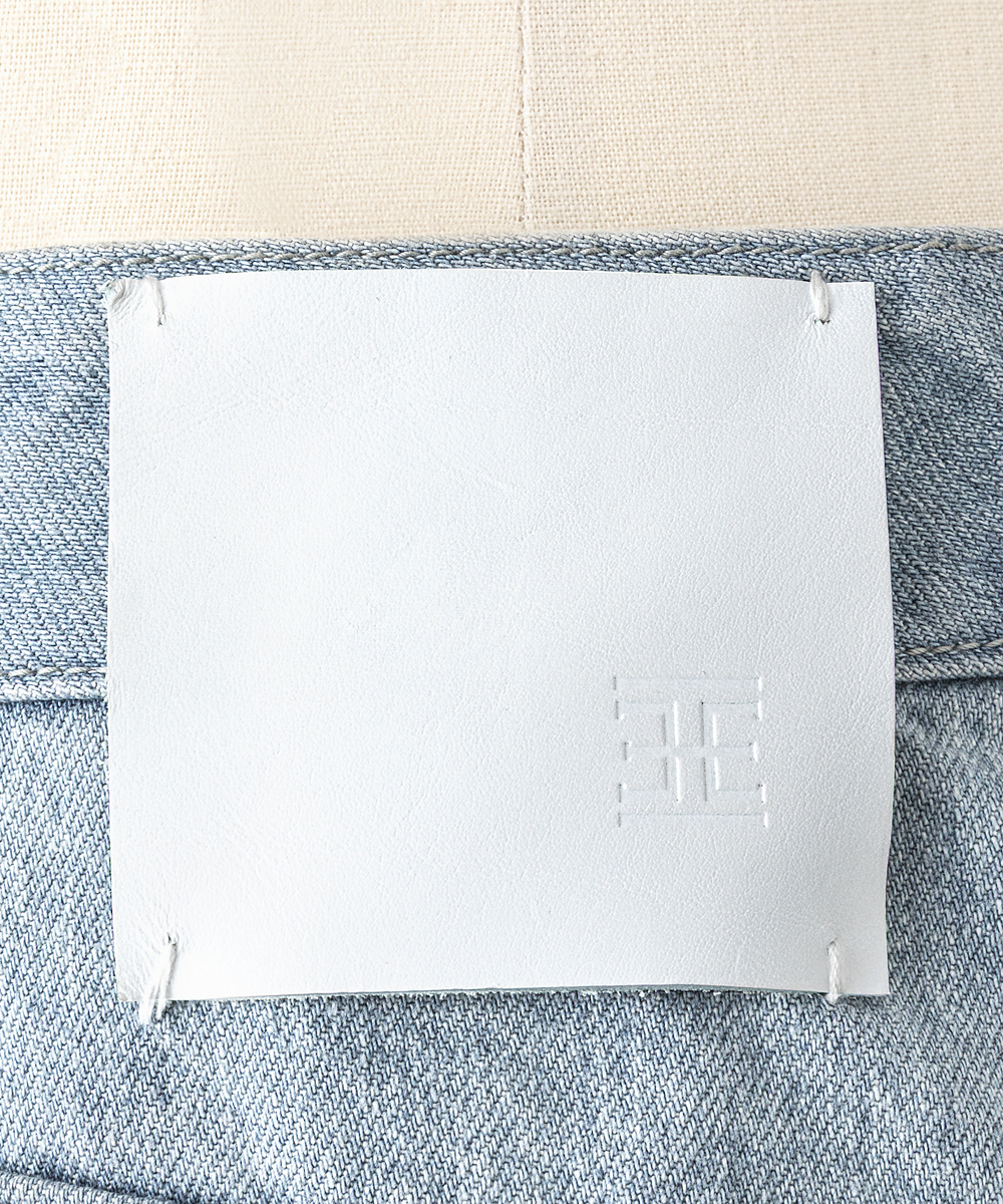 バレルタイプのシルエットを持つクロップト丈のデニムパンツ。足首を見せて軽さと抜け感を感じさせ、鮮度のあるスタイリングも楽しめます。オリジナルコインボタンや塗装のリベット、ホワイトのレザーパッチもアクセントに。程よいムラ糸と空紡糸で織り上げた12オンスデニムを特許技術である海洋深層水でのブリーチ&洗い加工した日本製生地。高知県室戸岬のミネラル豊富な海洋深層水でブリーチすることで、独特な深みのあるグレイッシュなカラーに。科学薬品ではなく天然水を使用することで生地を痛めることなく、環境にも優しい加工となっています。※画像はサンプルです。実際の商品はパッチが右側につきます。