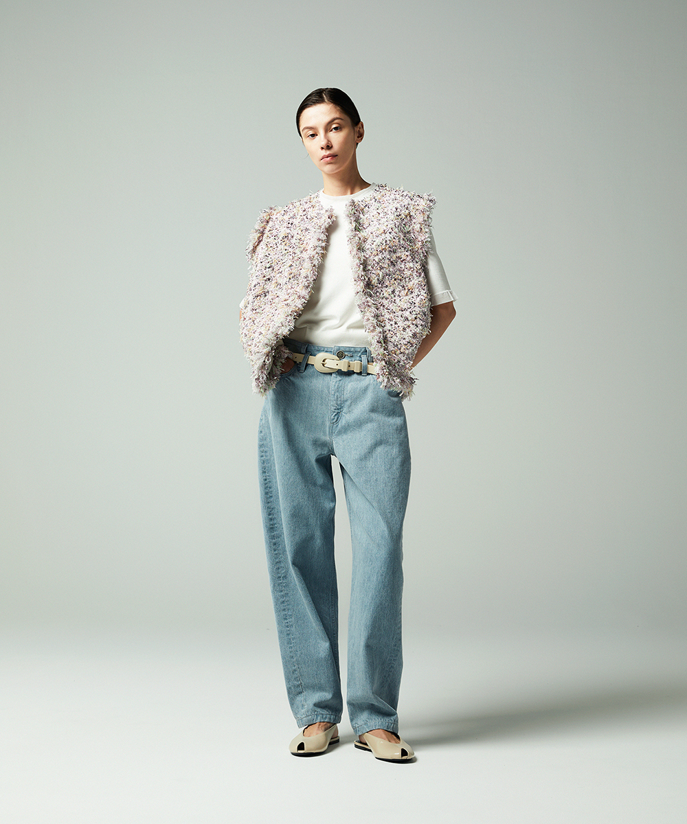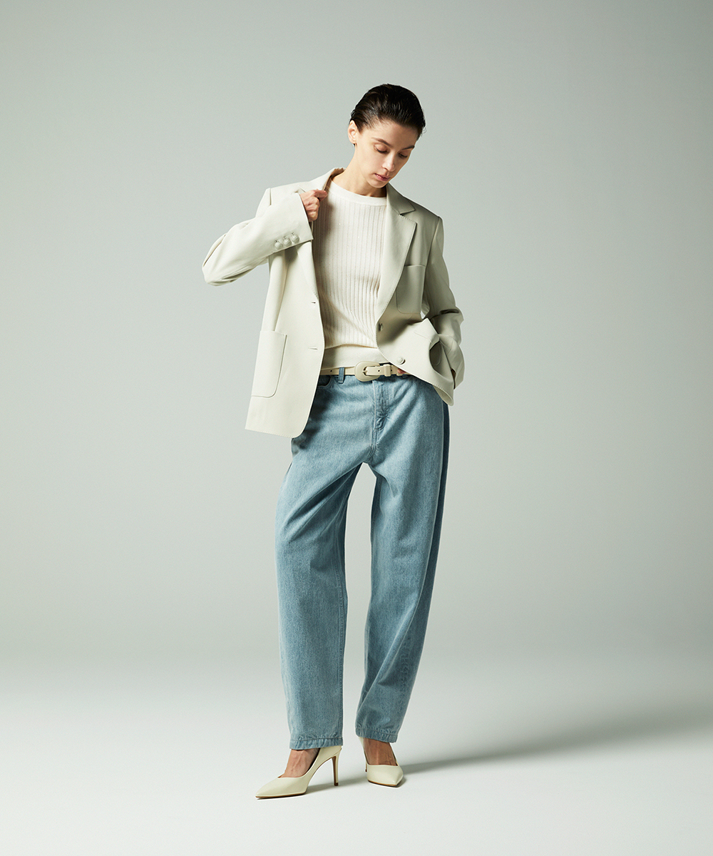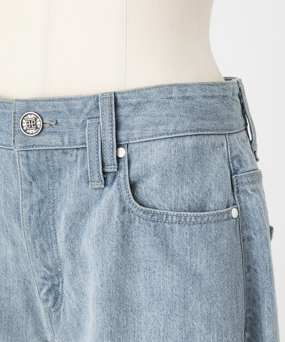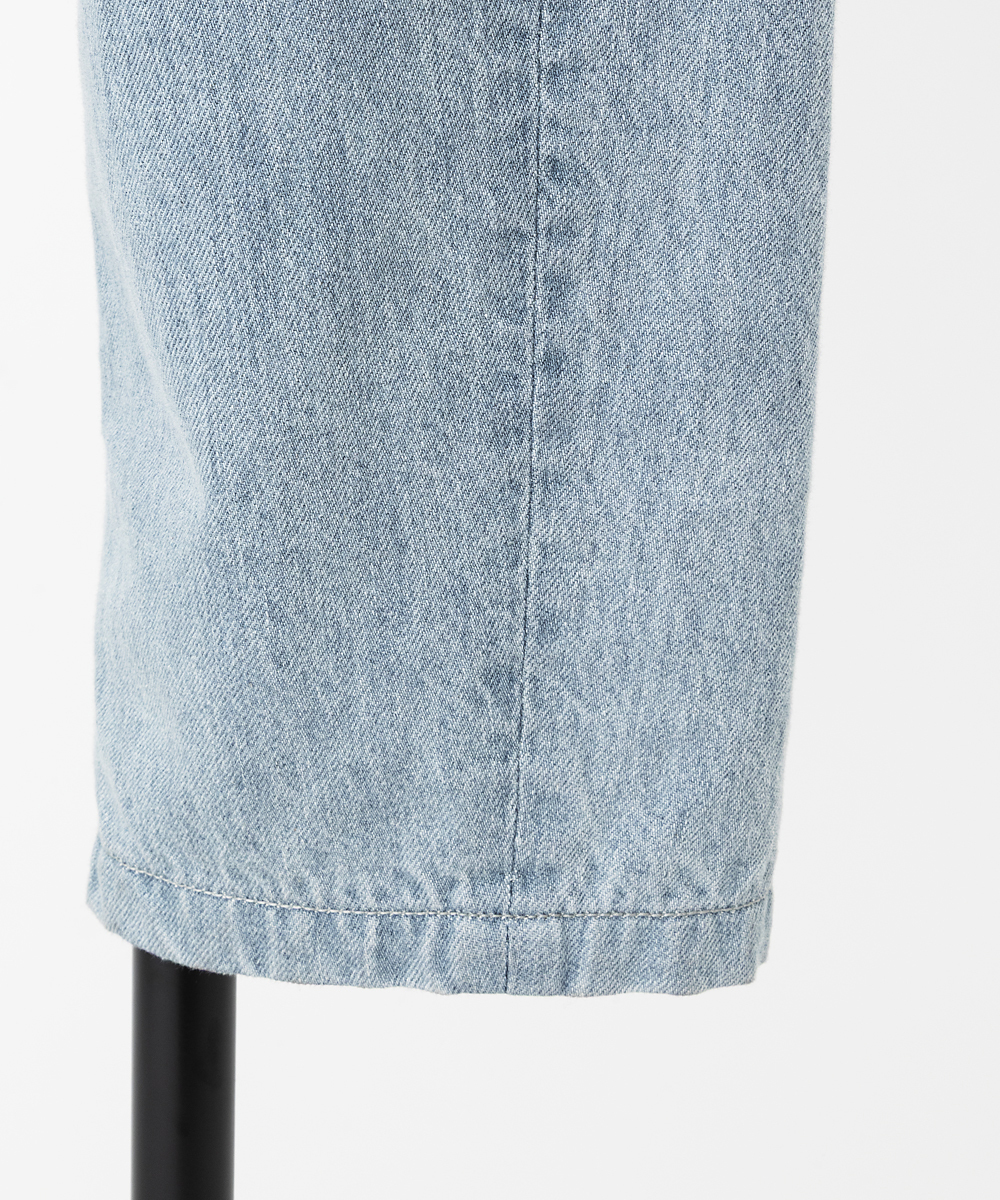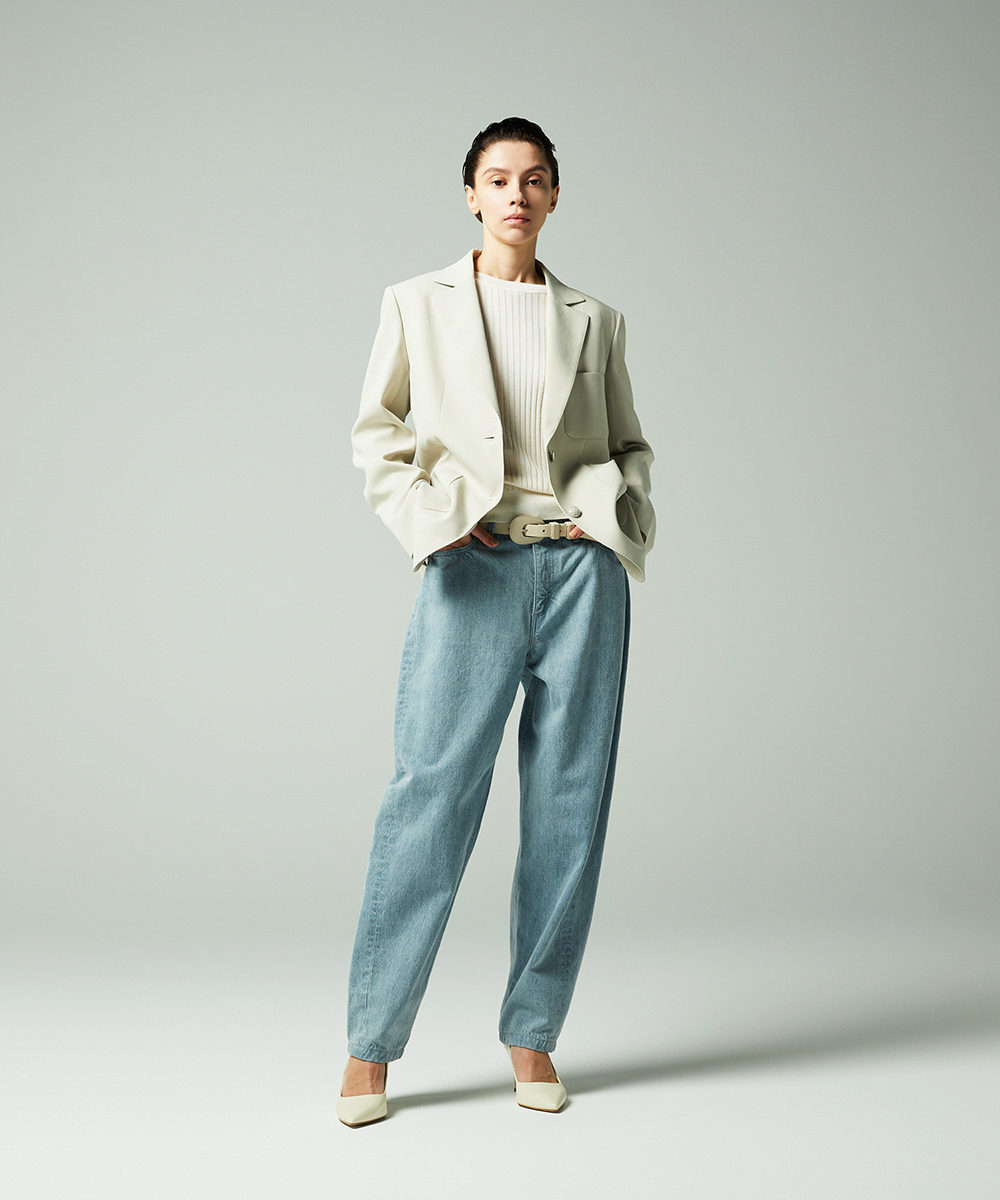 バレルタイプのシルエットを持つクロップト丈のデニムパンツ。足首を見せて軽さと抜け感を感じさせ、鮮度のあるスタイリングも楽しめます。オリジナルコインボタンや塗装のリベット、ホワイトのレザーパッチもアクセントに。程よいムラ糸と空紡糸で織り上げた12オンスデニムを特許技術である海洋深層水でのブリーチ&洗い加工した日本製生地。高知県室戸岬のミネラル豊富な海洋深層水でブリーチすることで、独特な深みのあるグレイッシュなカラーに。科学薬品ではなく天然水を使用することで生地を痛めることなく、環境にも優しい加工となっています。※画像はサンプルです。実際の商品はパッチが右側につきます。