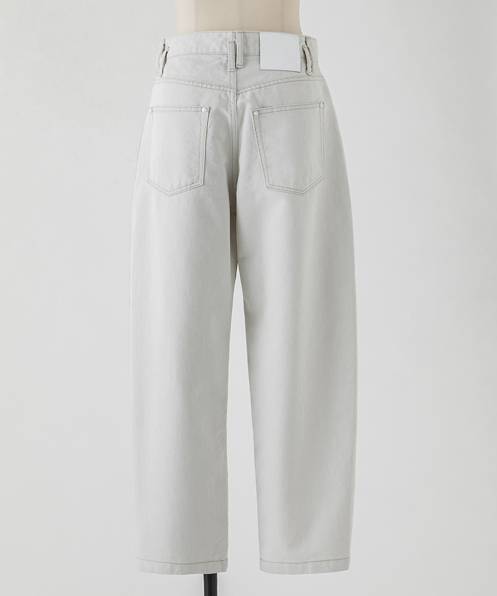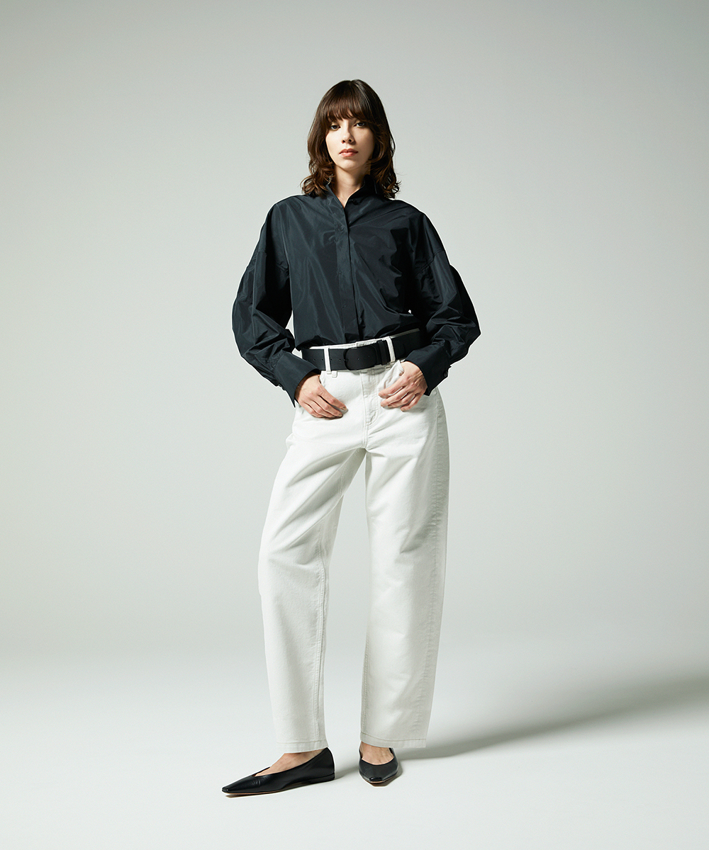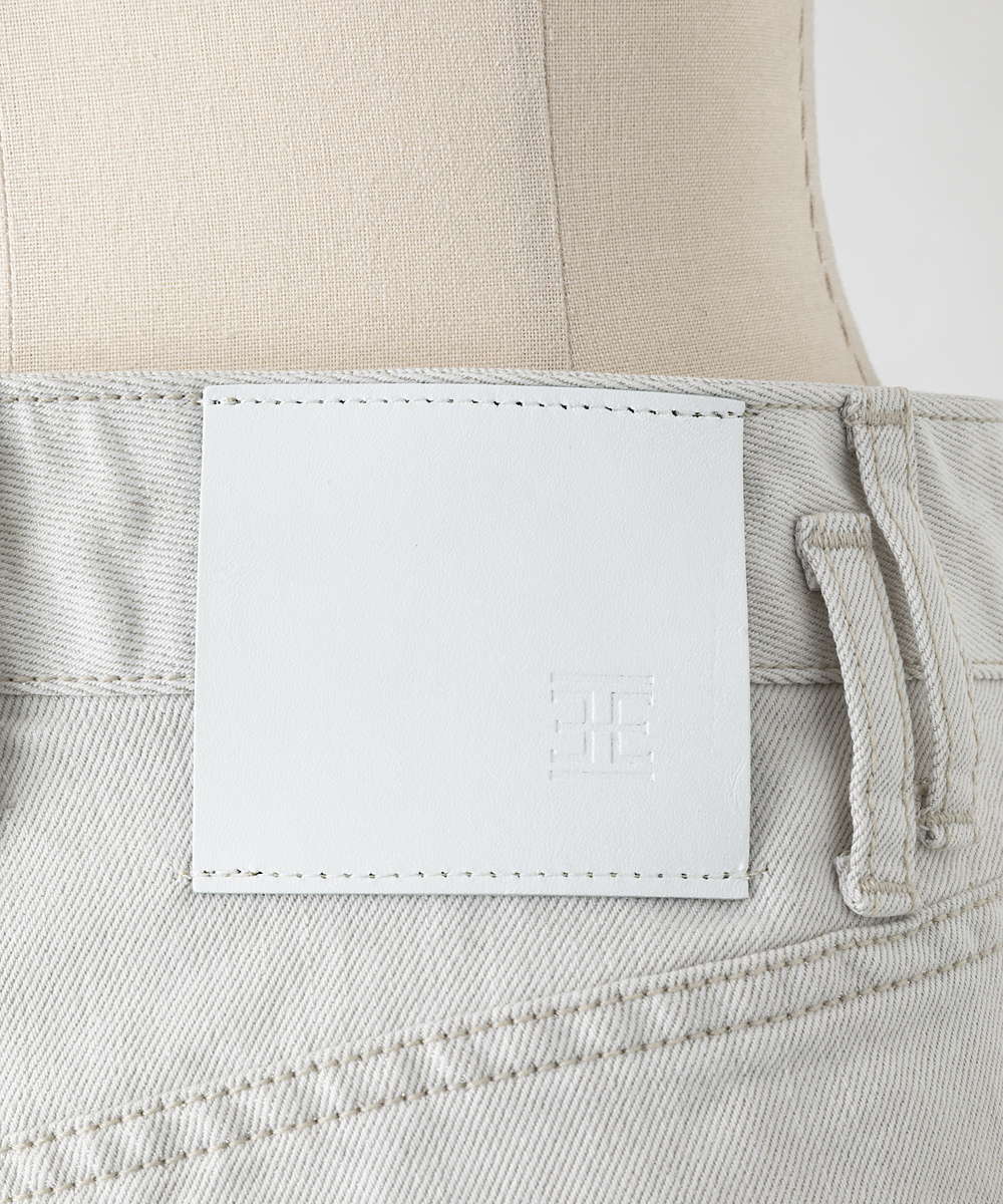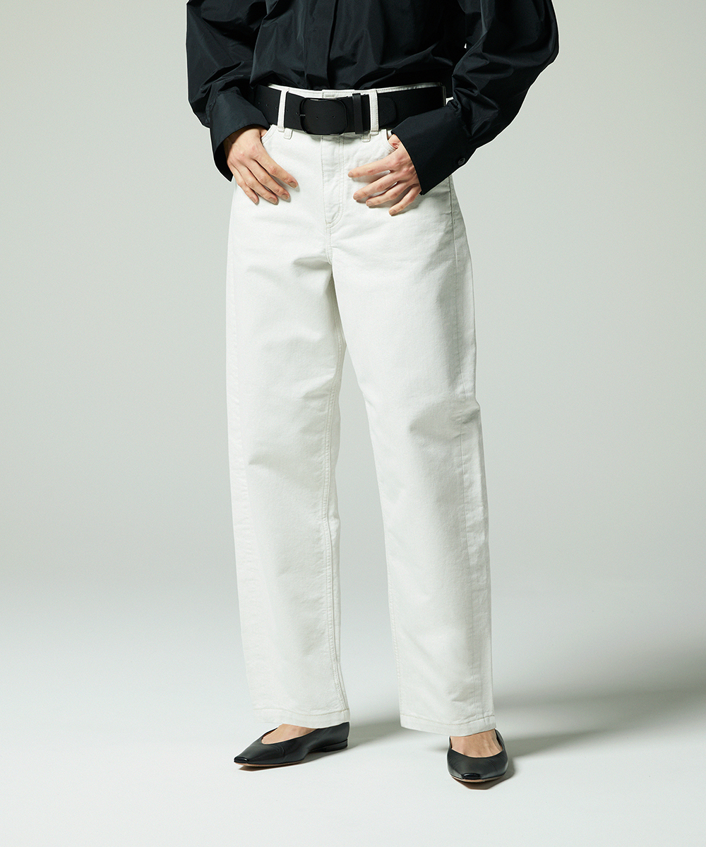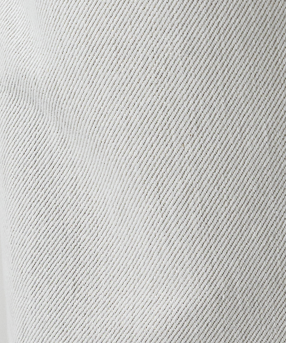 タテ糸にはナチュラルなムラ感のある糸を使用し、ヨコ糸には京都の西陣で作ったシルバーラメ糸を打ち込んだ9.5onzの日本製ホワイトデニム。表面に現れる繊細な光沢は贅沢なカジュアル感を醸し出しています。ホワイトラメデニムのバレルシルエットパンツ。オフホワイトに塗装したオリジナルコインボタンやリベット、ホワイトのレザーパッチがアクセント。※画像はサンプルです。※実際の商品とはレザーパッチのステッチの入り方が異なります。※こちらの商品はラッピング不可アイテムです。