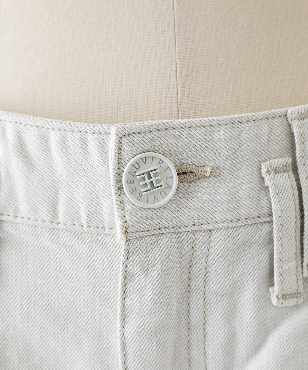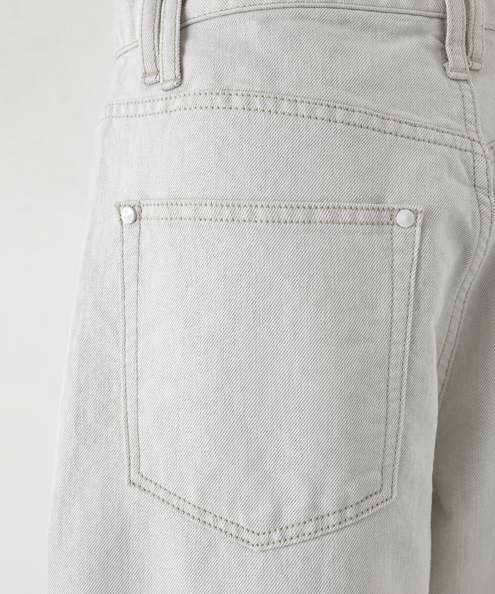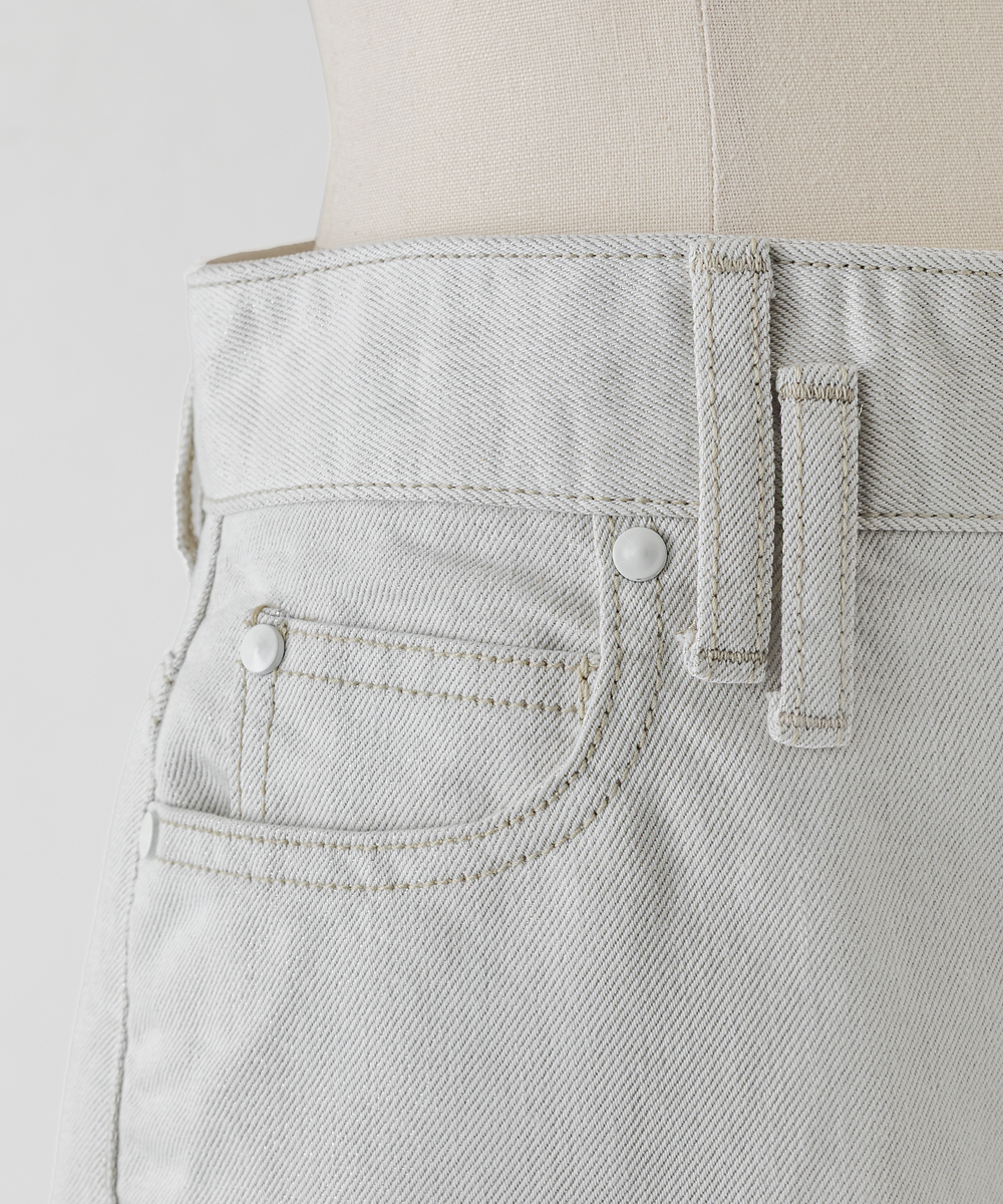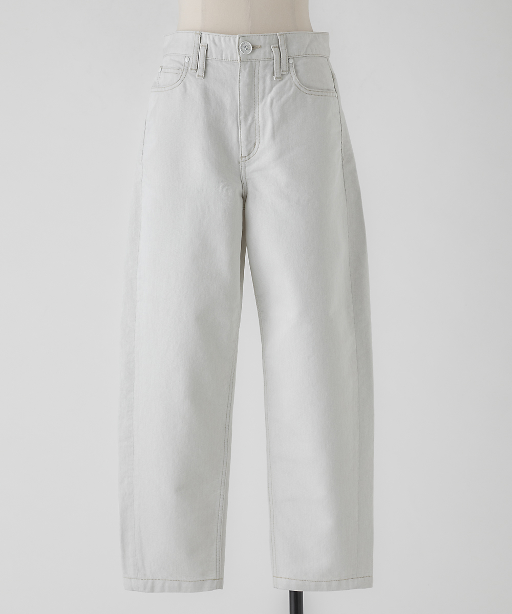タテ糸にはナチュラルなムラ感のある糸を使用し、ヨコ糸には京都の西陣で作ったシルバーラメ糸を打ち込んだ9.5onzの日本製ホワイトデニム。表面に現れる繊細な光沢は贅沢なカジュアル感を醸し出しています。ホワイトラメデニムのバレルシルエットパンツ。オフホワイトに塗装したオリジナルコインボタンやリベット、ホワイトのレザーパッチがアクセント。※画像はサンプルです。※実際の商品とはレザーパッチのステッチの入り方が異なります。※こちらの商品はラッピング不可アイテムです。