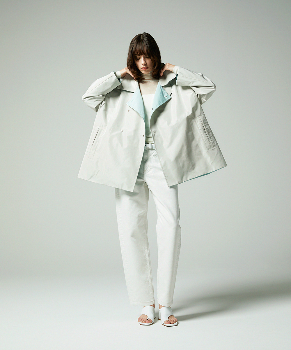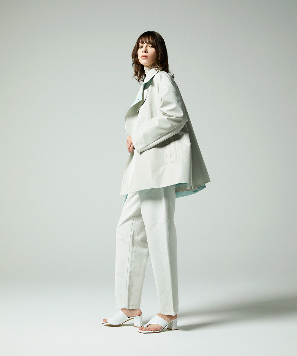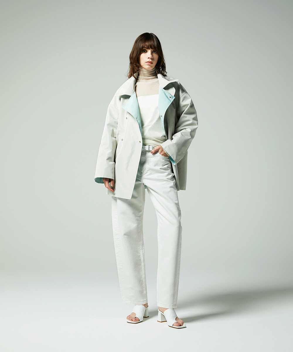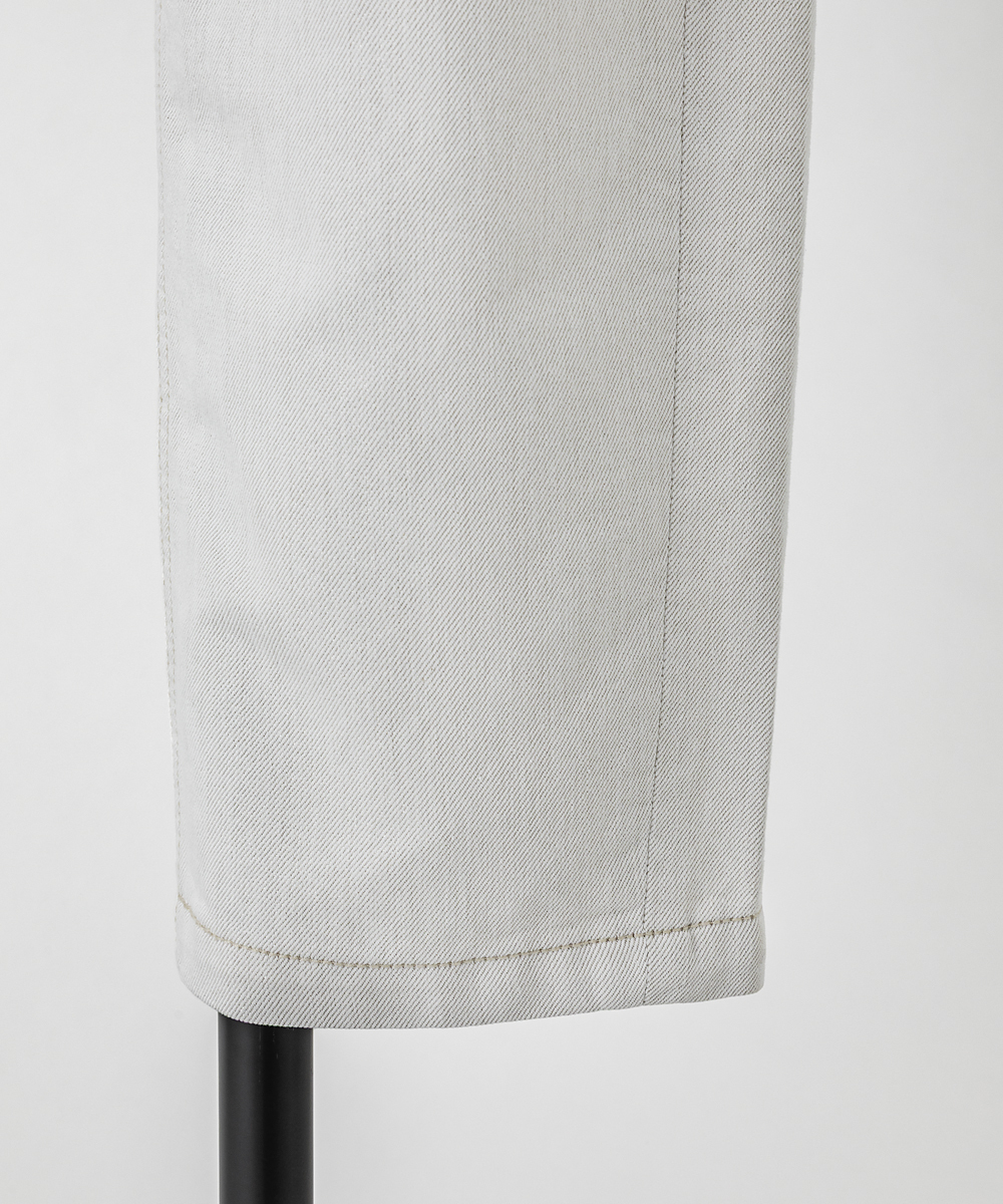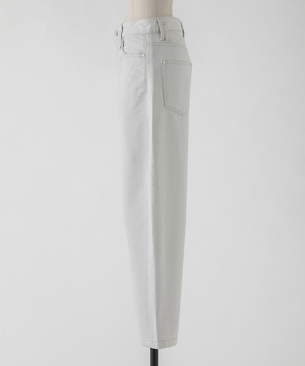 タテ糸にはナチュラルなムラ感のある糸を使用し、ヨコ糸には京都の西陣で作ったシルバーラメ糸を打ち込んだ9.5onzの日本製ホワイトデニム。表面に現れる繊細な光沢は贅沢なカジュアル感を醸し出しています。ホワイトラメデニムのバレルシルエットパンツ。オフホワイトに塗装したオリジナルコインボタンやリベット、ホワイトのレザーパッチがアクセント。※画像はサンプルです。※実際の商品とはレザーパッチのステッチの入り方が異なります。※こちらの商品はラッピング不可アイテムです。