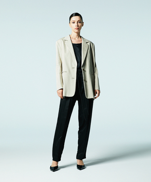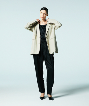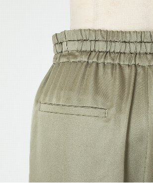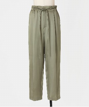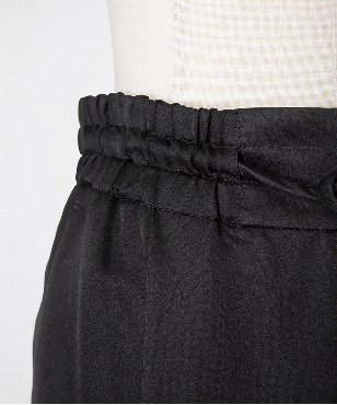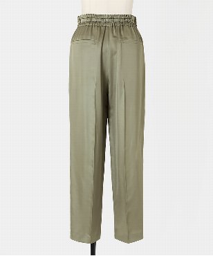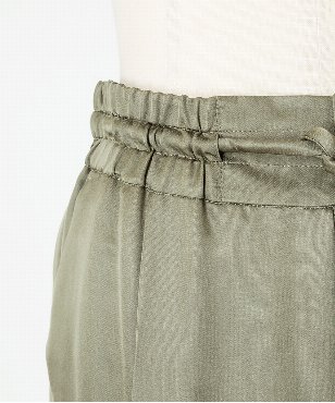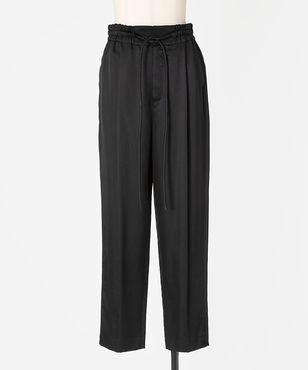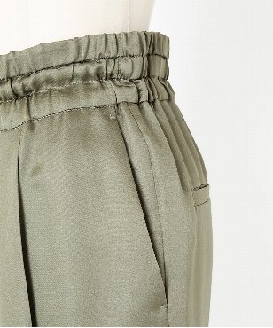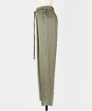 素材の落ち感をいかしたスタイリッシュなジョガーパンツ。ウエストは共布コードのドローストリングデザイン。シルク/テンセルのサテン素材。上品な光沢感と、程よい落ち感、しなやかな風合いが特徴です。