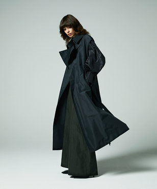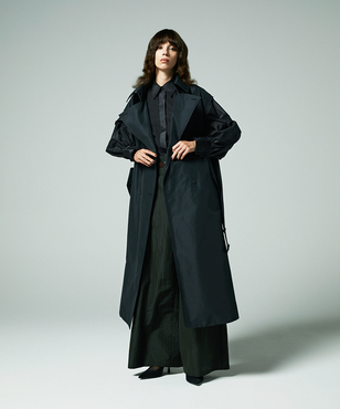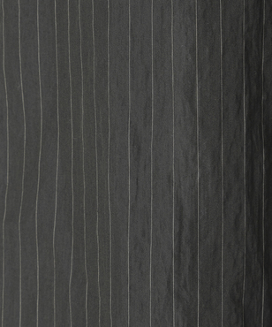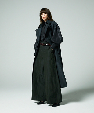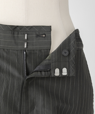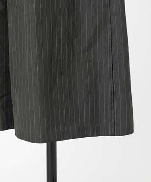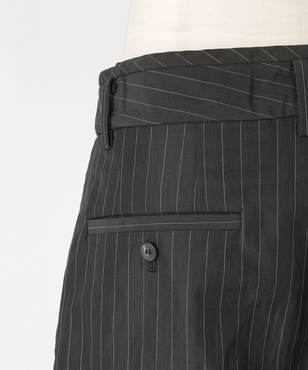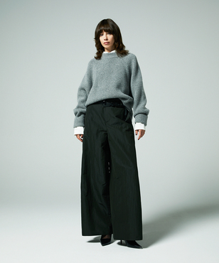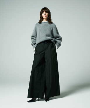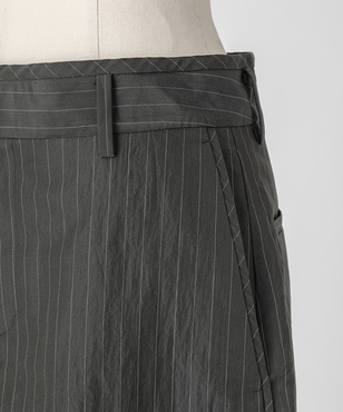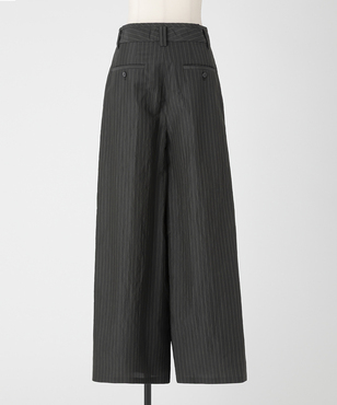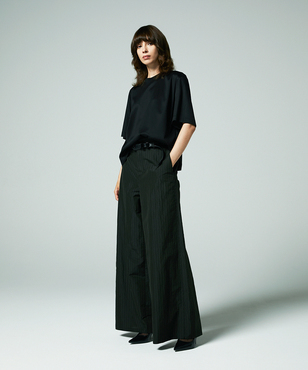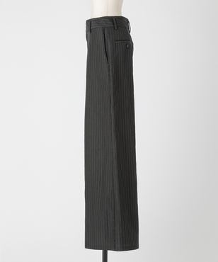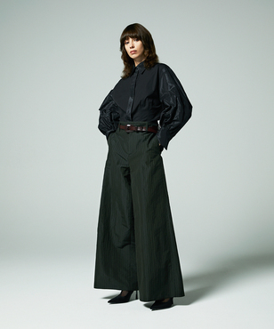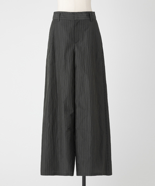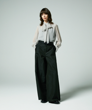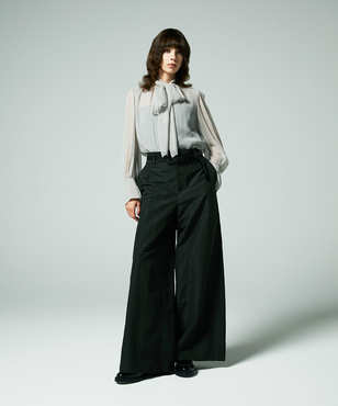腰回りをすっきりと見せたワイドレッグシルエットのパンツ。ストライプをバイアス使いにしたパイピングをアクセントにしています。世界中の有名メゾンにこよなく愛されているイタリアの老舗テキスタイルメーカー製生地。経糸にウール糸、緯糸に撚糸をかけたポリエステル糸で織ることで特殊なドライタッチを生み、時間をゆっくかけた微妙なシワ加工を施すことでラグジュアリーなリラックス感を醸し出した素材です。