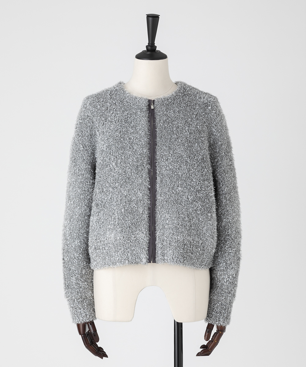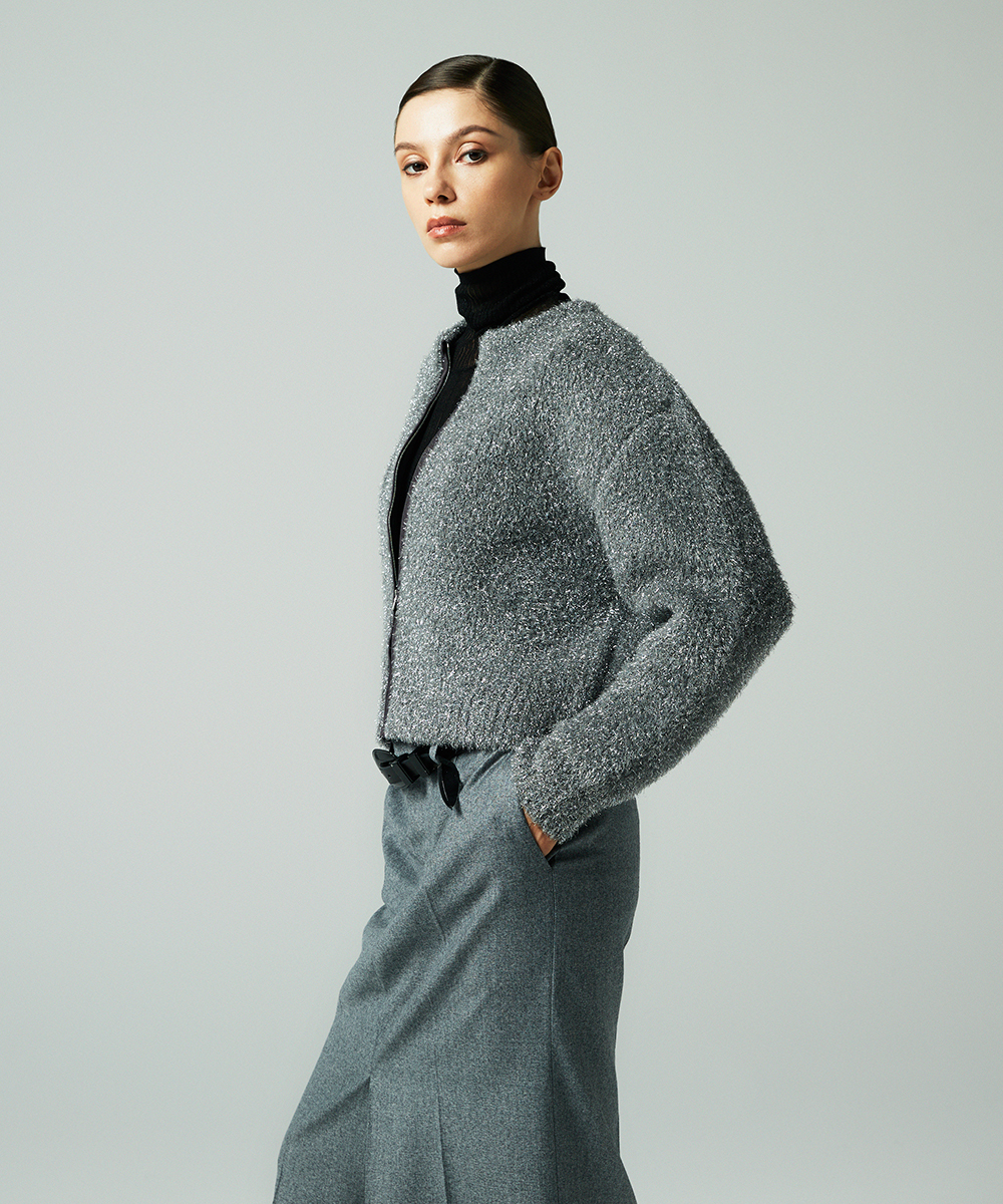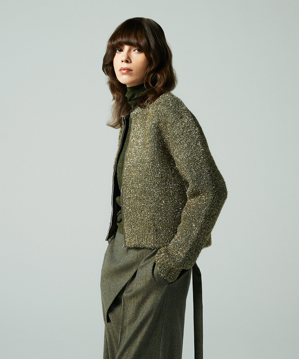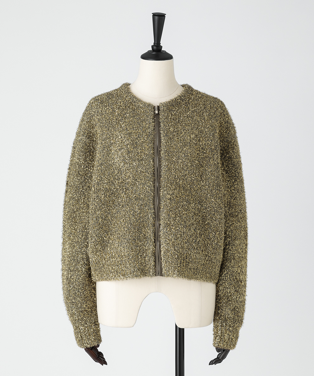 ハリのある素材を裏に編むことで構築的なフォルムに仕立てたフロントジップアップのニットブルゾン。前立てのグログランテープが上品にアクセントになっています。表のラメ糸は通常のラメ糸のチクチク感が無くソフトな質感です。イタリア糸。森林保護のFSC認証を受けたパルプから作られたヴィスコースとラメのポリエステルフィルムをMIXした素材感が特徴的でエレガントなニットです。ポリエステルフィルムは光の反射の角度によって光沢感が変わり、様々な色合いを映し出します。フィルム特有の肌への刺激がなく、ソフトな風合いが特徴です。※FSC認証(ForestStewardship Council認証)とは、森林の管理や加工・流通過程が適切に行われていることを認証する国際的な制度です。森林の生物多様性や地域社会の保護を目的としいます。同素材Vネックベスト〔FGFAD11520〕・ストール〔FG3AD01420〕もご用意いたしております。