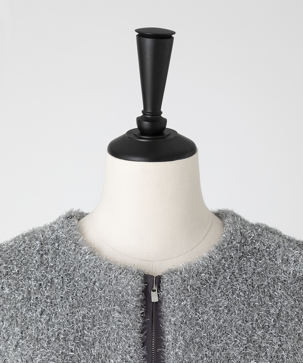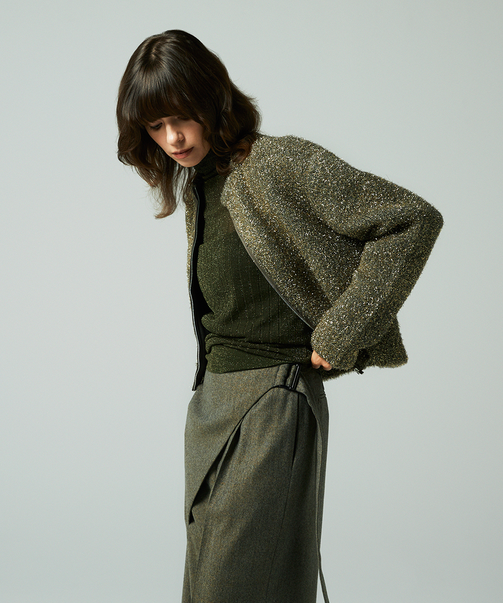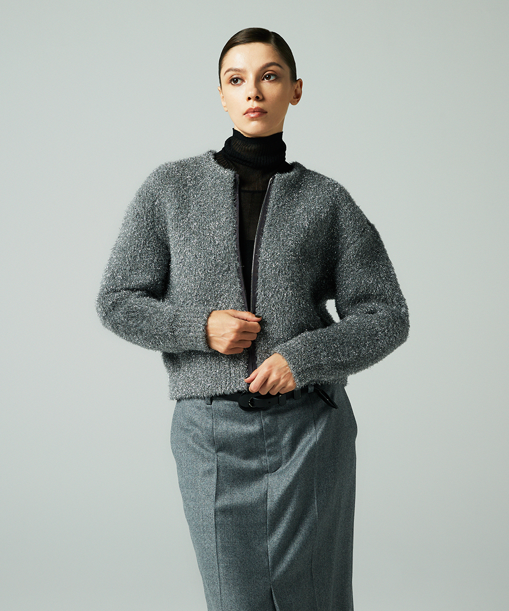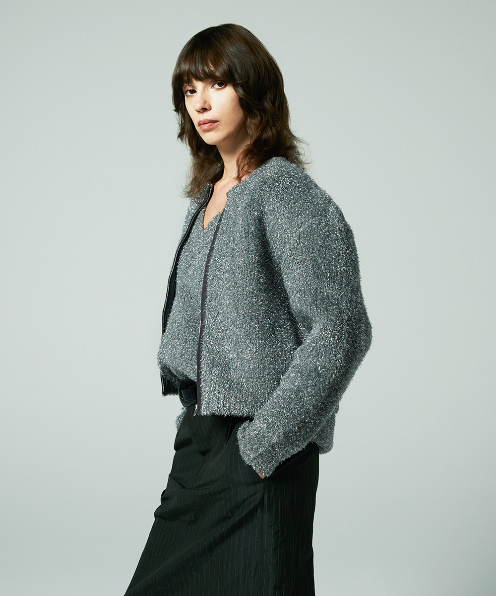 ハリのある素材を裏に編むことで構築的なフォルムに仕立てたフロントジップアップのニットブルゾン。前立てのグログランテープが上品にアクセントになっています。表のラメ糸は通常のラメ糸のチクチク感が無くソフトな質感です。イタリア糸。森林保護のFSC認証を受けたパルプから作られたヴィスコースとラメのポリエステルフィルムをMIXした素材感が特徴的でエレガントなニットです。ポリエステルフィルムは光の反射の角度によって光沢感が変わり、様々な色合いを映し出します。フィルム特有の肌への刺激がなく、ソフトな風合いが特徴です。※FSC認証(ForestStewardship Council認証)とは、森林の管理や加工・流通過程が適切に行われていることを認証する国際的な制度です。森林の生物多様性や地域社会の保護を目的としいます。同素材Vネックベスト〔FGFAD11520〕・ストール〔FG3AD01420〕もご用意いたしております。