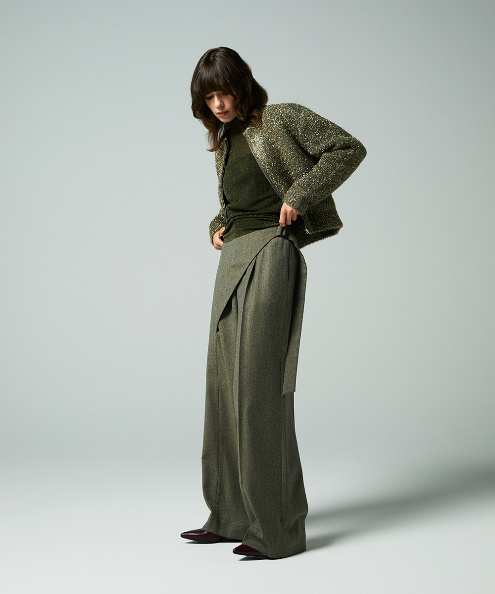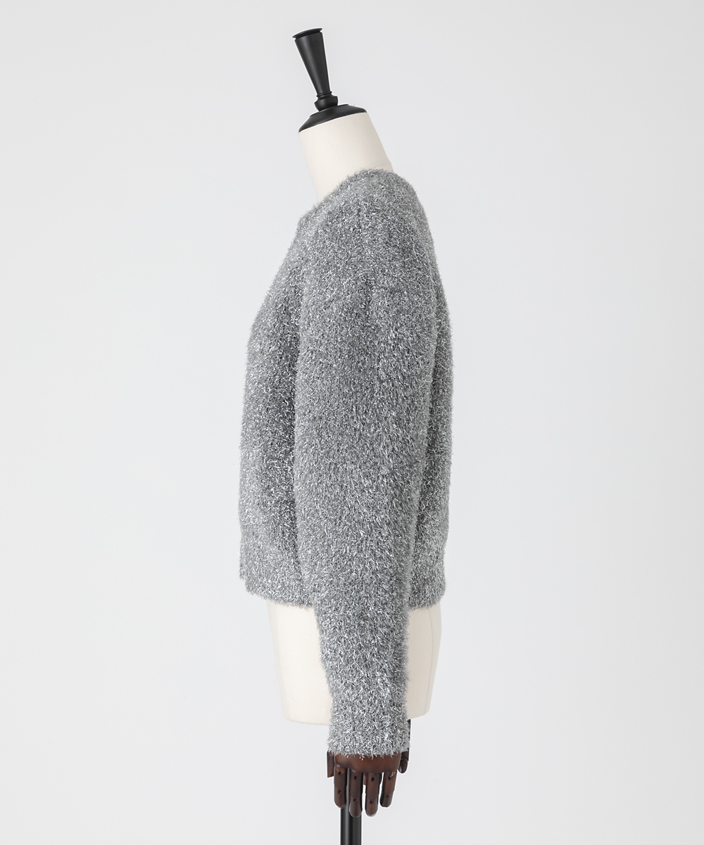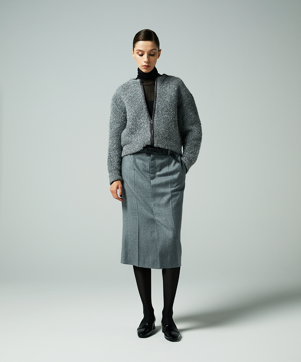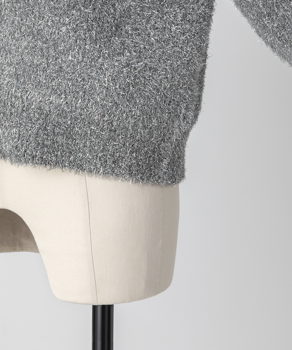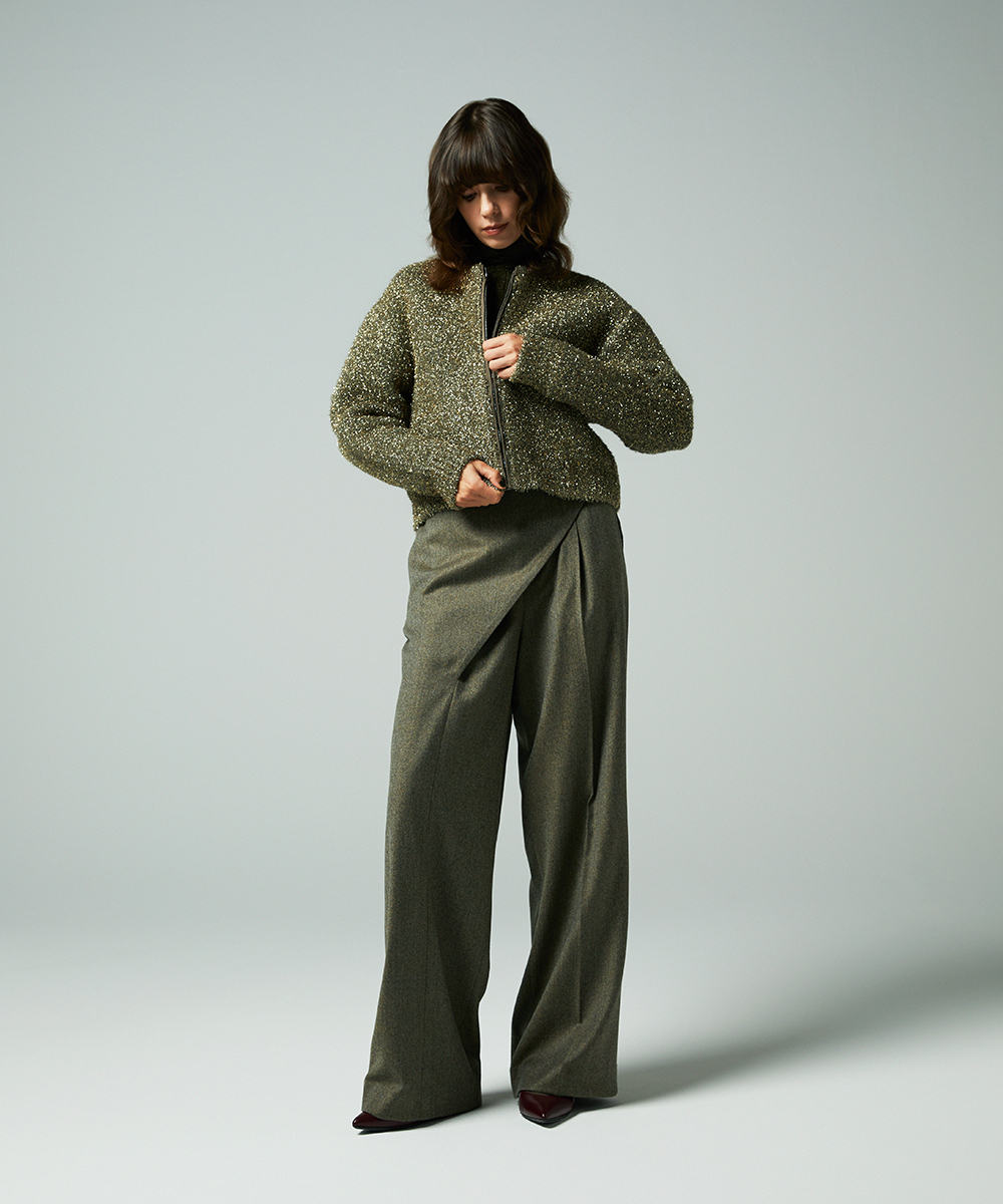 ハリのある素材を裏に編むことで構築的なフォルムに仕立てたフロントジップアップのニットブルゾン。前立てのグログランテープが上品にアクセントになっています。表のラメ糸は通常のラメ糸のチクチク感が無くソフトな質感です。イタリア糸。森林保護のFSC認証を受けたパルプから作られたヴィスコースとラメのポリエステルフィルムをMIXした素材感が特徴的でエレガントなニットです。ポリエステルフィルムは光の反射の角度によって光沢感が変わり、様々な色合いを映し出します。フィルム特有の肌への刺激がなく、ソフトな風合いが特徴です。※FSC認証(ForestStewardship Council認証)とは、森林の管理や加工・流通過程が適切に行われていることを認証する国際的な制度です。森林の生物多様性や地域社会の保護を目的としいます。同素材Vネックベスト〔FGFAD11520〕・ストール〔FG3AD01420〕もご用意いたしております。