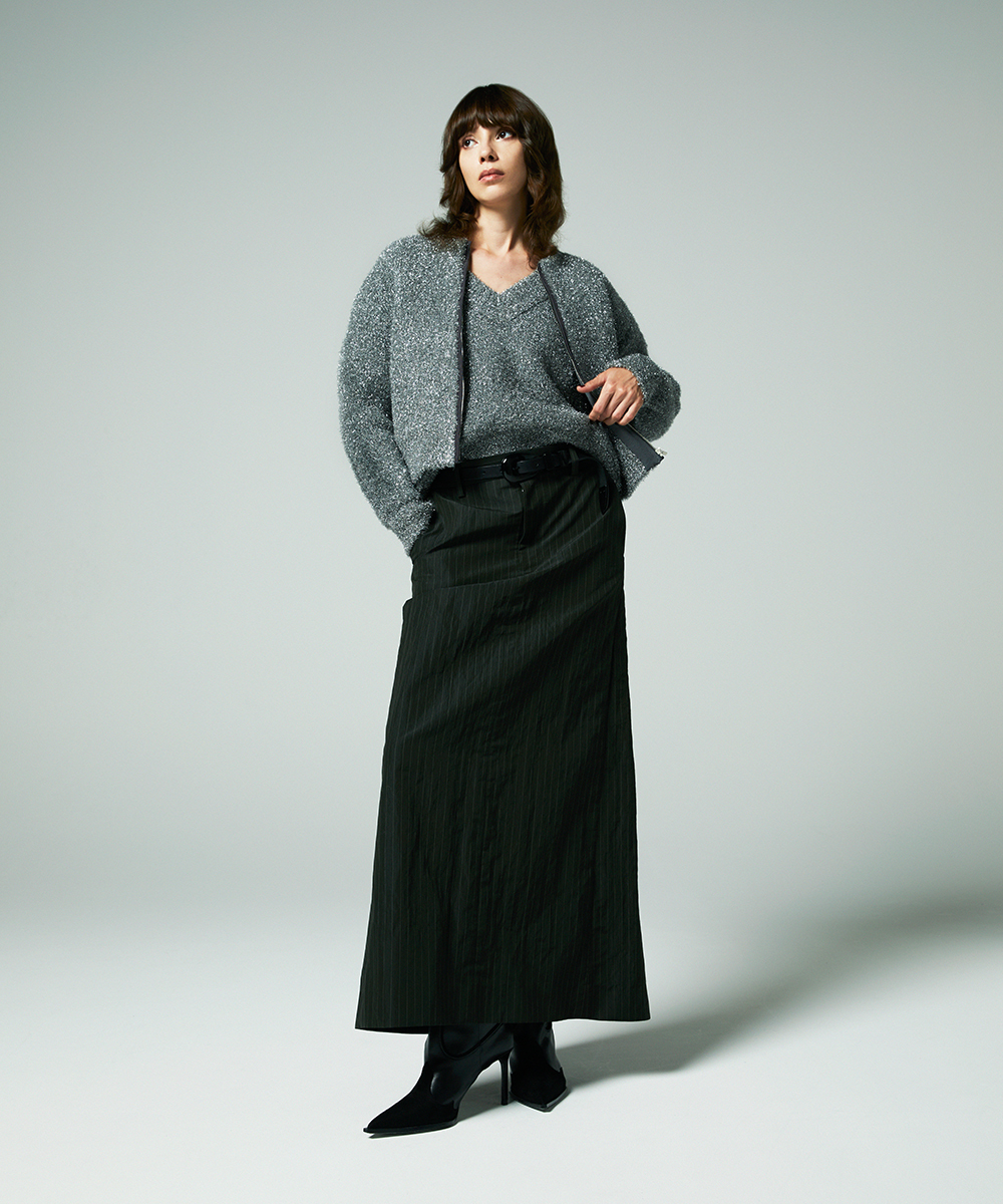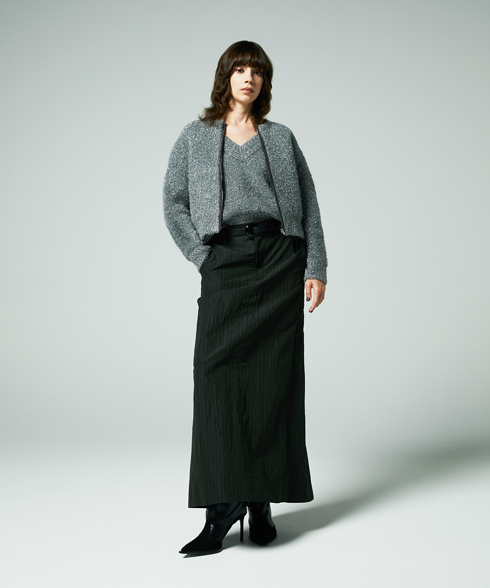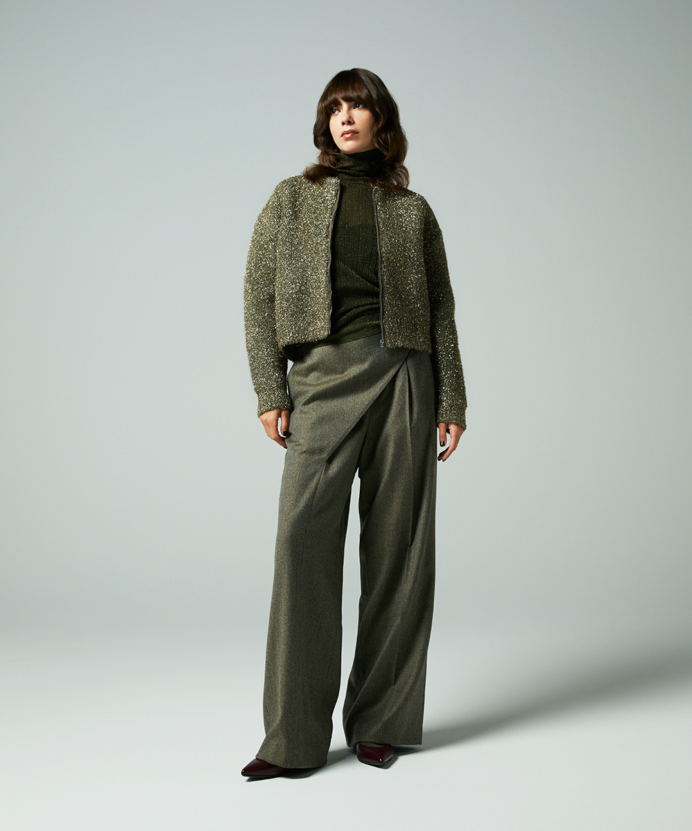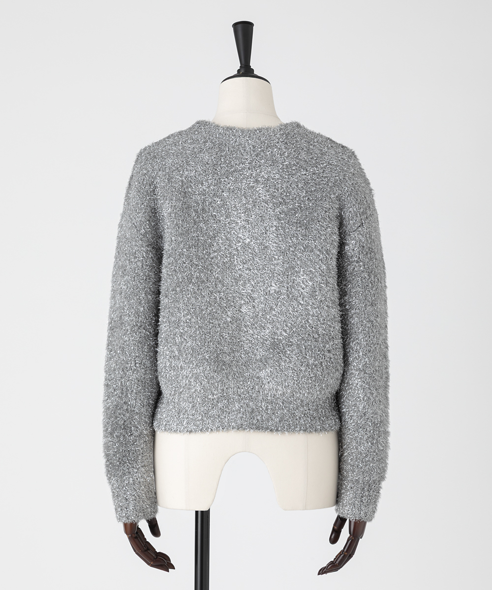 ハリのある素材を裏に編むことで構築的なフォルムに仕立てたフロントジップアップのニットブルゾン。前立てのグログランテープが上品にアクセントになっています。表のラメ糸は通常のラメ糸のチクチク感が無くソフトな質感です。イタリア糸。森林保護のFSC認証を受けたパルプから作られたヴィスコースとラメのポリエステルフィルムをMIXした素材感が特徴的でエレガントなニットです。ポリエステルフィルムは光の反射の角度によって光沢感が変わり、様々な色合いを映し出します。フィルム特有の肌への刺激がなく、ソフトな風合いが特徴です。※FSC認証(ForestStewardship Council認証)とは、森林の管理や加工・流通過程が適切に行われていることを認証する国際的な制度です。森林の生物多様性や地域社会の保護を目的としいます。同素材Vネックベスト〔FGFAD11520〕・ストール〔FG3AD01420〕もご用意いたしております。