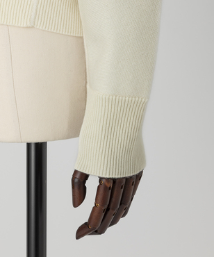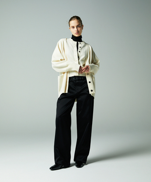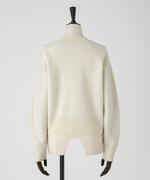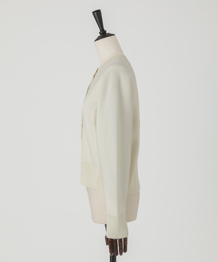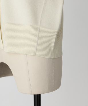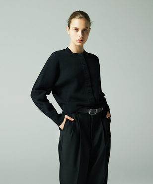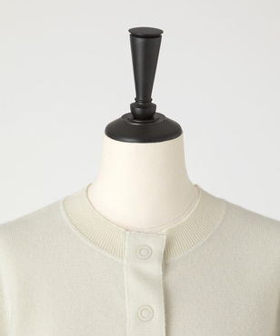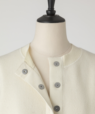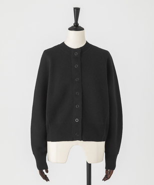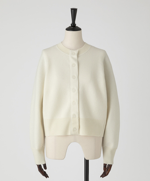 肩にシームがなく丸味を帯びたショルダーラインが特徴的なクロップドカーディガン。前立てのメタルリングドットは同色に塗装しており、上品な艶がアクセントになっています。17.5マイクロンという非常に細いウールの原料を使用し、カシミヤをブレンドしたソフトな紡毛糸を使用。ミラノリブ編みで膨らみと弾力性があります。同素材Vネックカーディガン〔FGSAD06720〕・ワイドプルオーバー〔FGFAD13630〕もご用意いたしております。