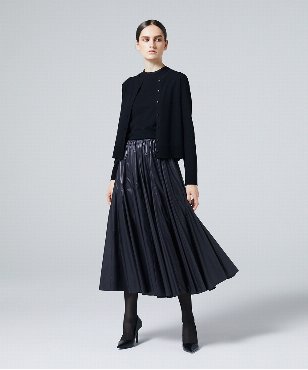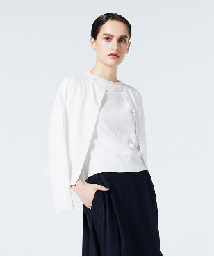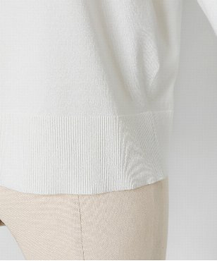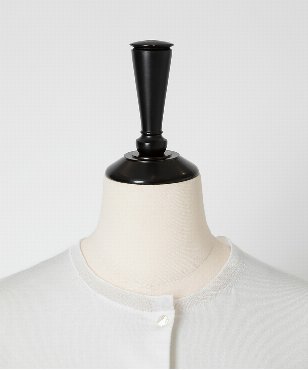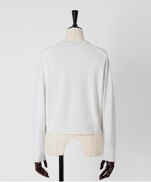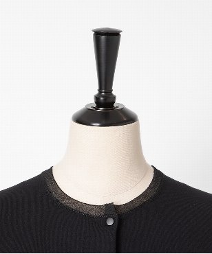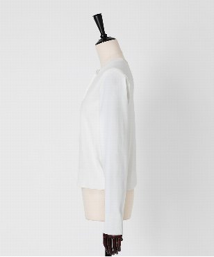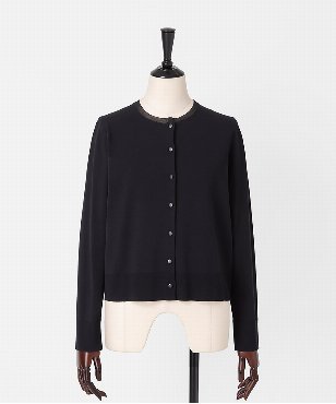 衿元のシアー素材がアクセントになったクルーネックカーディガン。立体的なカッティングによる着心地良く美しいシルエット。幅広くコーディネートに活躍する汎用性の高いミニマルなデザインです。優しい風合いと美しい発色が特徴の上質なヴィスコースを、ストレッチ性のあるポリエステルと掛け合わせ、イタリアで紡績した糸を使用しています。きめの整った肌触りの良い素材に編み上げています。軽量で伸縮性がありシーズンレスに使用していただける万能なニット素材です。同素材シアー付属付きプルオーバーFGFDV02350とコーディネート対応可能。