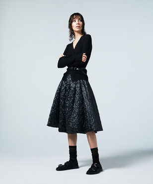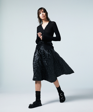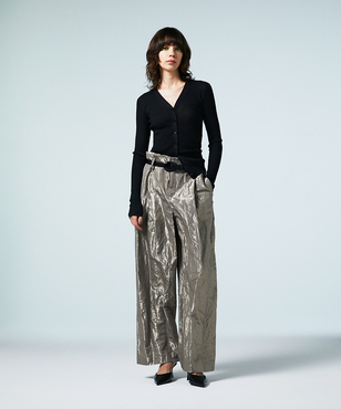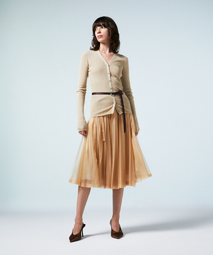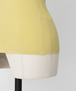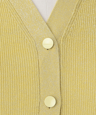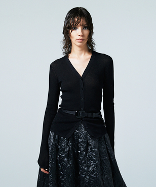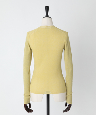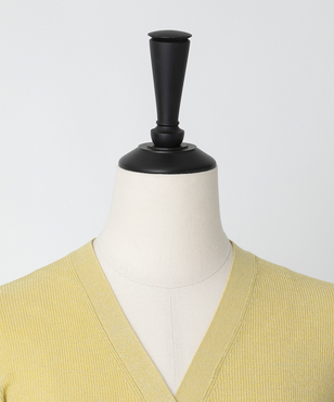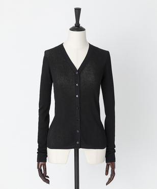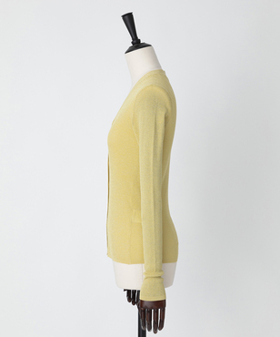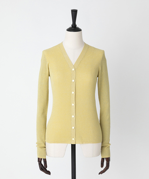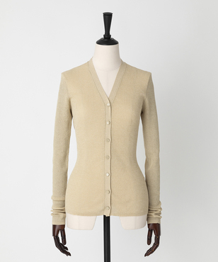 透け感のあるソフトなテンションのリブ編みのVネックカーディガンです。立体的なカッティングにより体のラインにフィットする縦長効果のあるタイトシルエットに仕立てています。環境保護に配慮した上質なオーガニックコットンに極細のラメ糸を掛け合わせたイタリア紡績糸を使用しています。非常に軽く、肌触りの良い素材です。