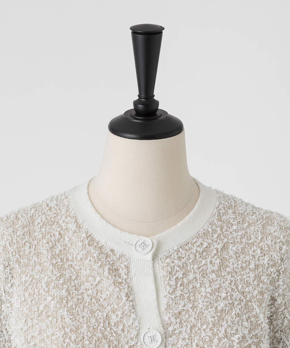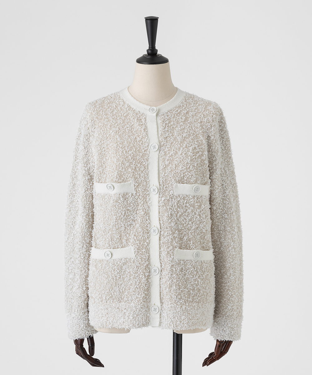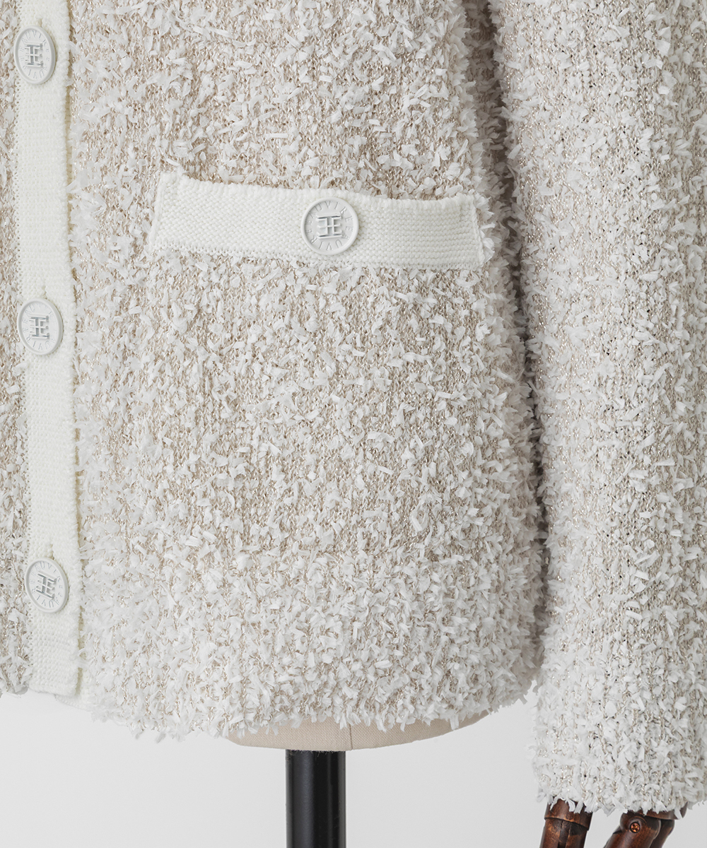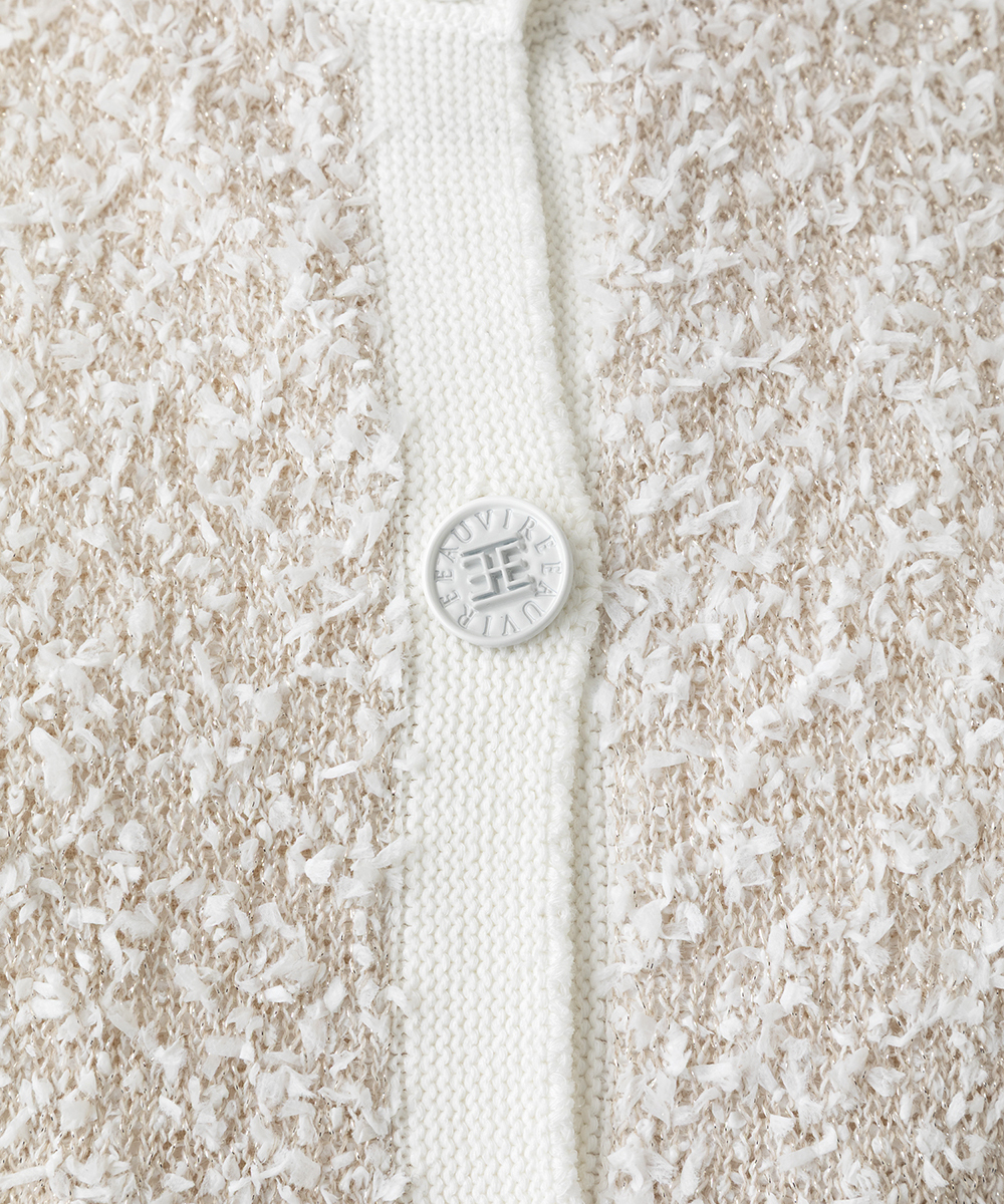 ジャケットディティールのカーディガン。ニットなのでジャケットよりも楽な着心地です。オーヴィルオリジナルコインボタンを施し華やかさを出しています。カジュアルボトムに合わせてエレガントなスタイリングを提案します。日本製糸を使用。ナイロンの不織布を細かくカットし、芯糸で挟み込んで作ったペーパーヤーンに極細ラメ糸を2色ひきそろえて編んだミックス編み地です。ふんわりとした立体感が特徴で、2色のラメ糸が上品な光沢を出しています。同素材ミニトートバッグと[FG5GD03480]とあわせてスタイリングも可能です。