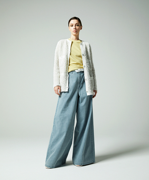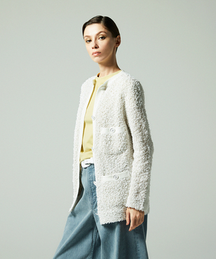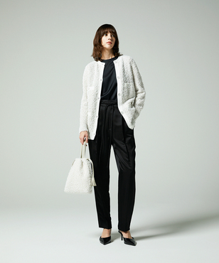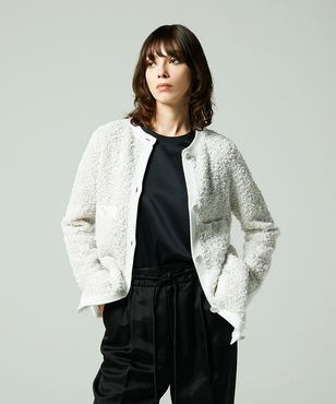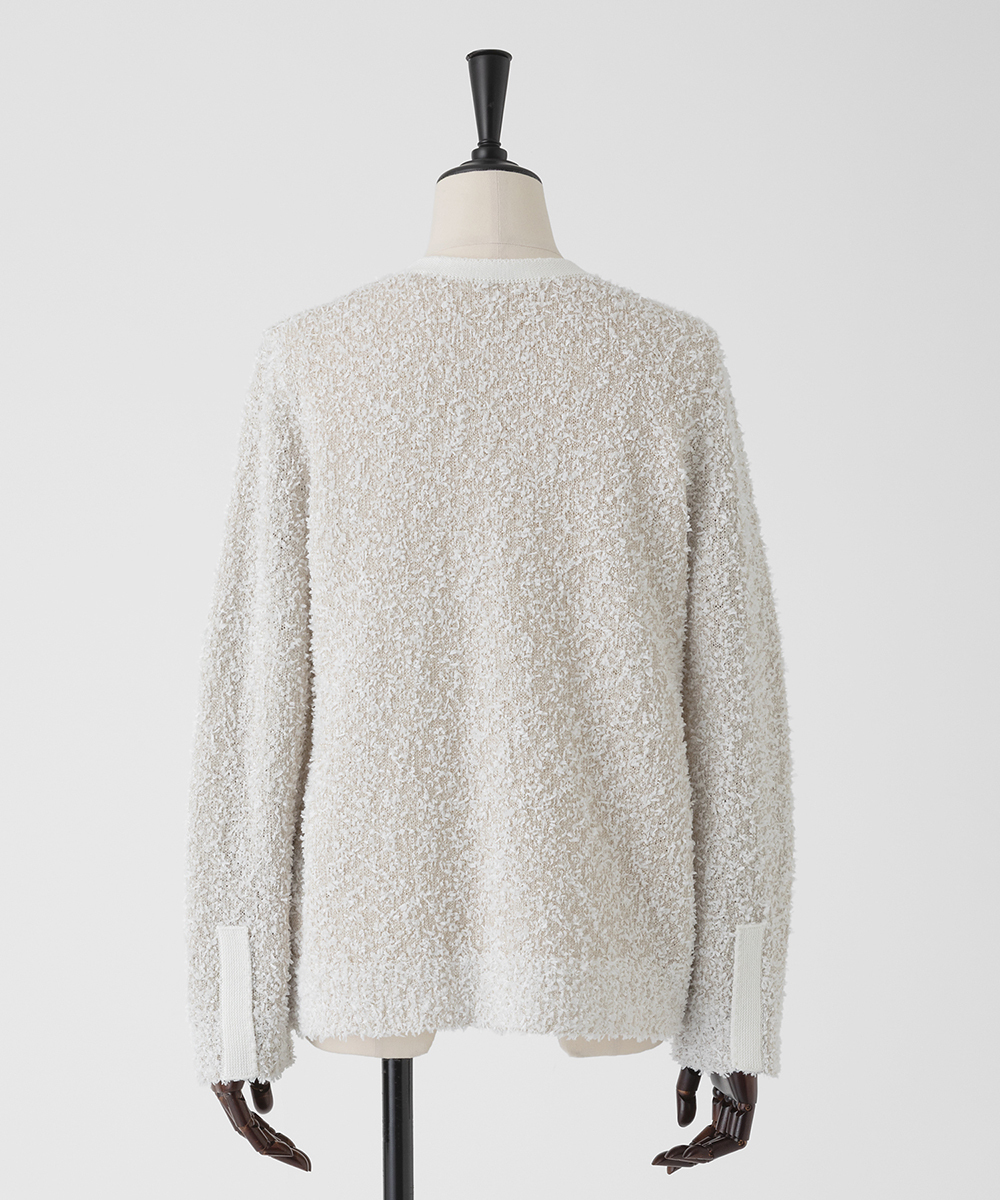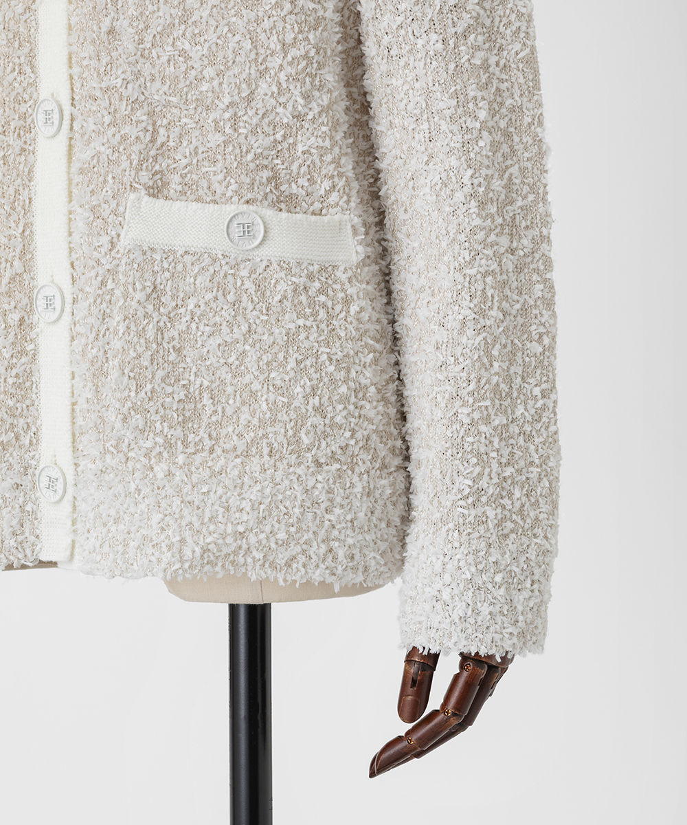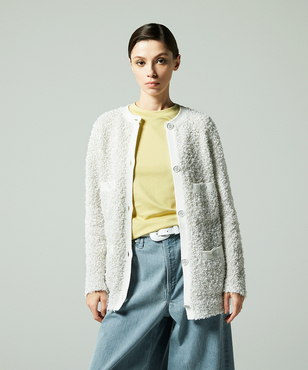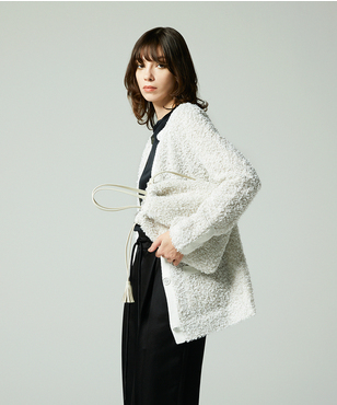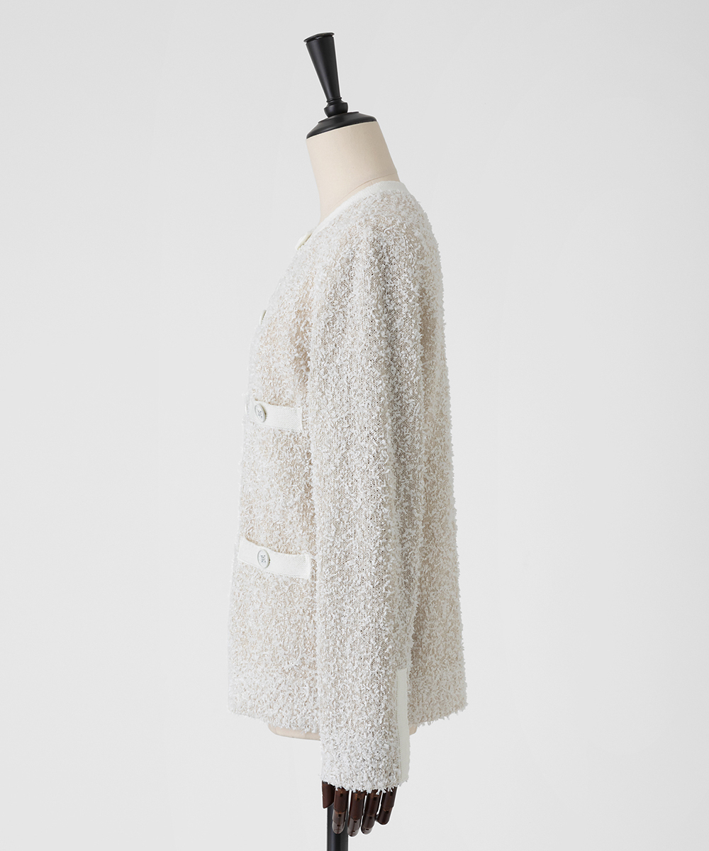 ジャケットディティールのカーディガン。ニットなのでジャケットよりも楽な着心地です。オーヴィルオリジナルコインボタンを施し華やかさを出しています。カジュアルボトムに合わせてエレガントなスタイリングを提案します。日本製糸を使用。ナイロンの不織布を細かくカットし、芯糸で挟み込んで作ったペーパーヤーンに極細ラメ糸を2色ひきそろえて編んだミックス編み地です。ふんわりとした立体感が特徴で、2色のラメ糸が上品な光沢を出しています。同素材ミニトートバッグと[FG5GD03480]とあわせてスタイリングも可能です。