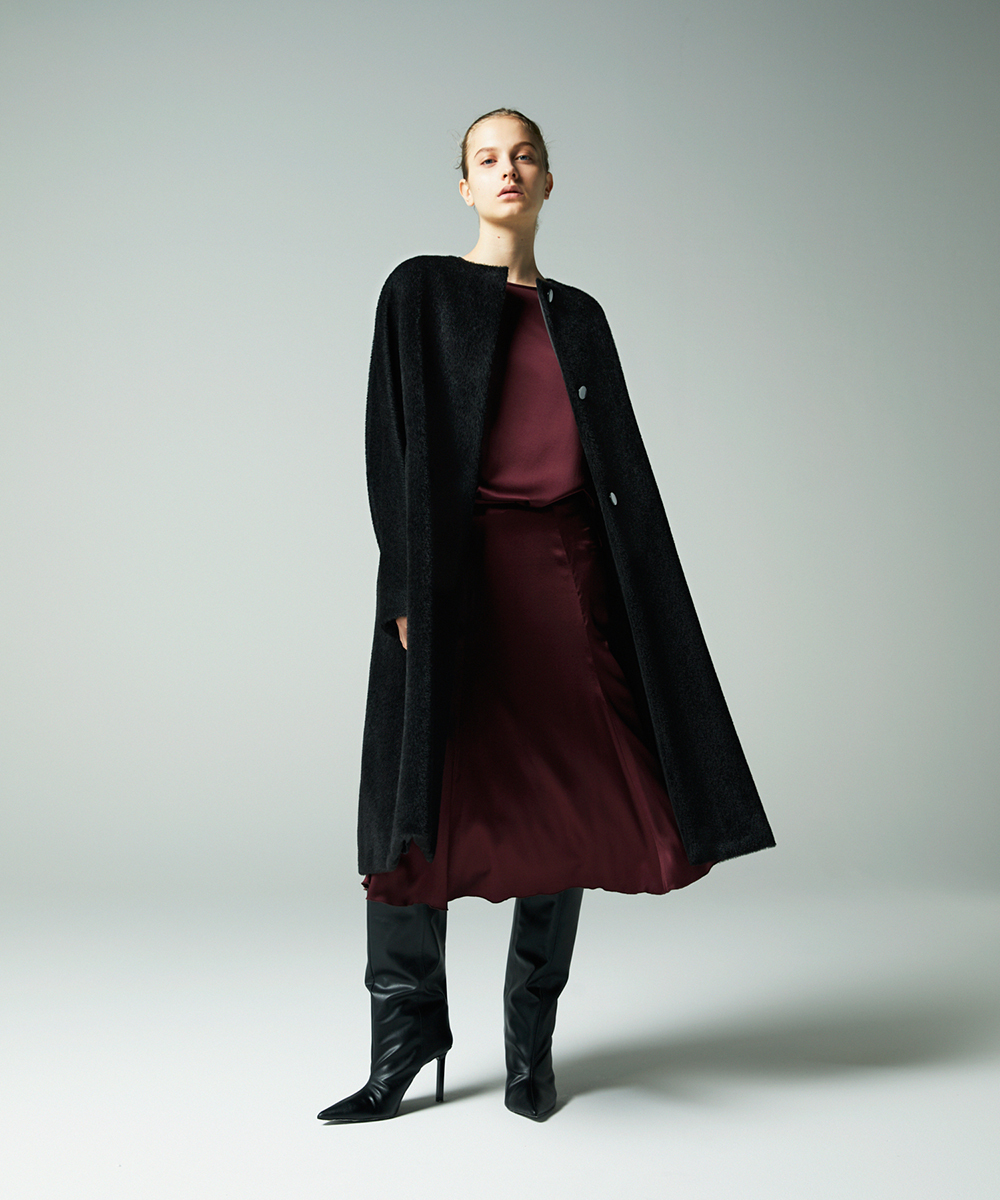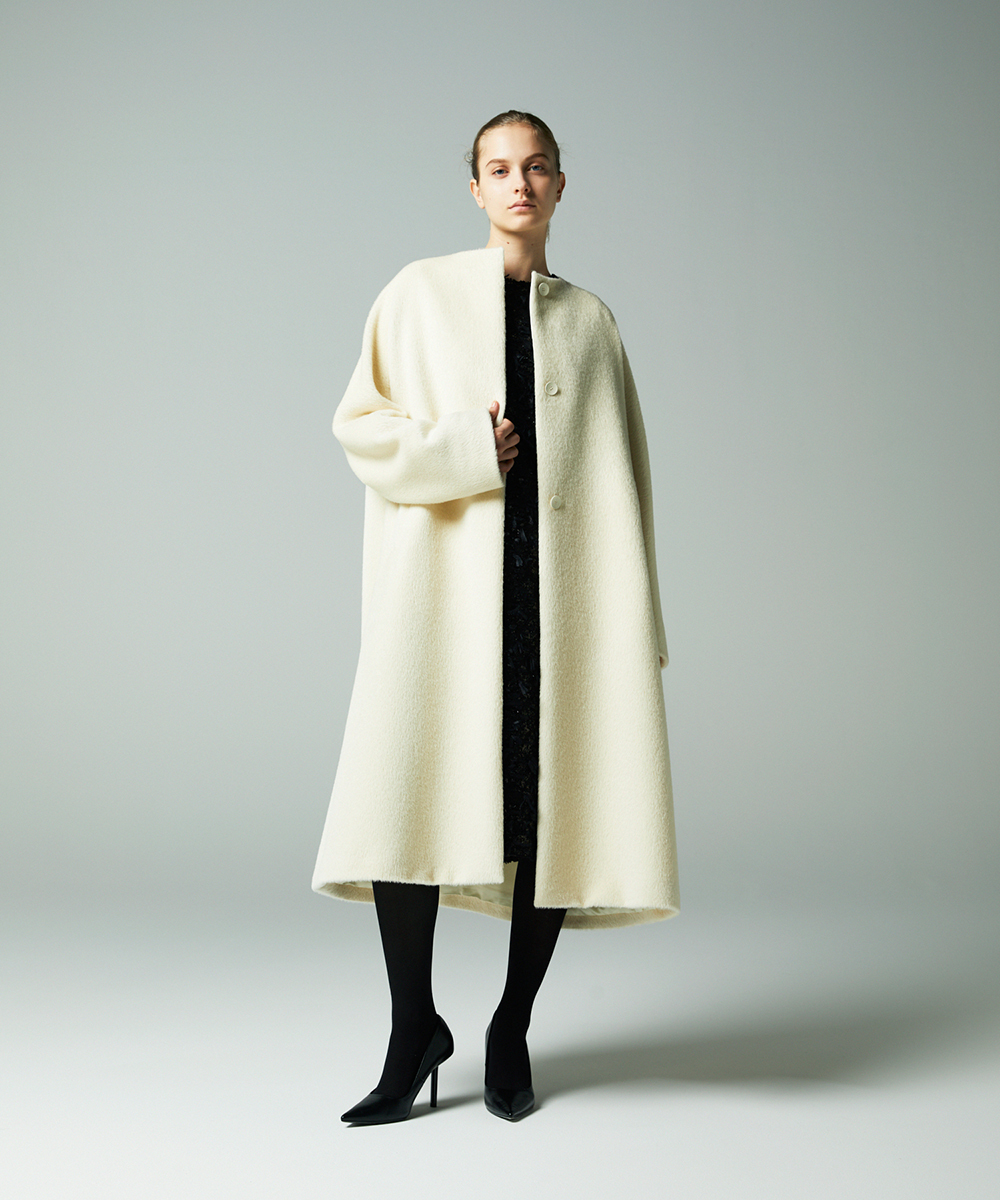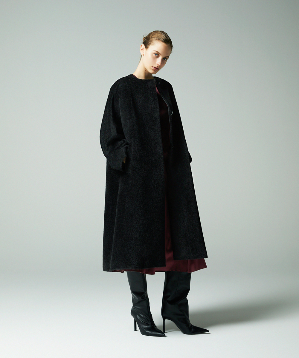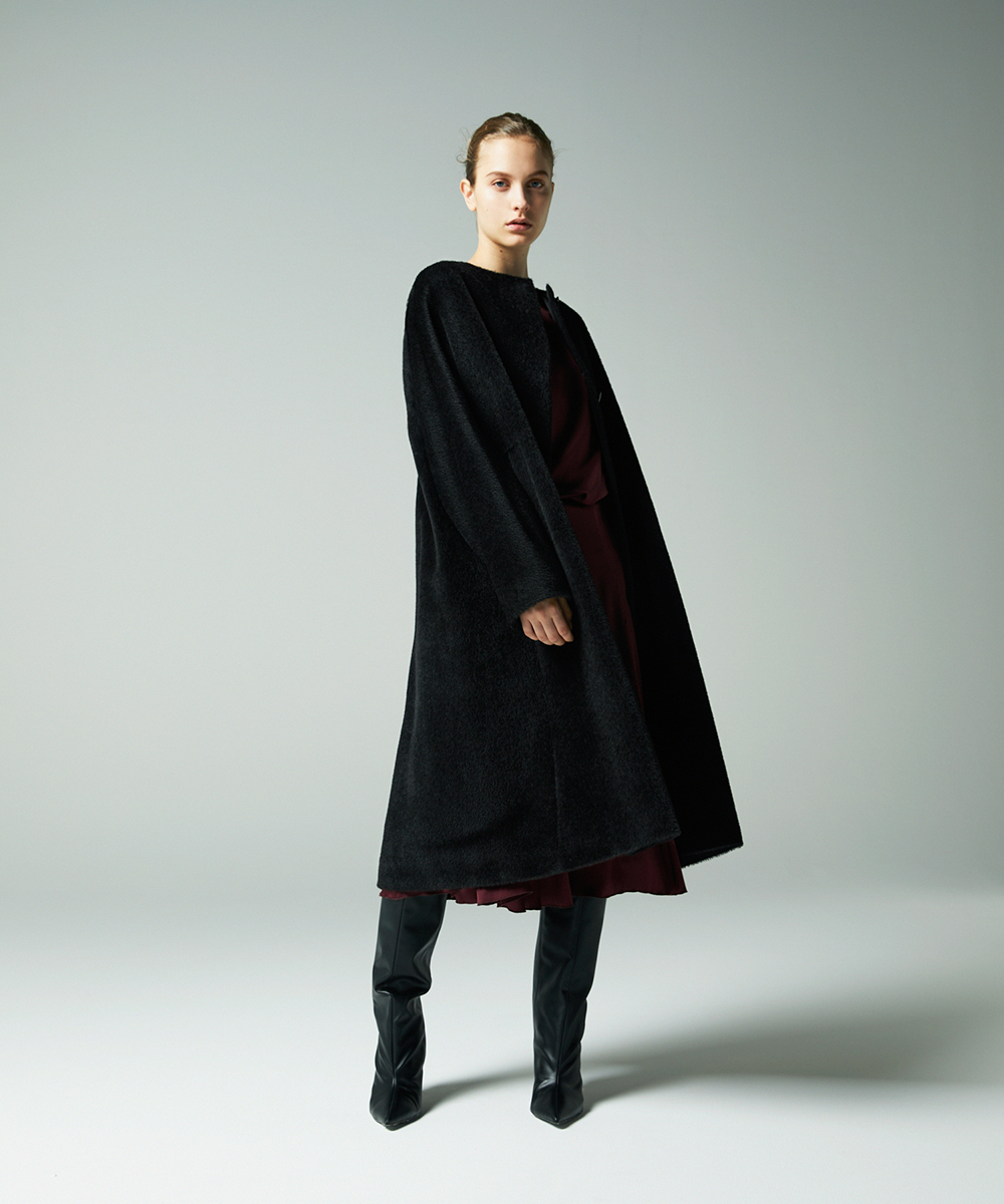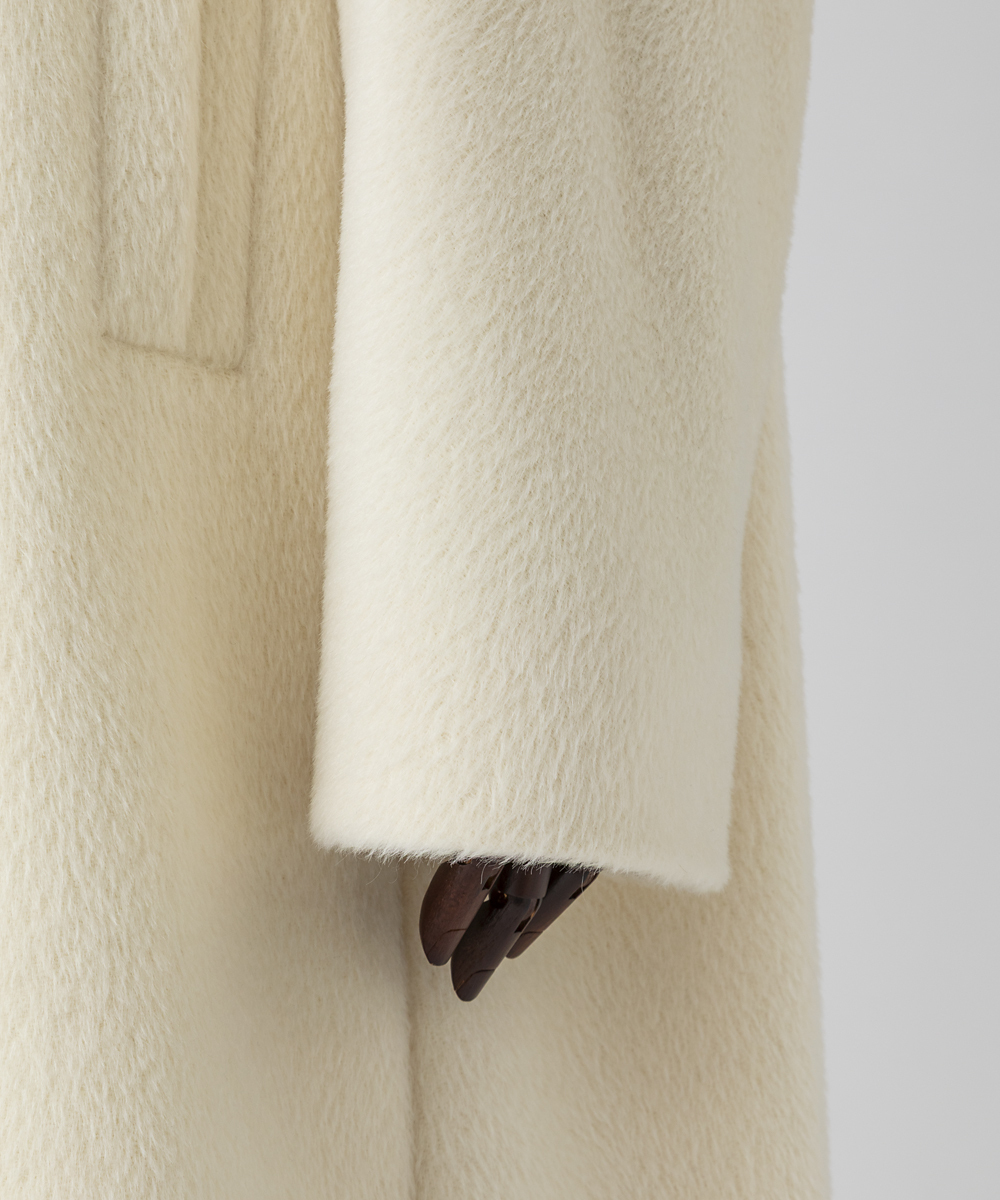 2024FWシーズン好評だったコートをよりラグジュアリーにブラッシュアップさせました。身頃から続くやわらかでボリュームのある袖、特徴のあるポケットがアクセントになったコートはどんなアイテムともなじみ、スタイリングを格上げしてくれます。イタリア製、最高品質のスーリーアルパカコート素材。細く柔らかい毛足が特徴の希少なスーリーアルパカを贅沢に使用しつつ、バージンウールとミックスさせることで美しい光沢を持つシャギーのコート地に仕上がっています。