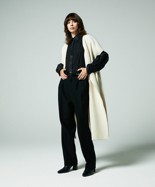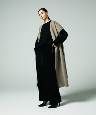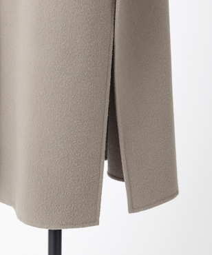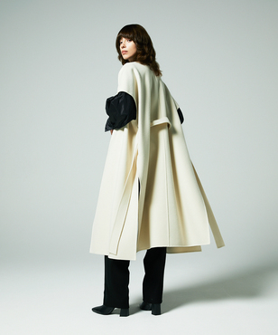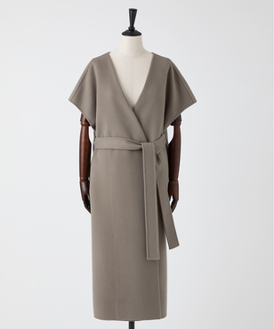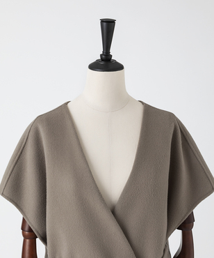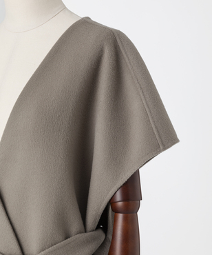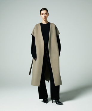 ゆったりとリラクシーなシルエットの一重仕立てのノースリーブコート。後ろ身頃の玉縁スリットに共地のベルトを通すデザイン。両脇の深めのベンツは程よい抜け感を生み出します。シャツやニットなど合わせるものによって長い期間着用できるアイテムです。カシミヤと同等以上の繊度の細いSuper180'sウール糸を使用して織られた接結二重織素材。非常に繊細な糸を織り上げ、軽いミルド加工を行った後、短く刈り揃えることにより産毛のようなパウダータッチに仕上げています。25FWシーズンは従来よりも表面の抑えを強めにすることで光沢も増し、より表面品位を高めています。日本製生地。※こちらの商品はラッピング不可アイテムです