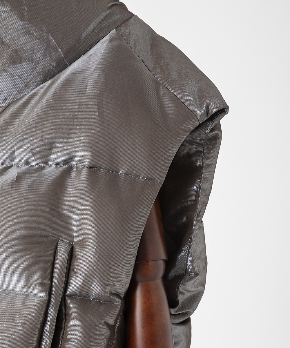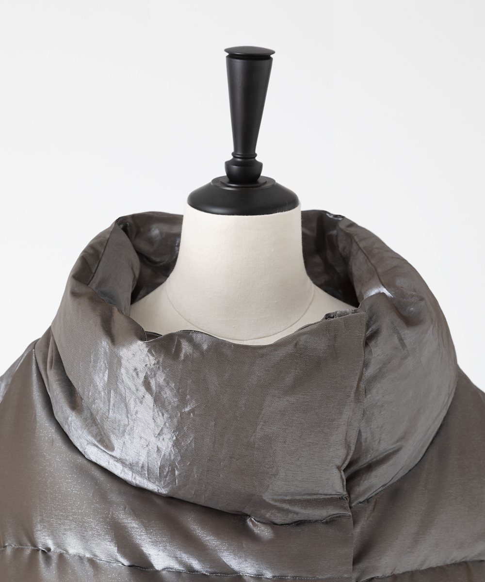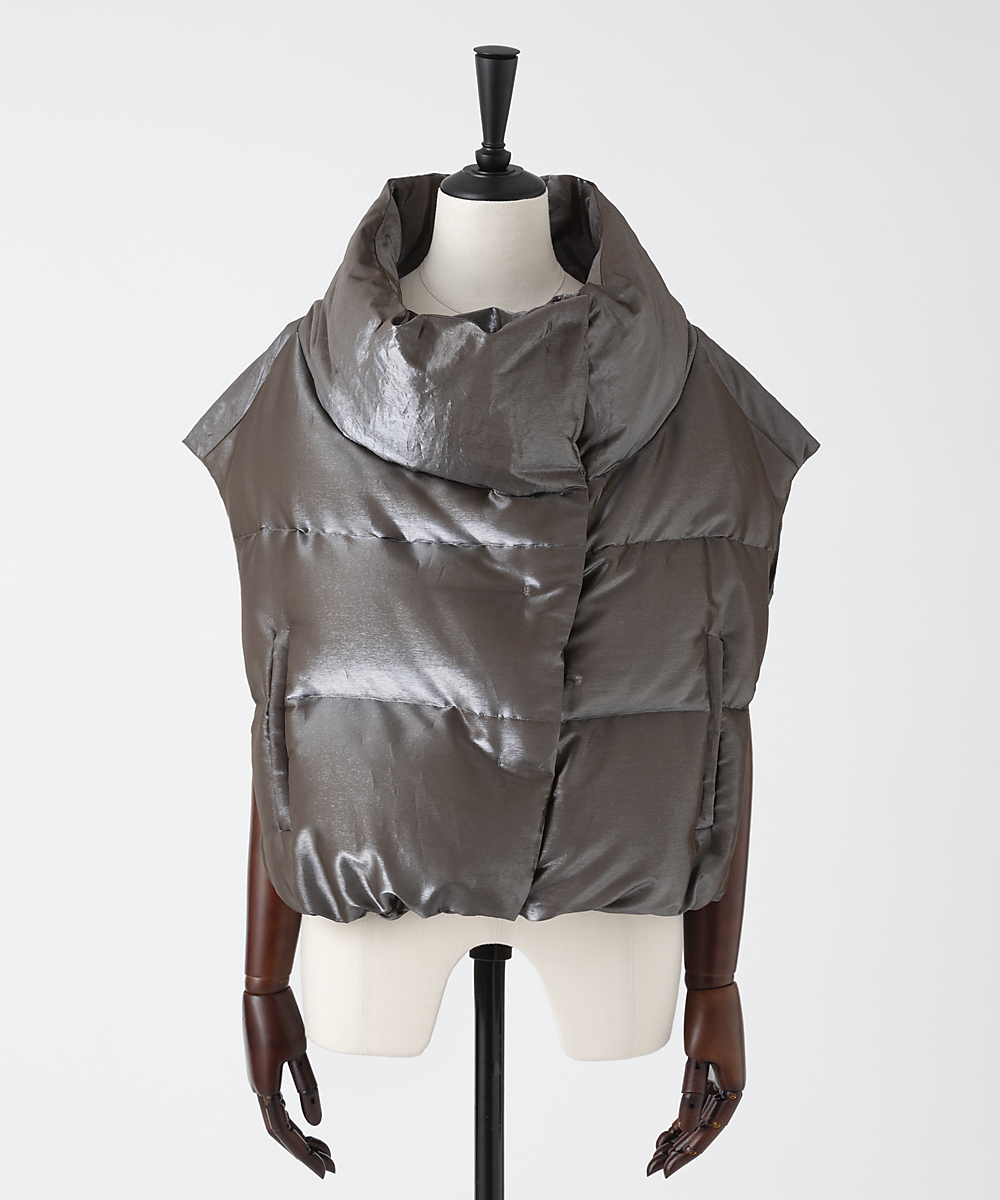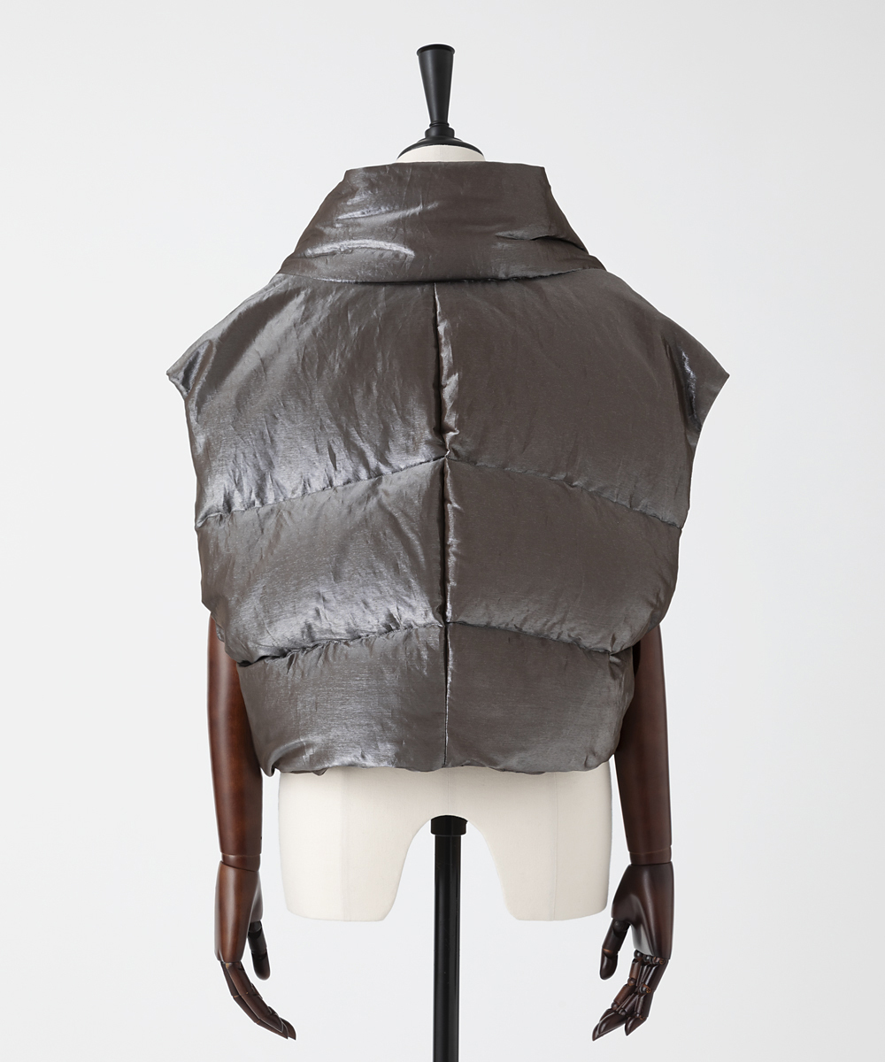 スタンドカラーのクロップト丈ダウンジレ。立体感のあるシェイプが特徴でストールのように使用でき、スタイリングにアクセントをプラスしてくれるアイテム。カジュアルイメージだけでなくドレスと合わせたスタイリングもおすすめ。イタリア製素材。高級シルク・ジャガードの産地であるコモの老舗テキスタイルメーカーの生地を使用。緯糸に光沢のある繊細なポリエステル糸を織り込むことで、上品なメタリック感をもつごく軽い生地に仕上がっています。仕上げにタンブラー加工をすることで贅沢なカジュアル感をプラス。同素材スカート〔FGHAD13860〕もご用意いたしております。