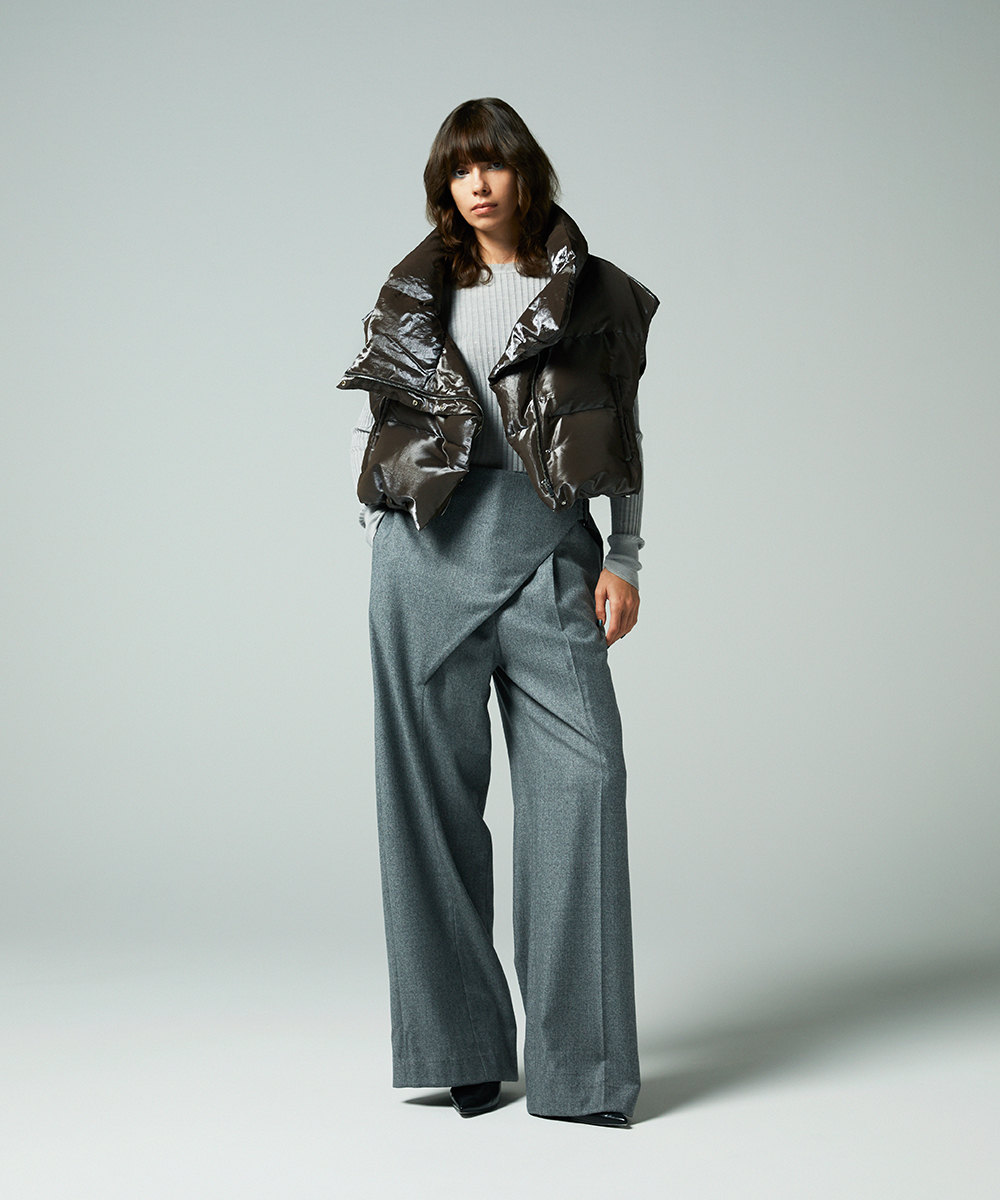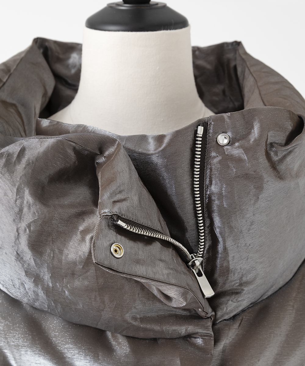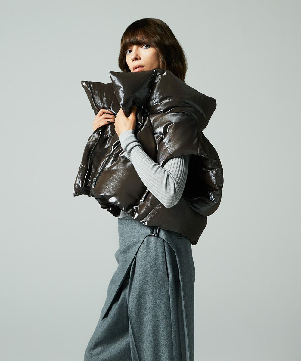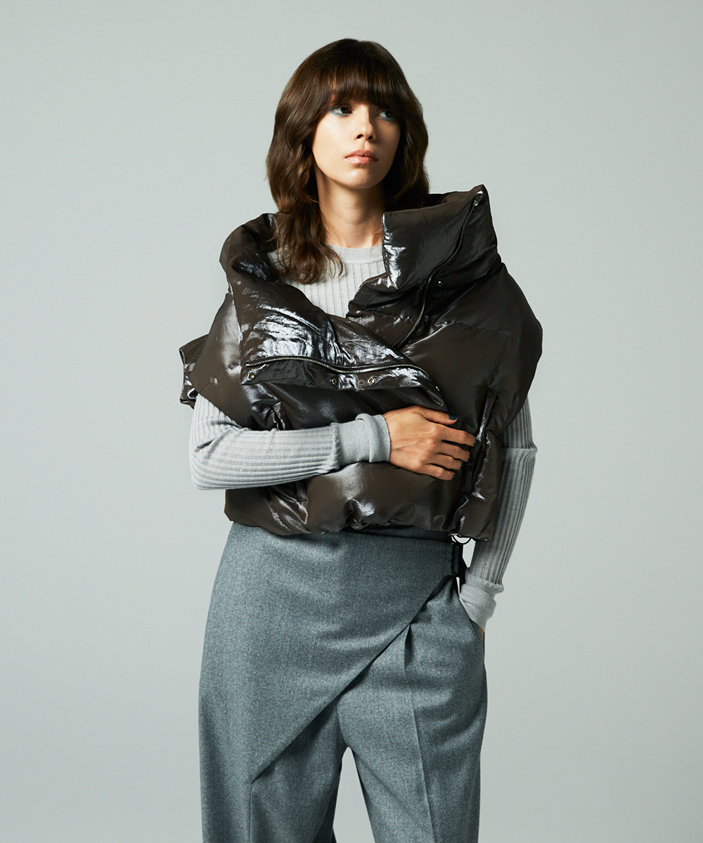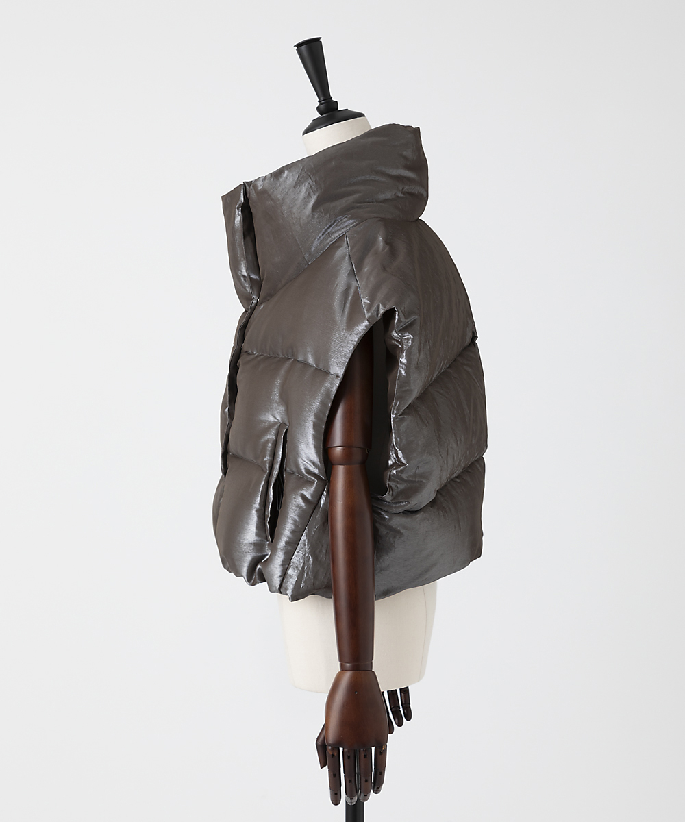 スタンドカラーのクロップト丈ダウンジレ。立体感のあるシェイプが特徴でストールのように使用でき、スタイリングにアクセントをプラスしてくれるアイテム。カジュアルイメージだけでなくドレスと合わせたスタイリングもおすすめ。イタリア製素材。高級シルク・ジャガードの産地であるコモの老舗テキスタイルメーカーの生地を使用。緯糸に光沢のある繊細なポリエステル糸を織り込むことで、上品なメタリック感をもつごく軽い生地に仕上がっています。仕上げにタンブラー加工をすることで贅沢なカジュアル感をプラス。同素材スカート〔FGHAD13860〕もご用意いたしております。