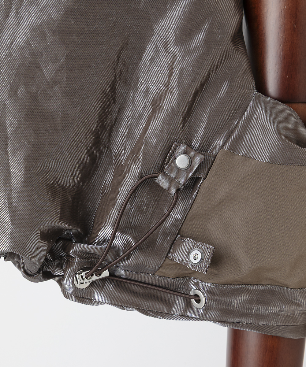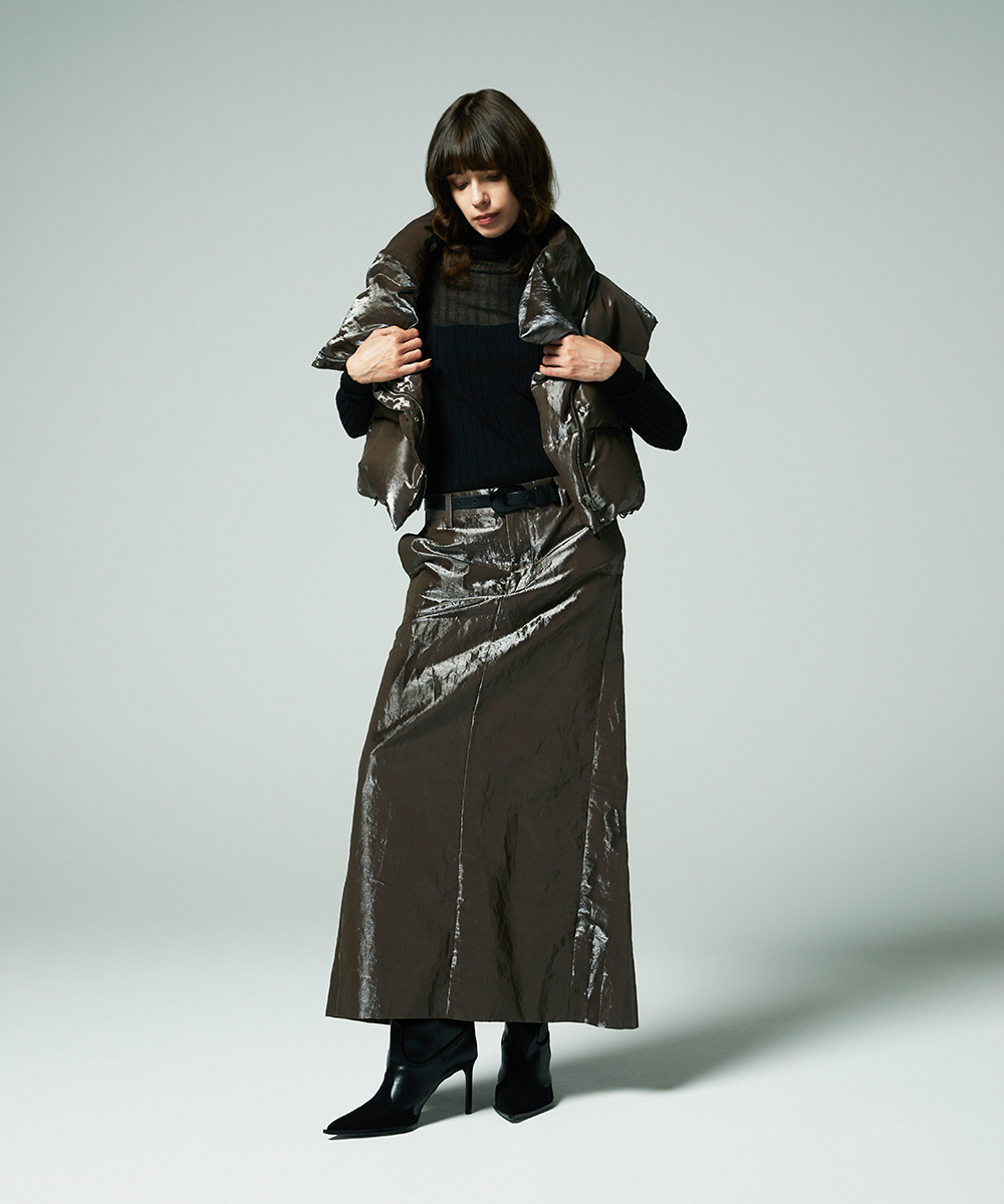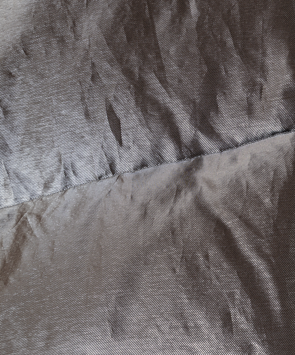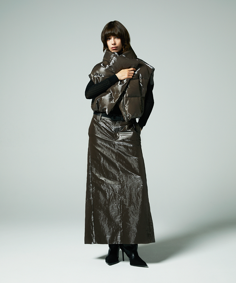 スタンドカラーのクロップト丈ダウンジレ。立体感のあるシェイプが特徴でストールのように使用でき、スタイリングにアクセントをプラスしてくれるアイテム。カジュアルイメージだけでなくドレスと合わせたスタイリングもおすすめ。イタリア製素材。高級シルク・ジャガードの産地であるコモの老舗テキスタイルメーカーの生地を使用。緯糸に光沢のある繊細なポリエステル糸を織り込むことで、上品なメタリック感をもつごく軽い生地に仕上がっています。仕上げにタンブラー加工をすることで贅沢なカジュアル感をプラス。同素材スカート〔FGHAD13860〕もご用意いたしております。